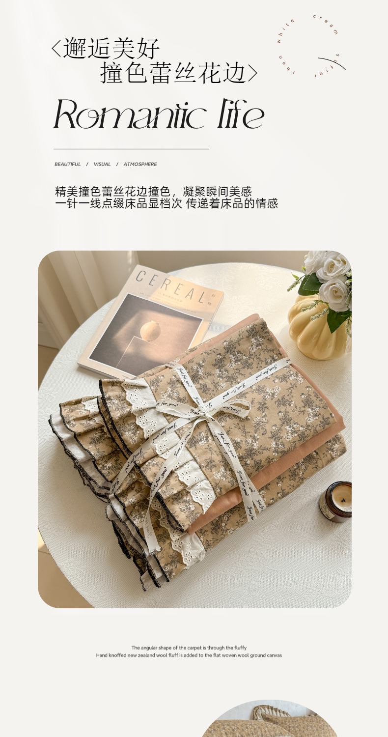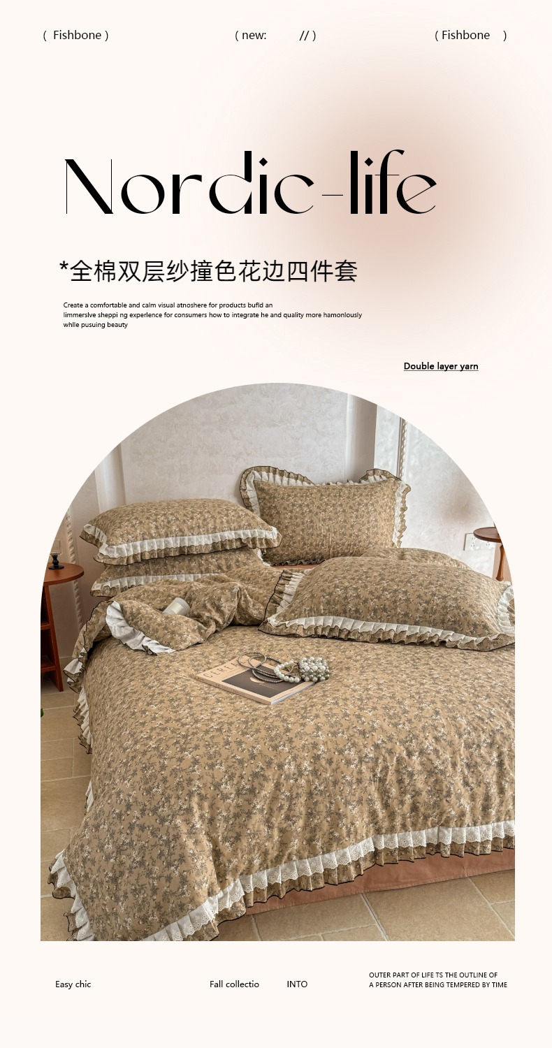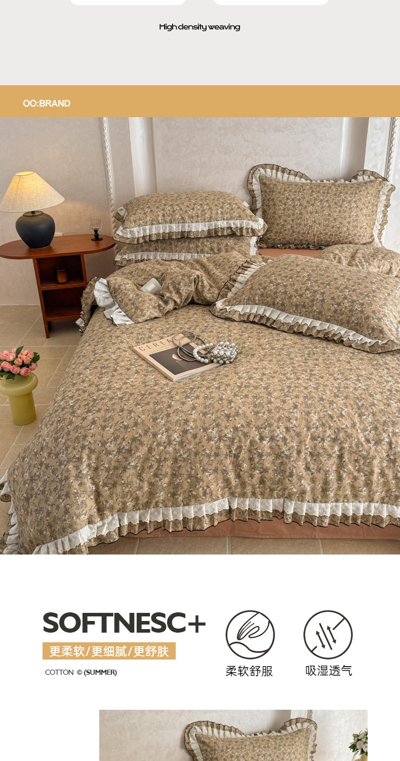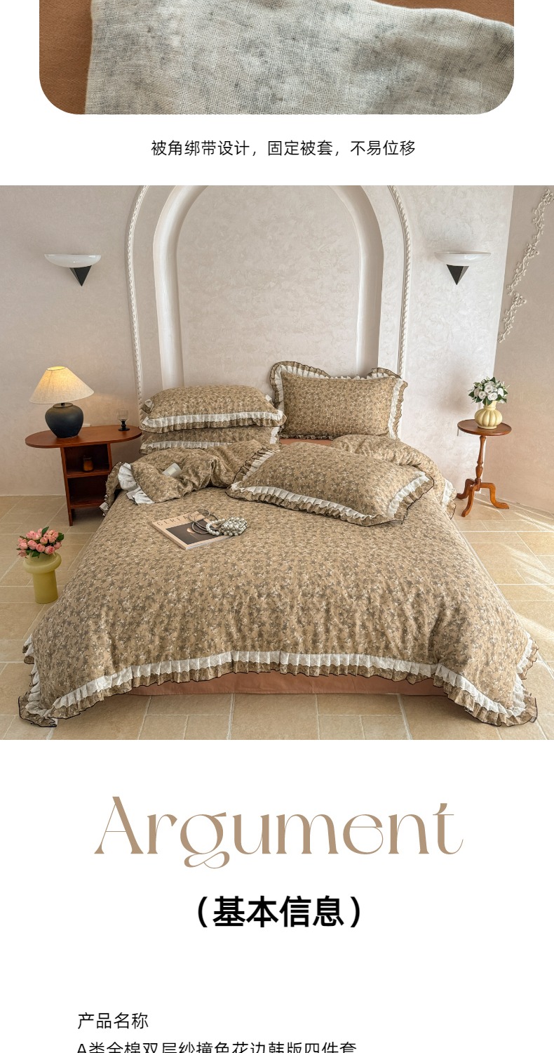 商品名称:简宜家居(朝初家纺) 2025新款40s全棉纯棉双层纱撞色蕾丝花边四件套 焦糖舒梦