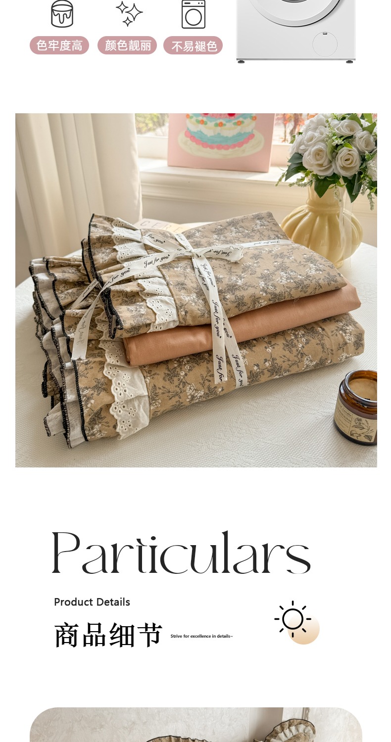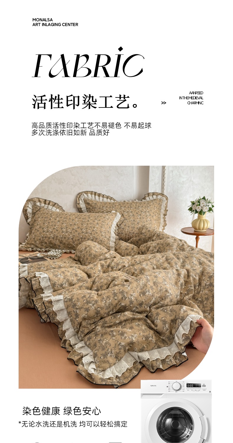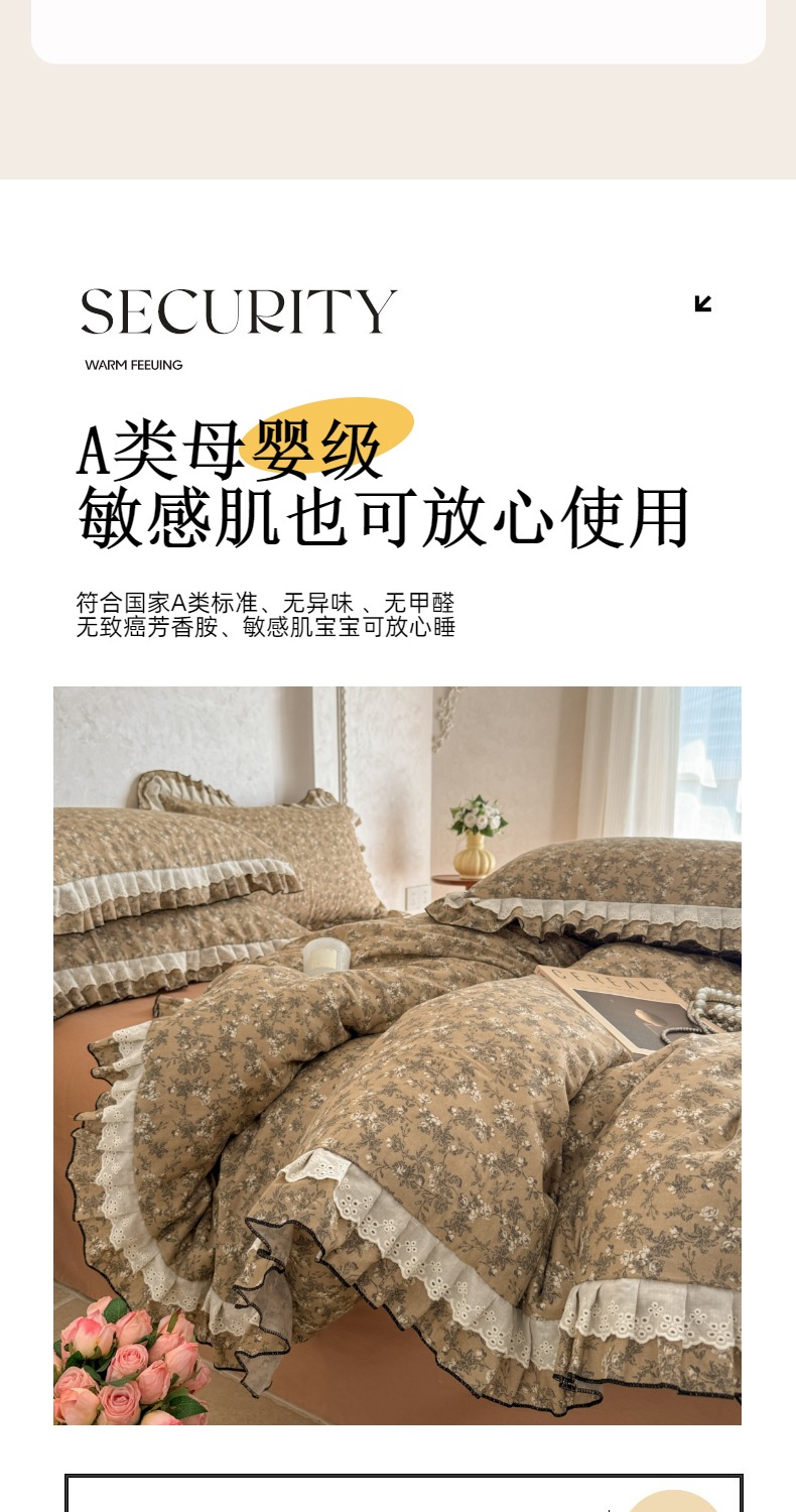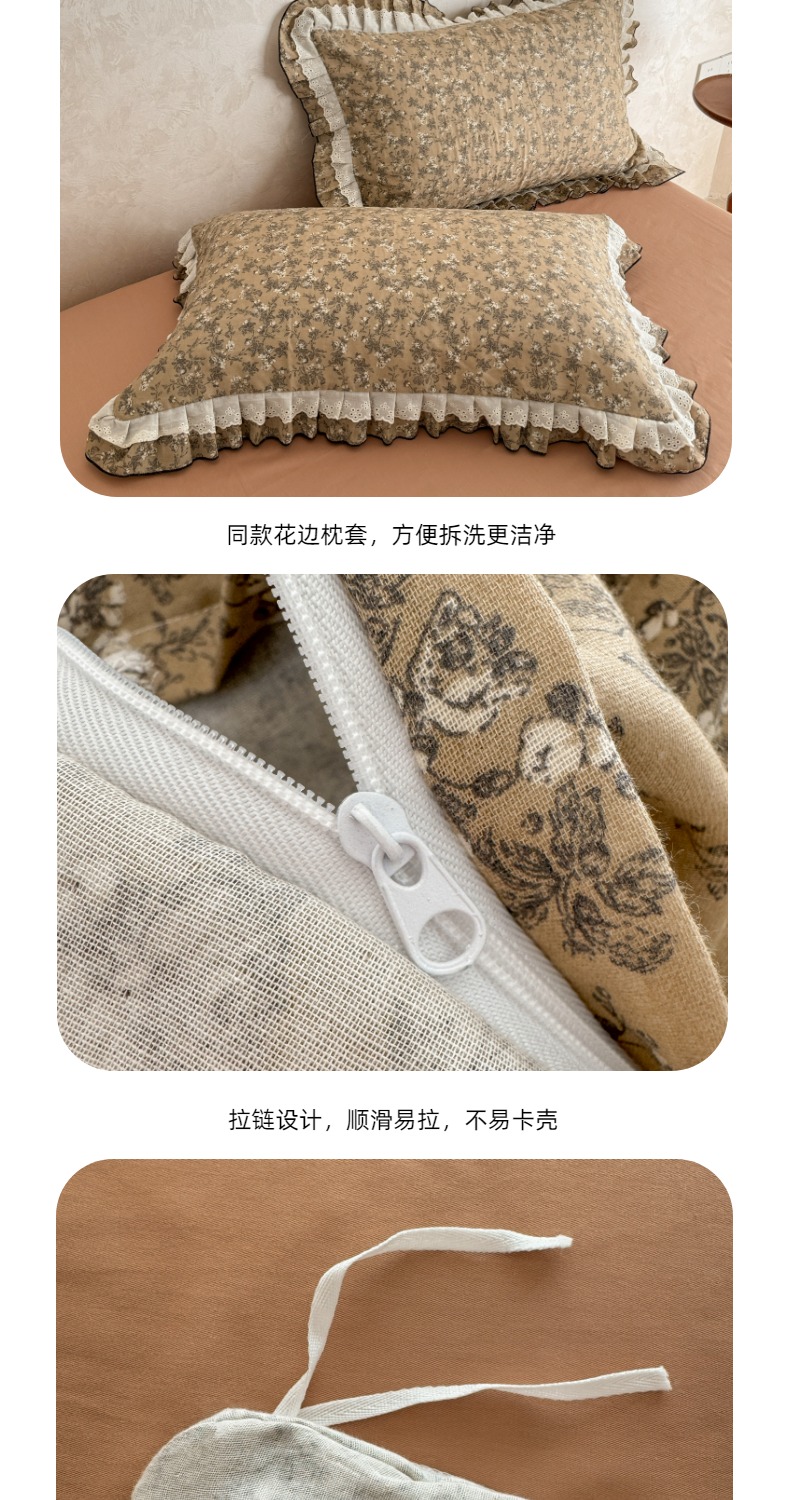 商品名称:简宜家居(朝初家纺) 2025新款40s全棉纯棉双层纱撞色蕾丝花边四件套 焦糖舒梦