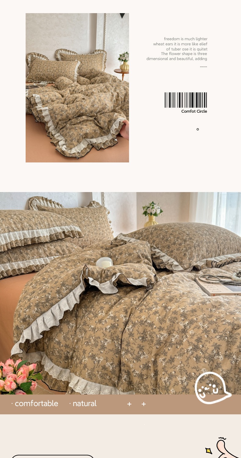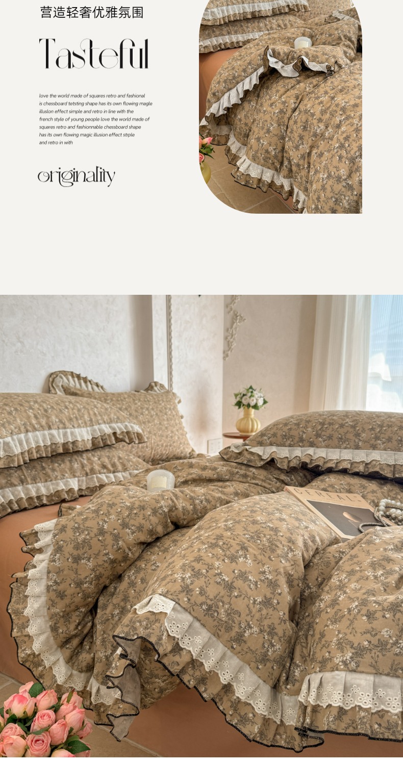 简宜家居(朝初家纺) 2025新款40s全棉纯棉双层纱撞色蕾丝花边四件套 焦糖舒梦