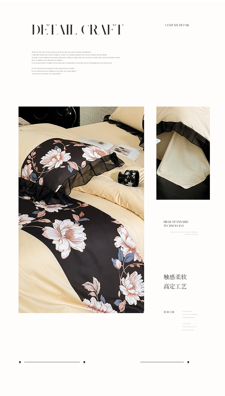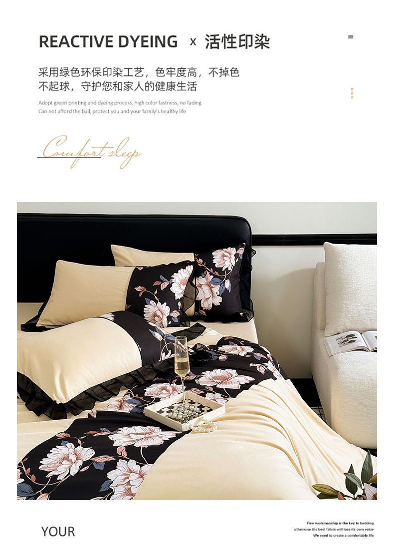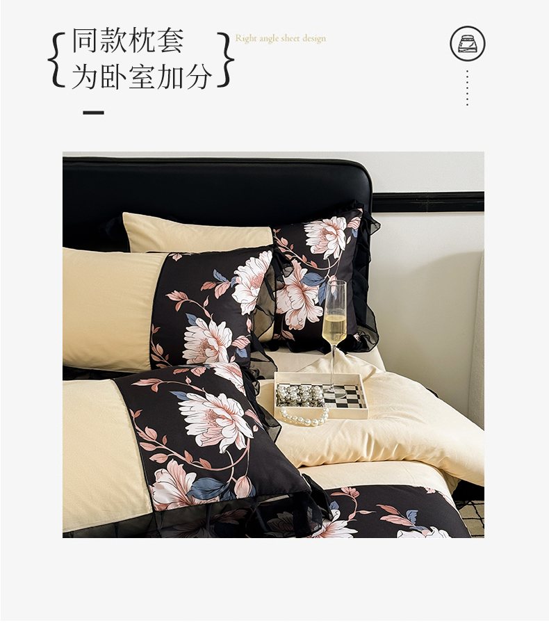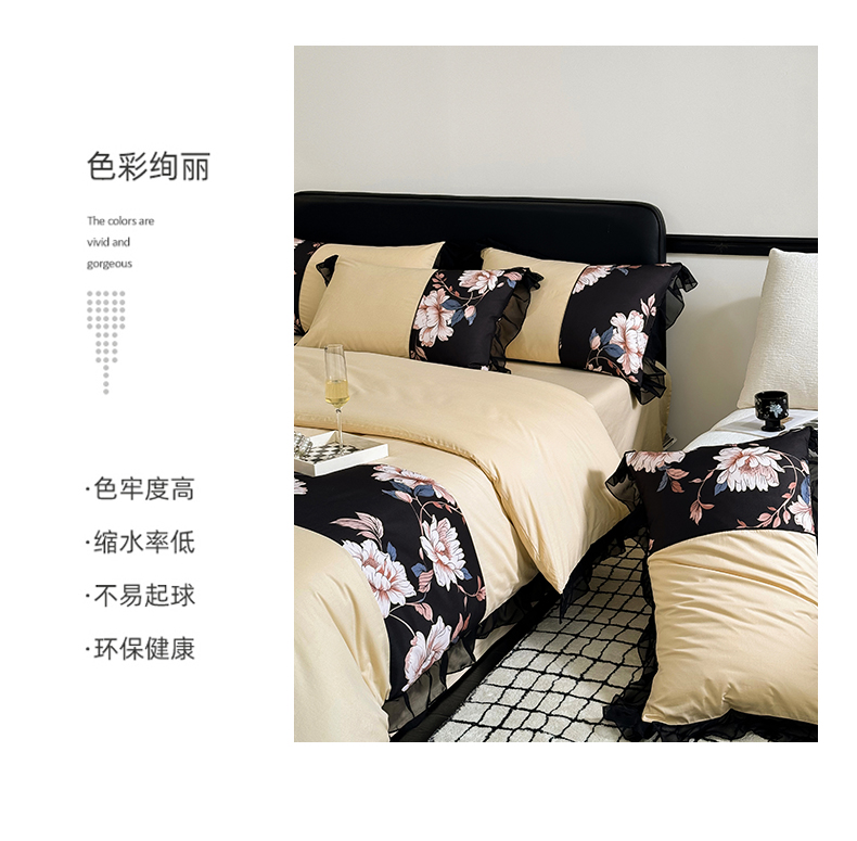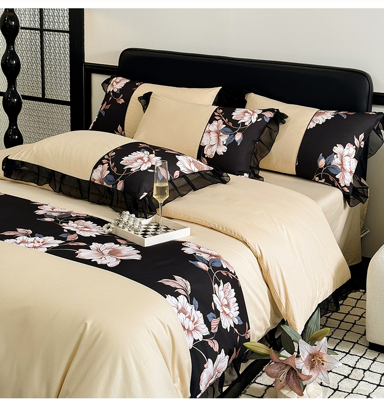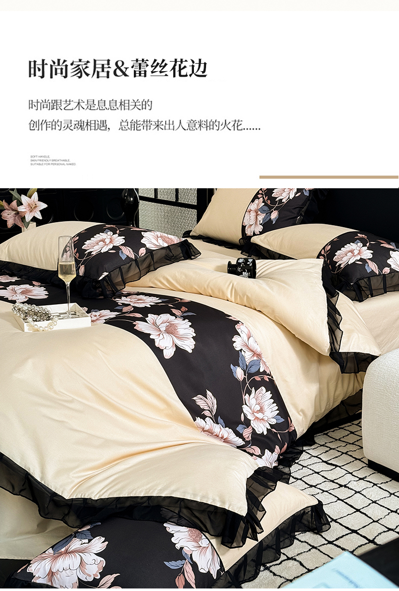 商品名称:宅家居 2025新款轻法式复古风拼接印花纯棉长绒棉韩式黑色花边40支全棉四件套-赫琳娜 赫琳娜-香槟金