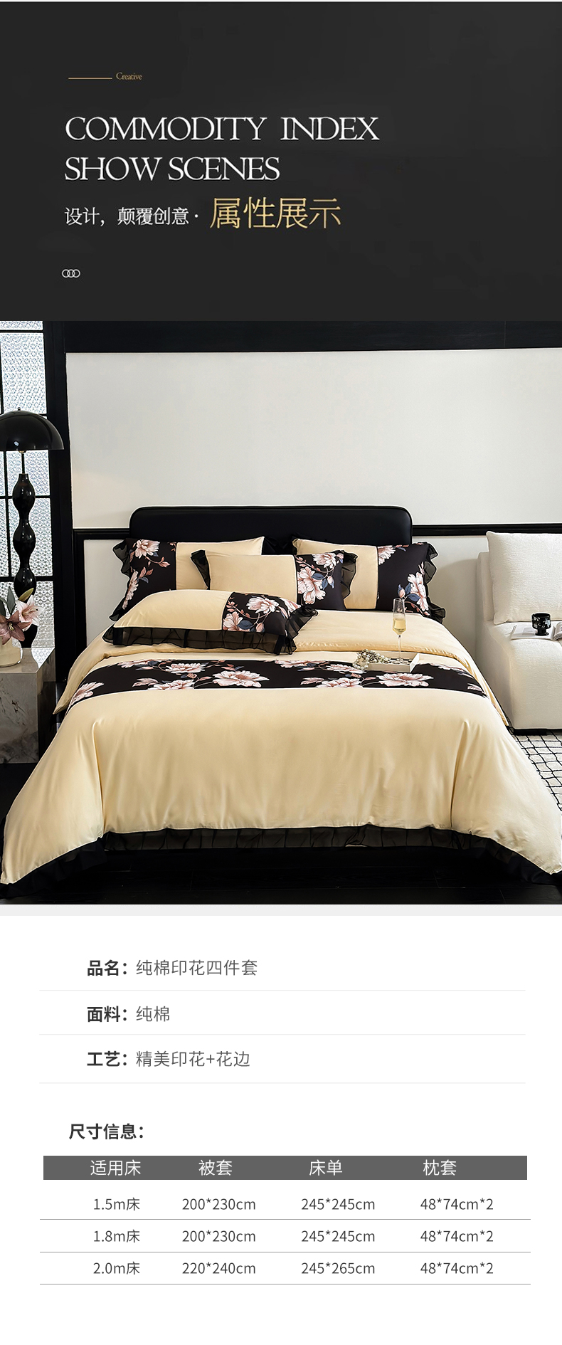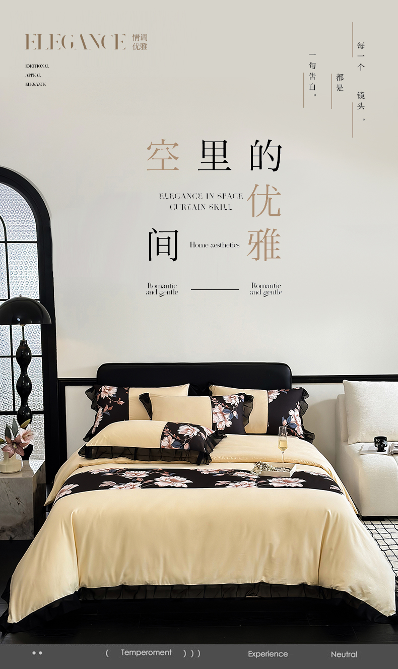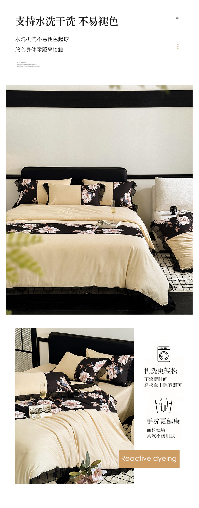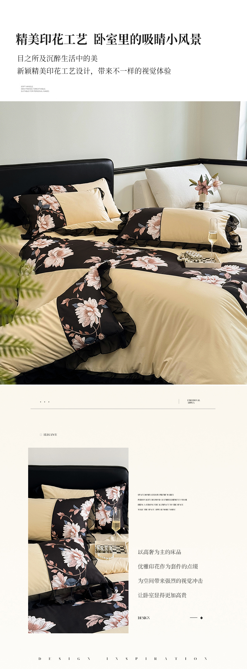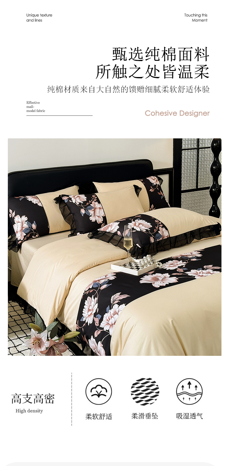 商品名称:宅家居 2025新款轻法式复古风拼接印花纯棉长绒棉韩式黑色花边40支全棉四件套-赫琳娜 赫琳娜-香槟金
