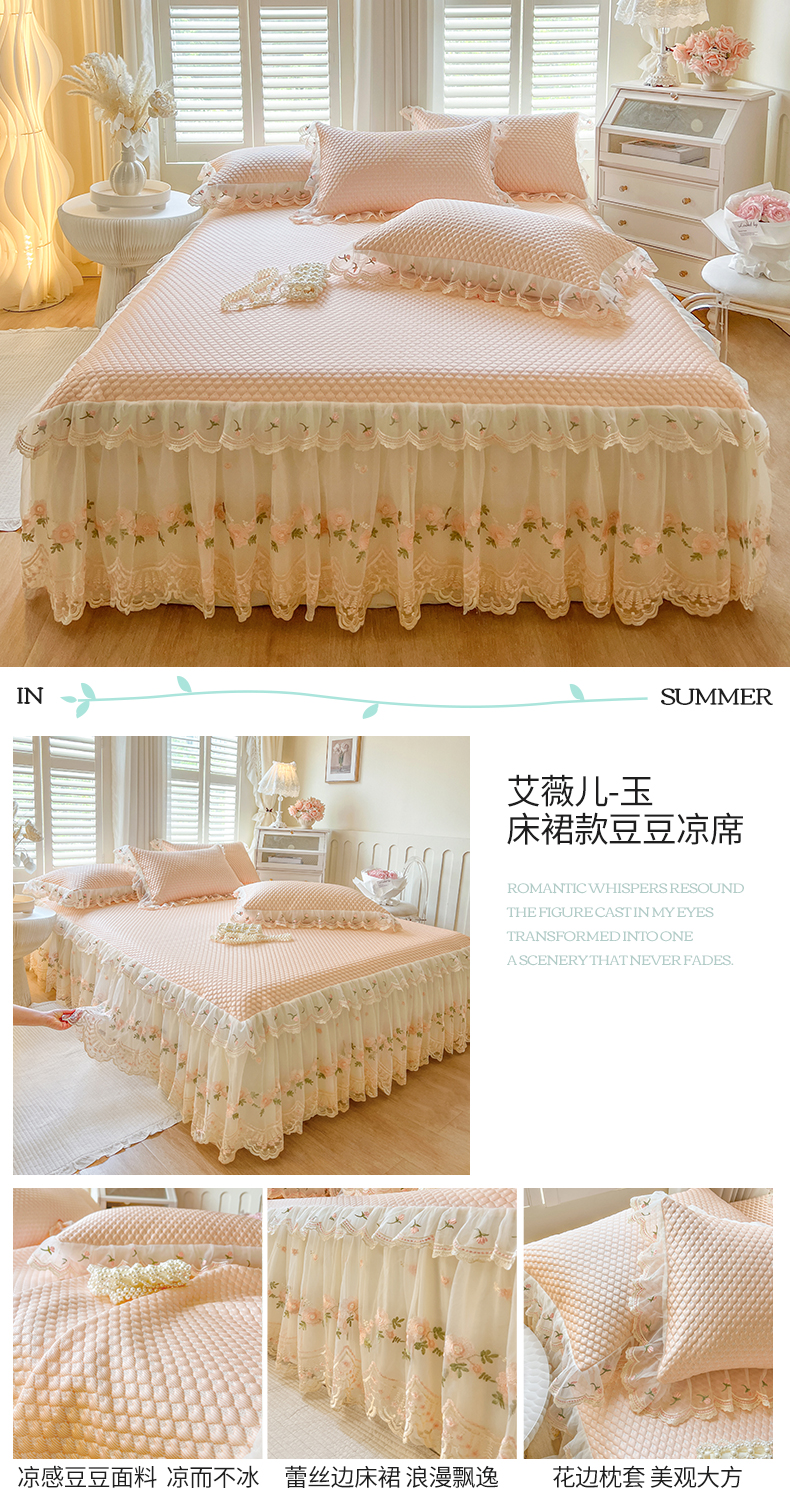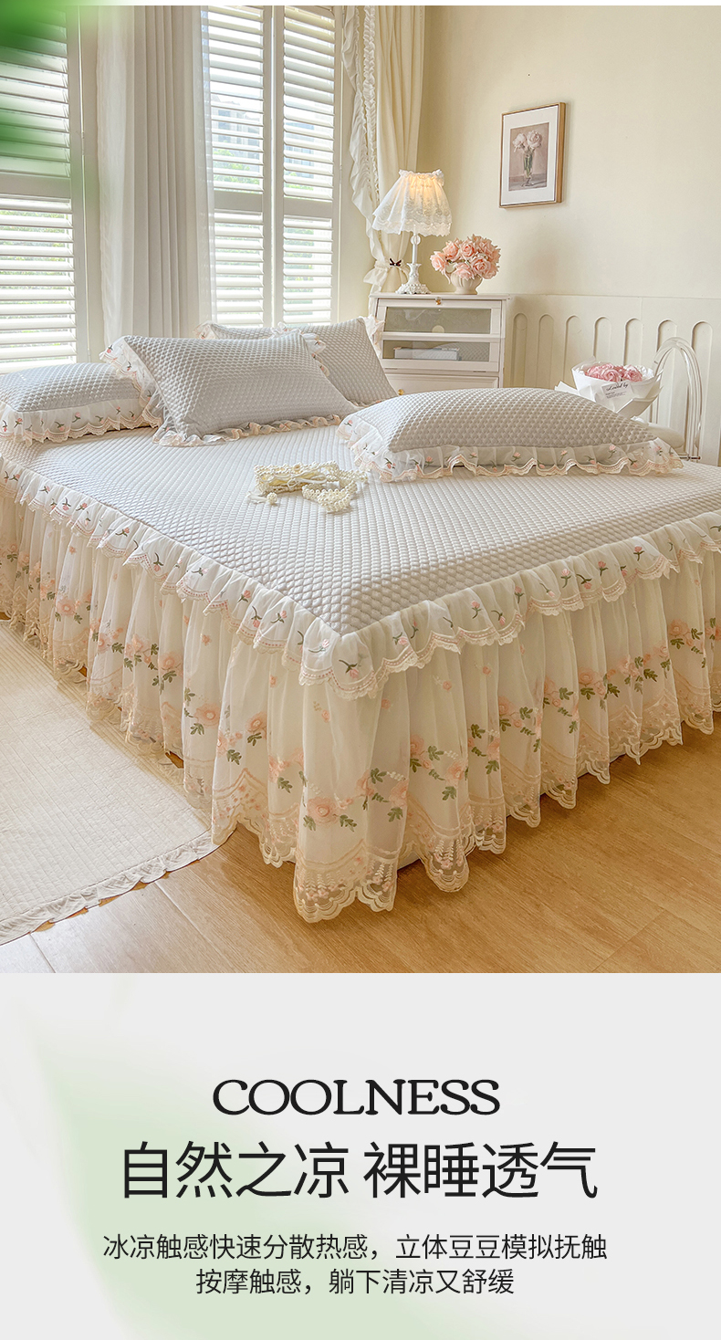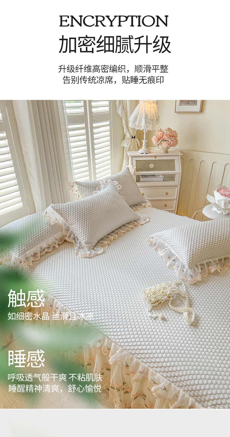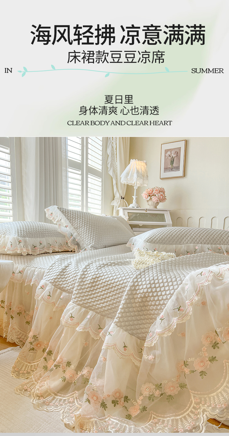 商品名称:网红馆(ck家纺) 2025新款凉感蕾丝花边床裙款豆豆席凉席-艾薇儿 艾薇儿-灰