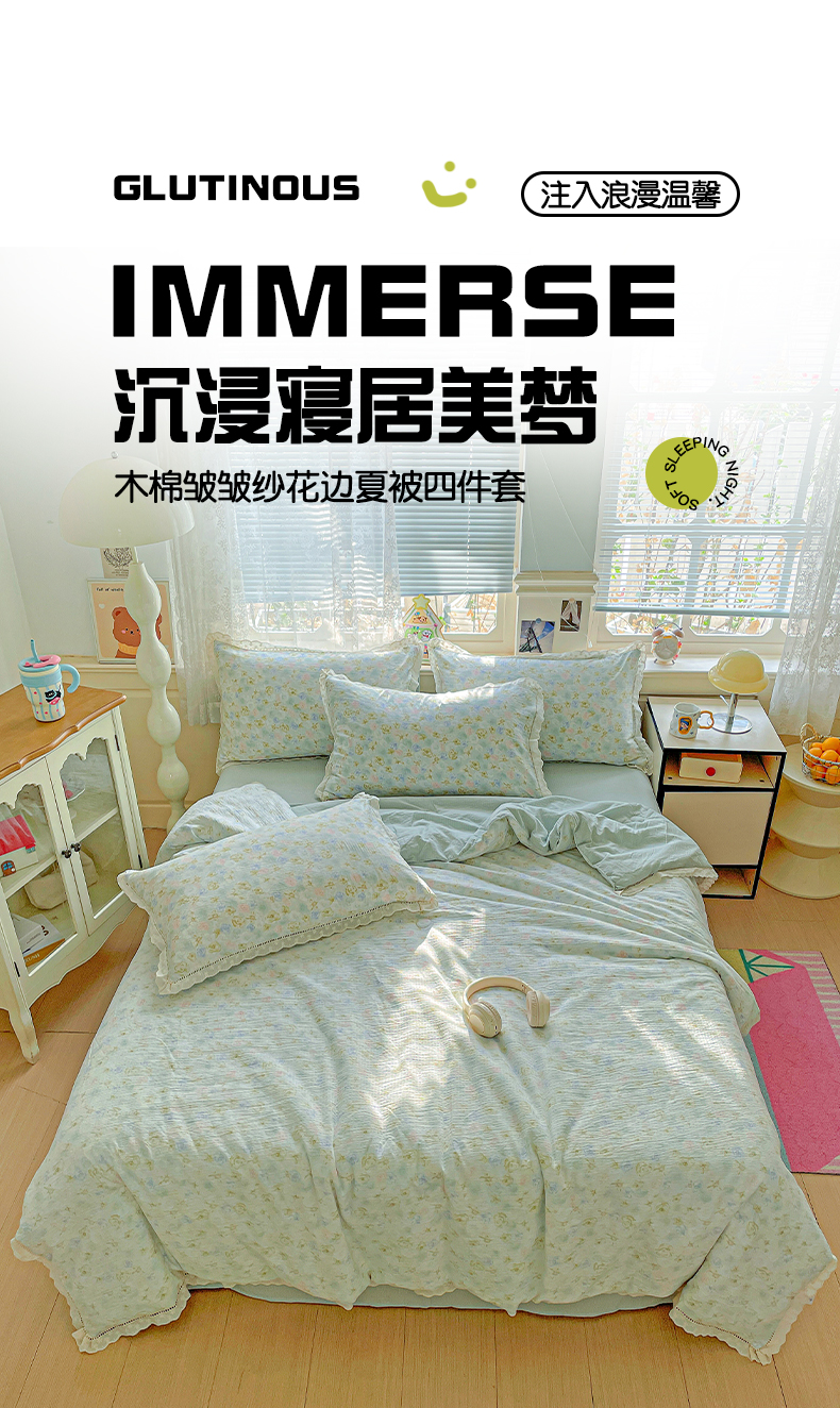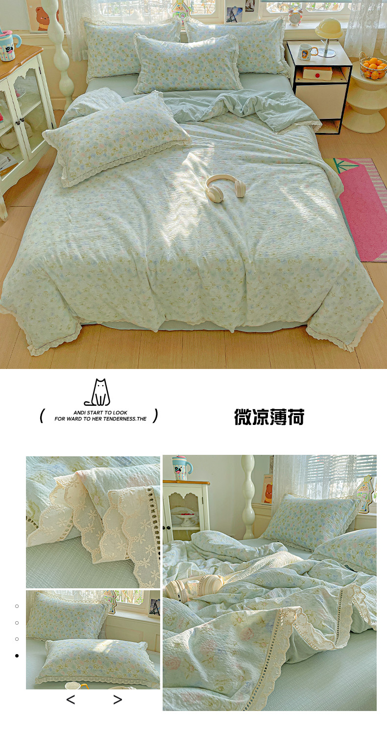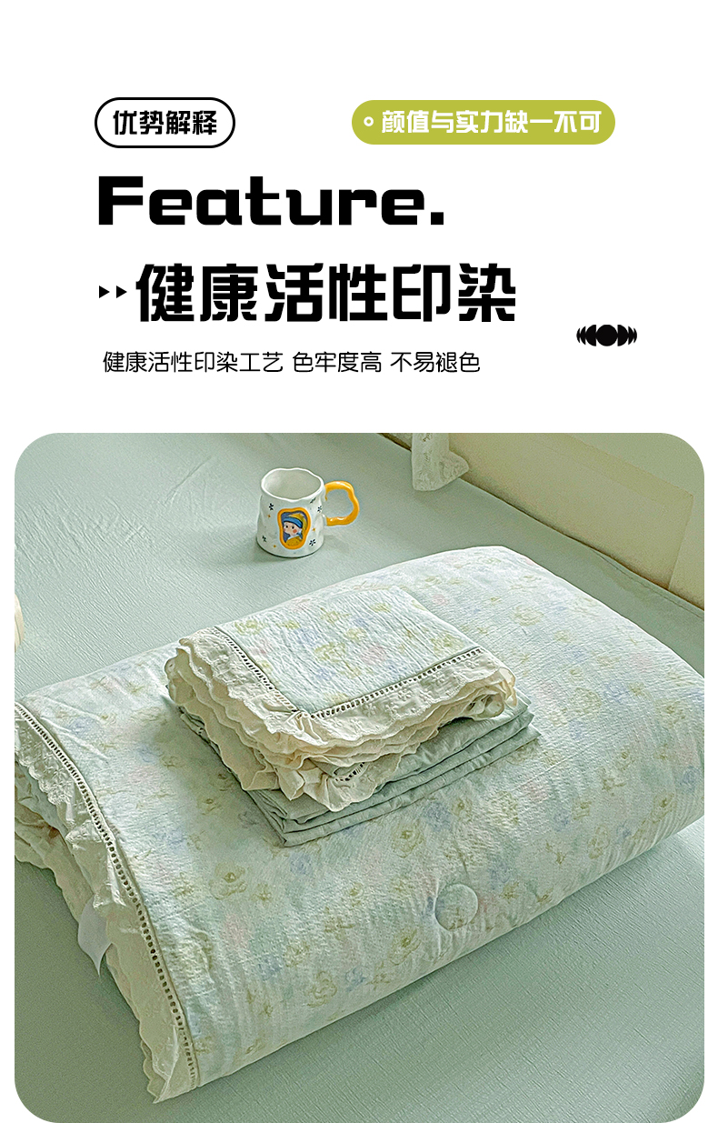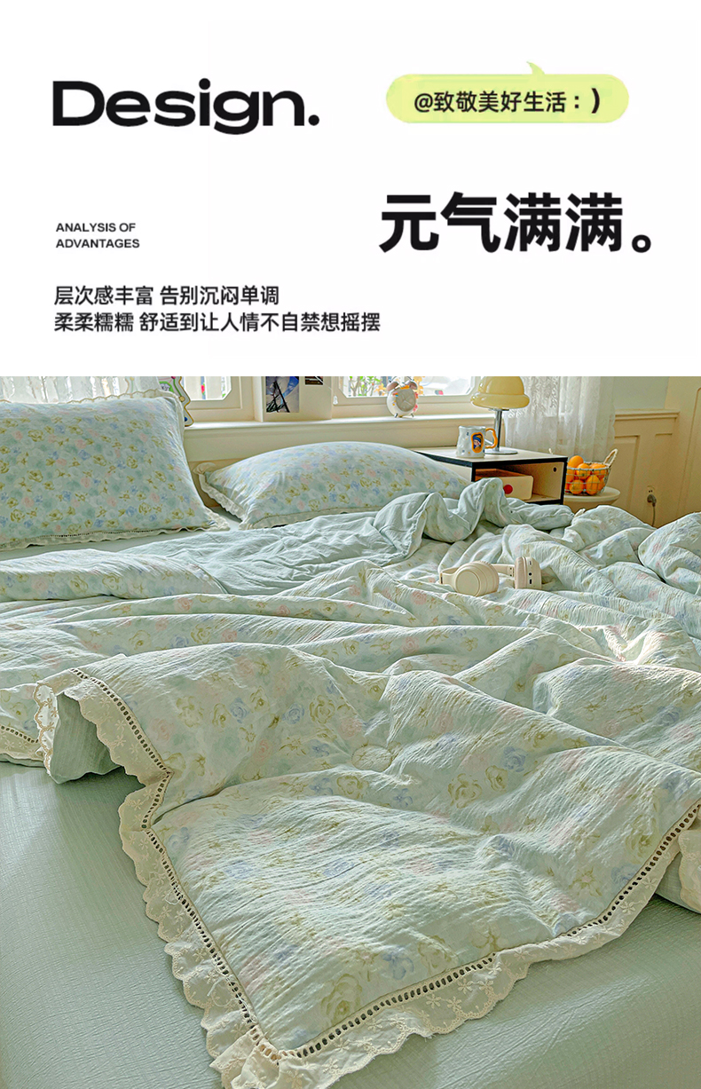 • 91家纺网 家纺一手货源 找家纺 暖芯优选 2025新款皱皱双层纱全棉花边夏被夏凉被空调被三件套 微凉薄荷