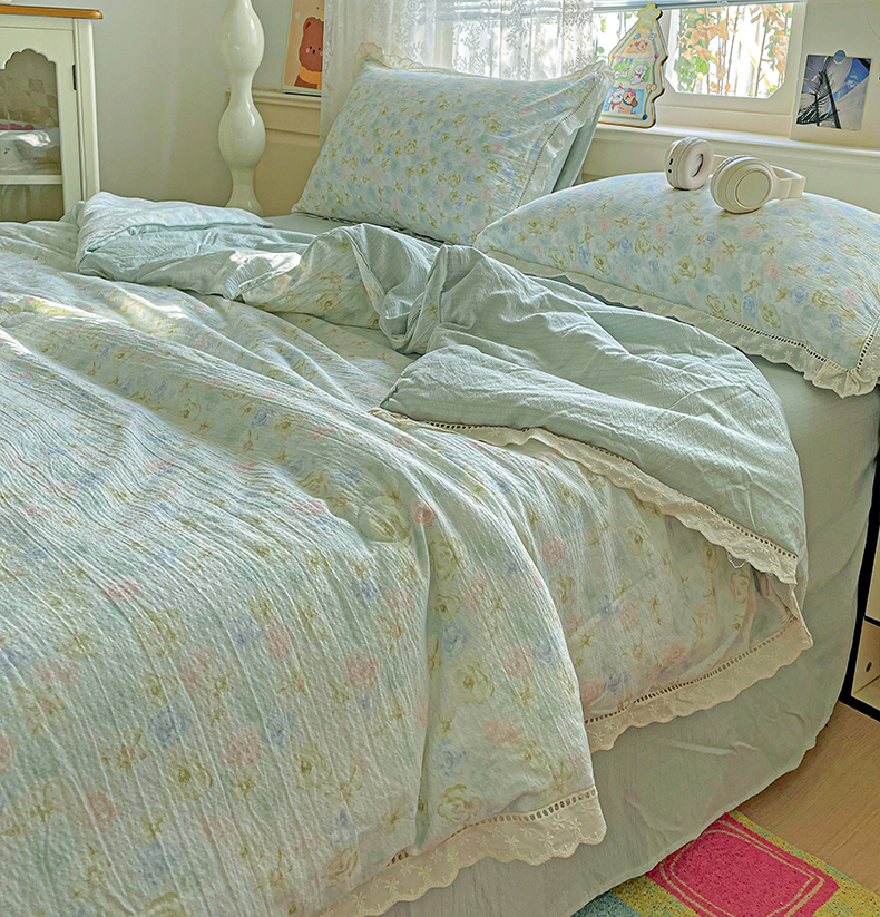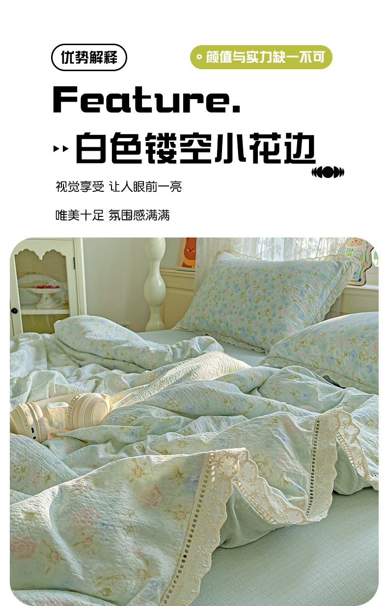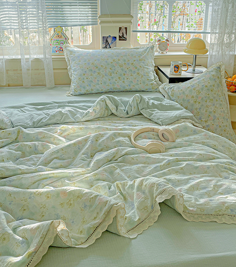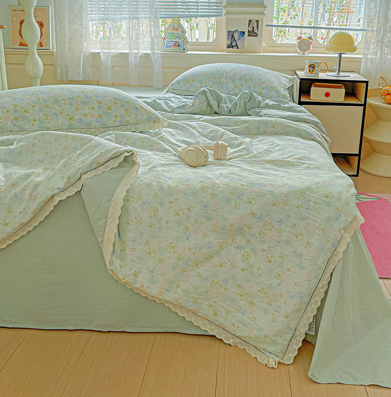 暖芯优选 2025新款皱皱双层纱全棉花边夏被夏凉被空调被三件套 微凉薄荷