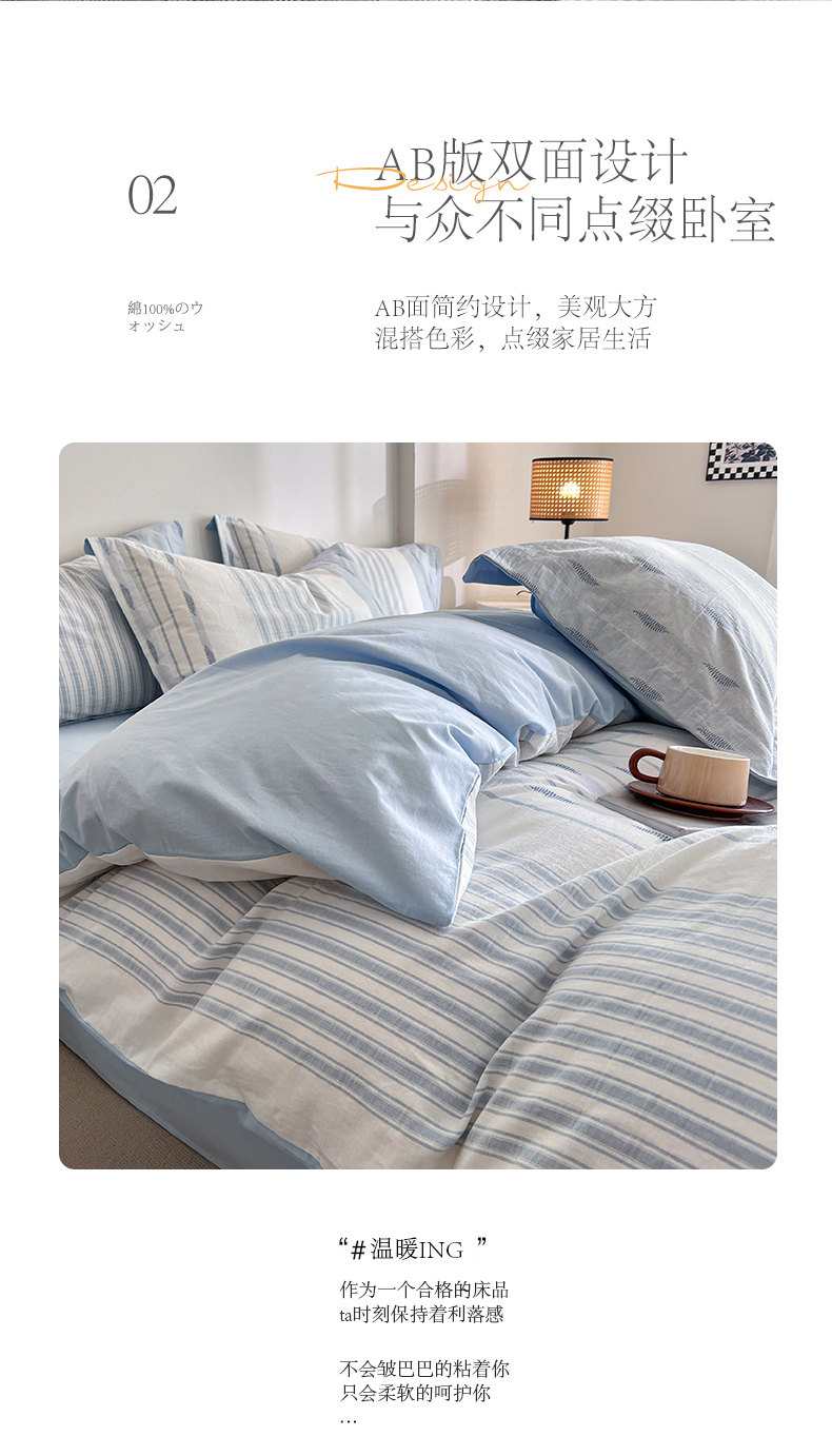 小懒猪2025色织水洗棉提花四件套 小叶条蓝