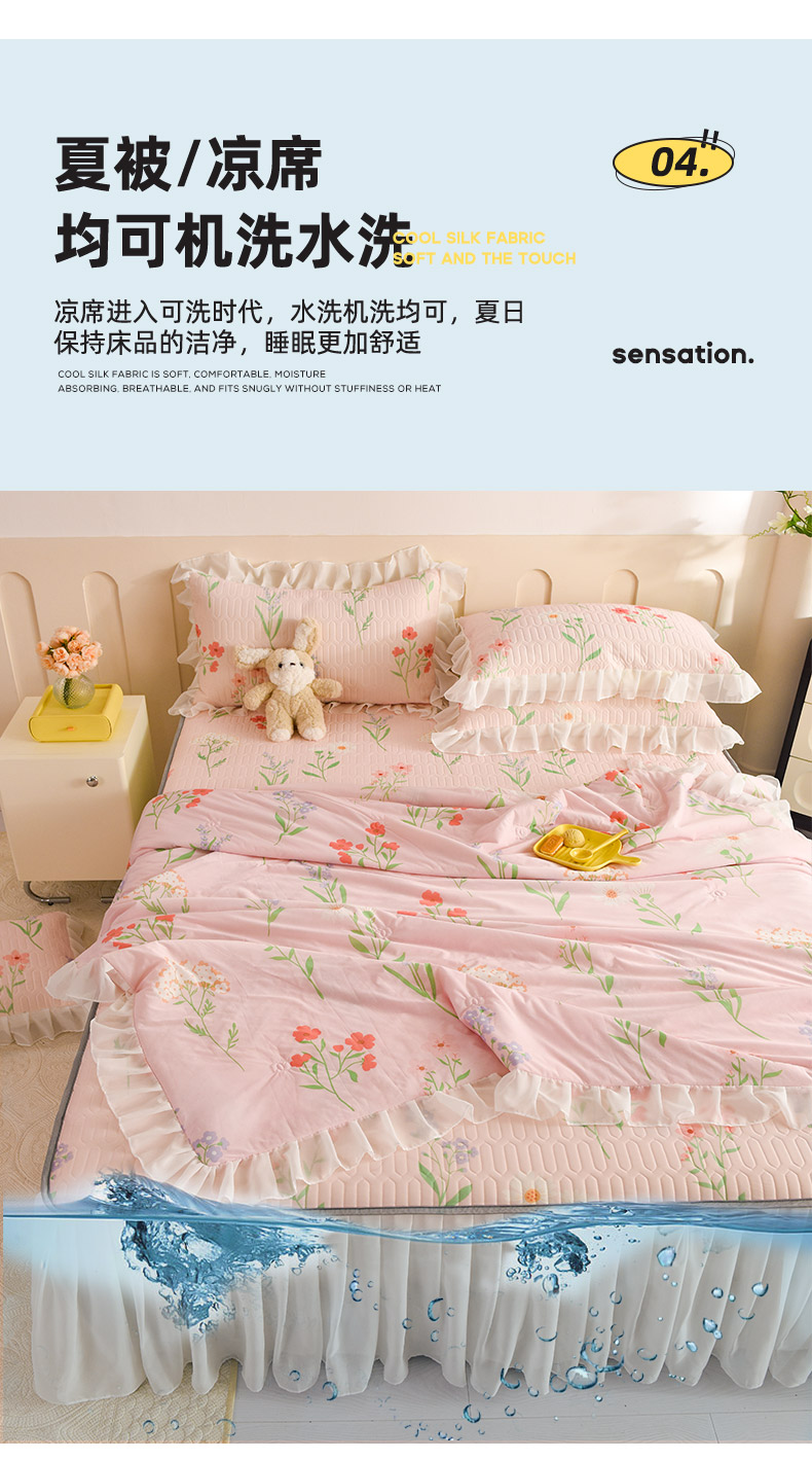 当前位置: 91家纺网 > 商品网购 > 床品套件 > 四件套 > 夏被四件套 > 悦织湾家纺 2025新款A类凉感丝床裙款乳胶凉席席子夏被夏凉被空调被四件套 玫瑰花语