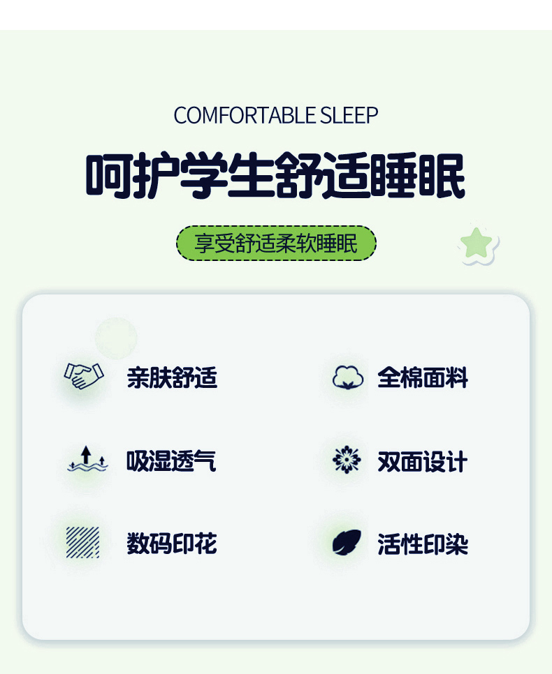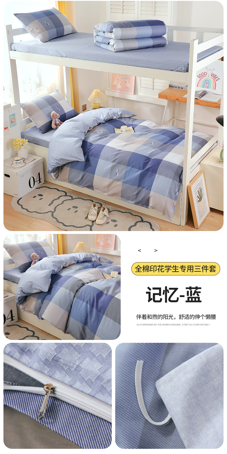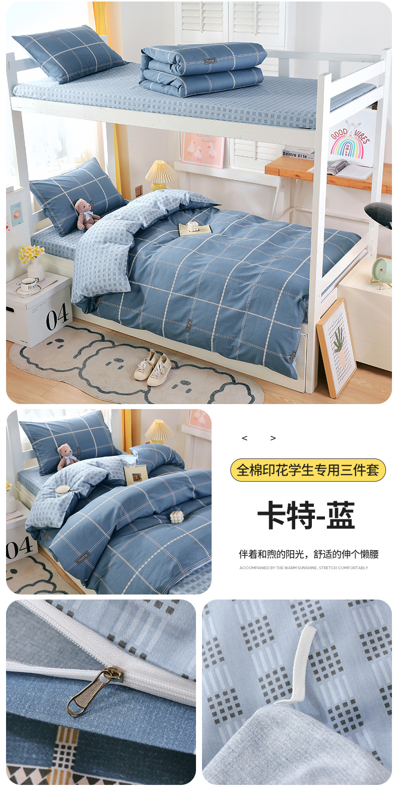 商品名称:悦织湾家纺 2025新款13372全棉纯棉印花学生三件套正宗高密度活性环保印染上下铺三件套 卡特-蓝