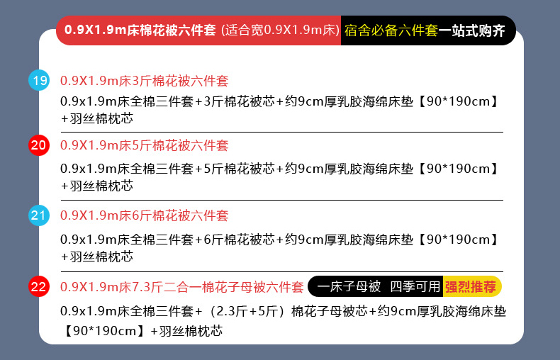 【床笠款】90x200cm三件套+7.3斤羽丝棉子母被五件套 | ¥179.00 |