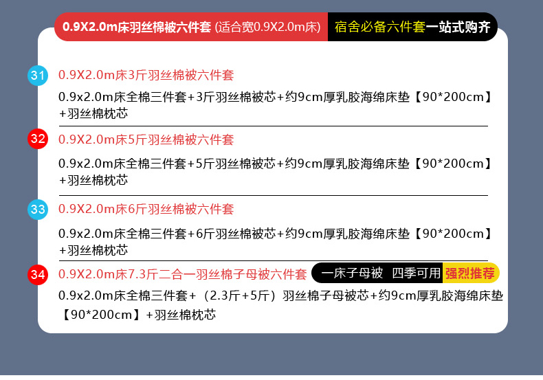 【海绵床垫床笠款】90x190床6斤羽丝棉被六件套 | ¥228.00 |
