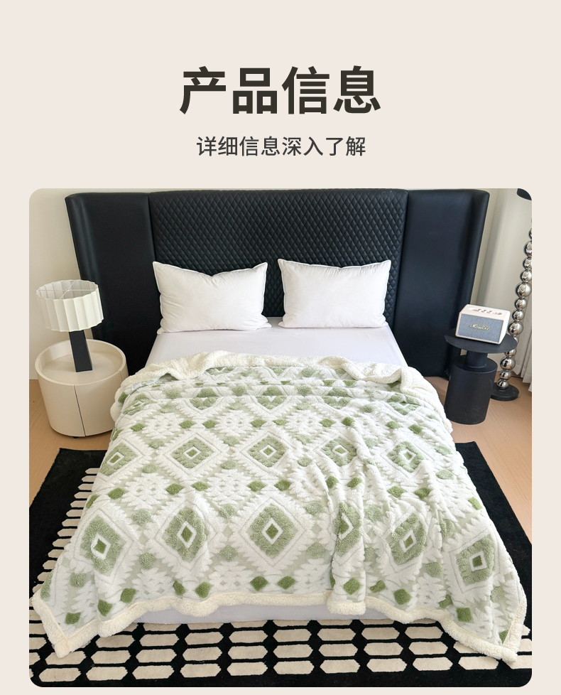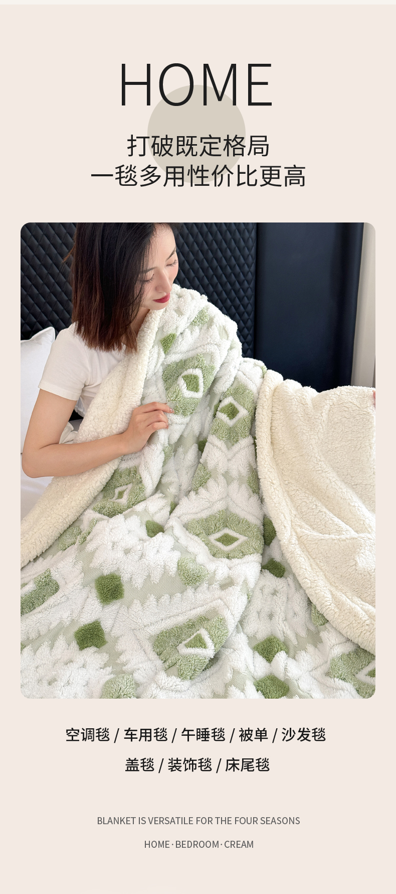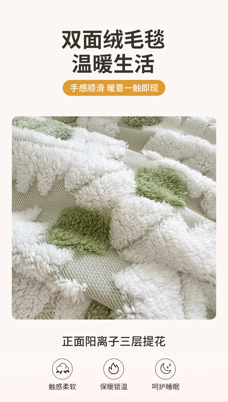 商品名称:丹本家纺 2025新款轻奢阳离子提花镂空塔芙绒羊羔绒保暖午睡双层毛毯办公室盖毯 浅绿