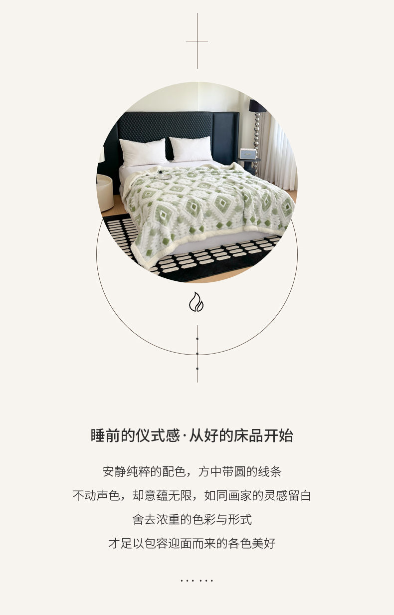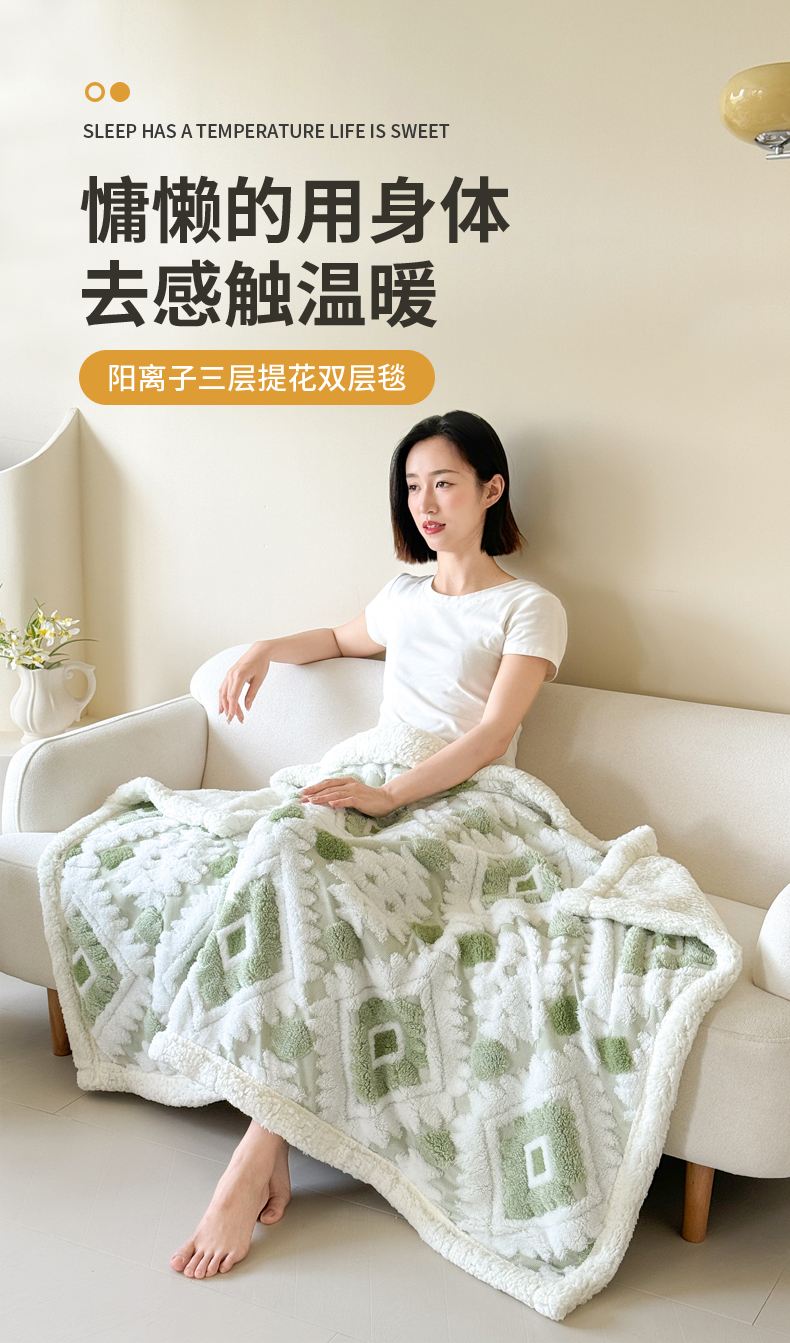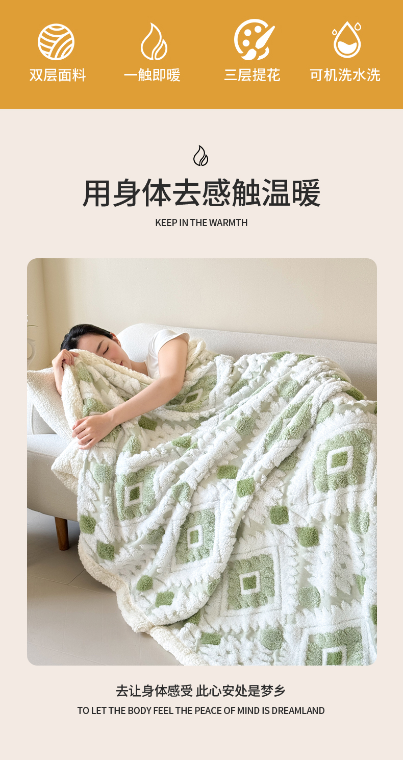 商品名称:丹本家纺 2025新款轻奢阳离子提花镂空塔芙绒羊羔绒保暖午睡双层毛毯办公室盖毯 浅绿