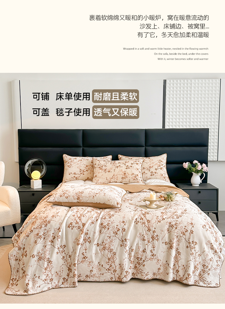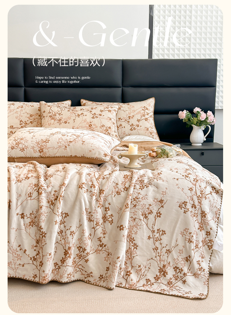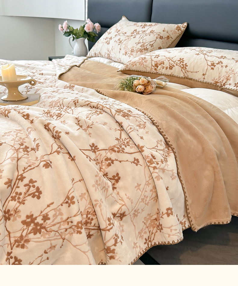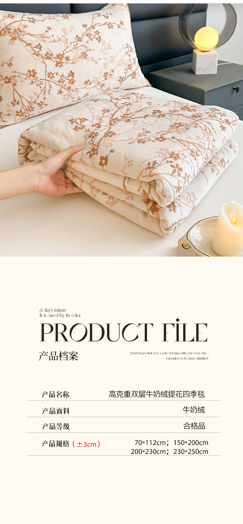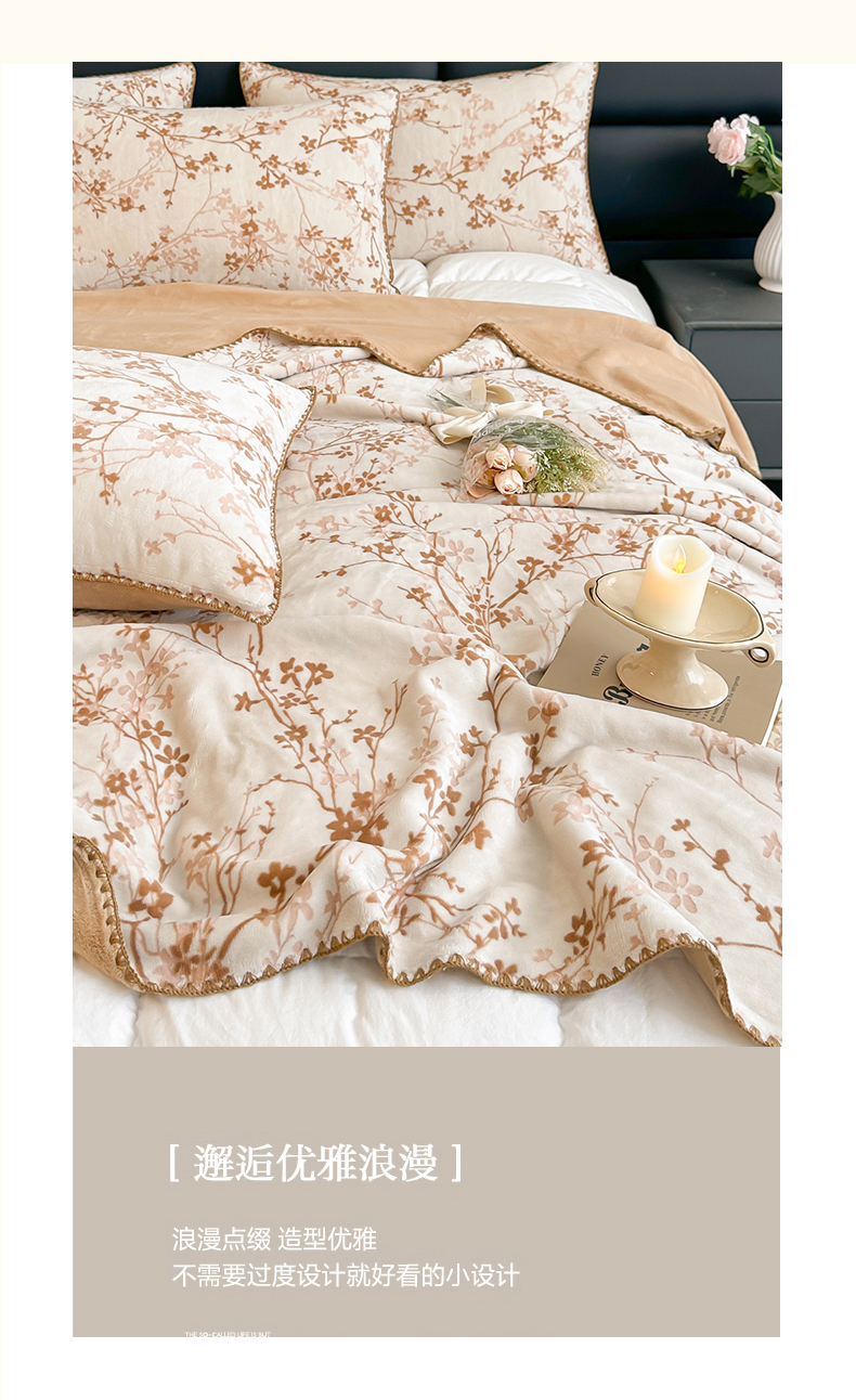 商品名称:芙绣家纺 2025新款高克重双层牛奶绒毛毯加厚冬季毛毯四季毯办公室午休毯牛奶绒床单 山茶花语-咖