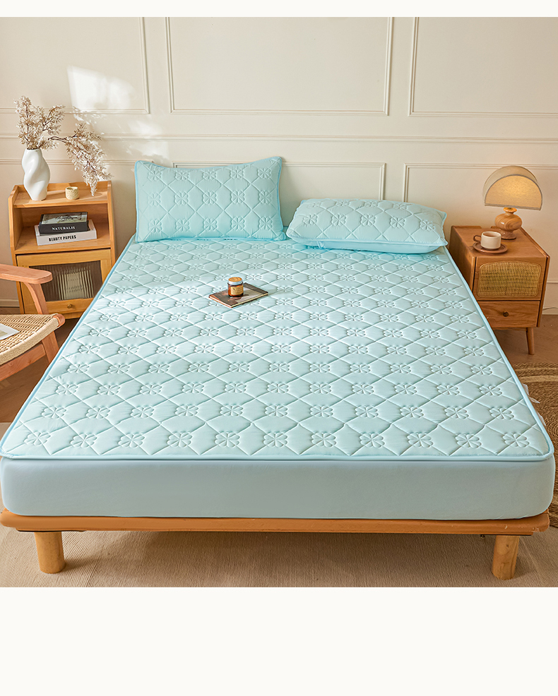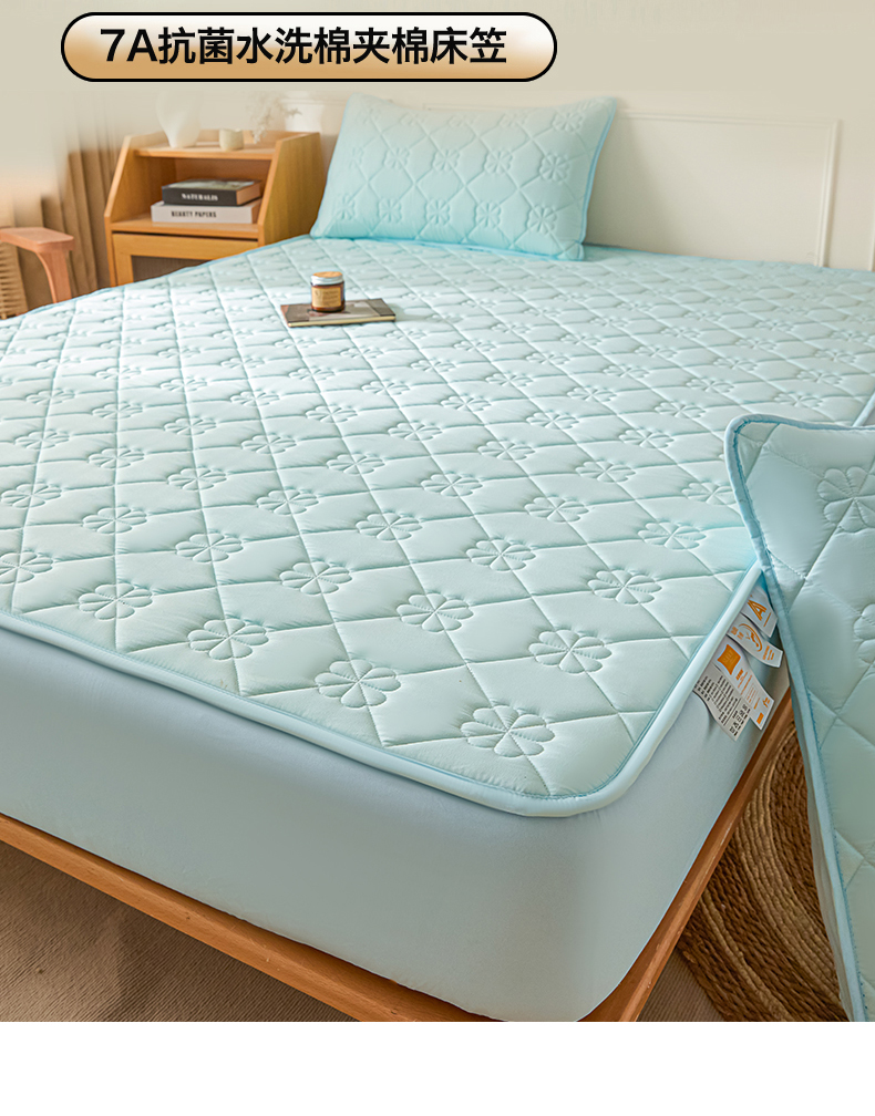 雯豆家纺 2025新款简约防水款水洗棉夹棉床笠 幸运草-淡水蓝