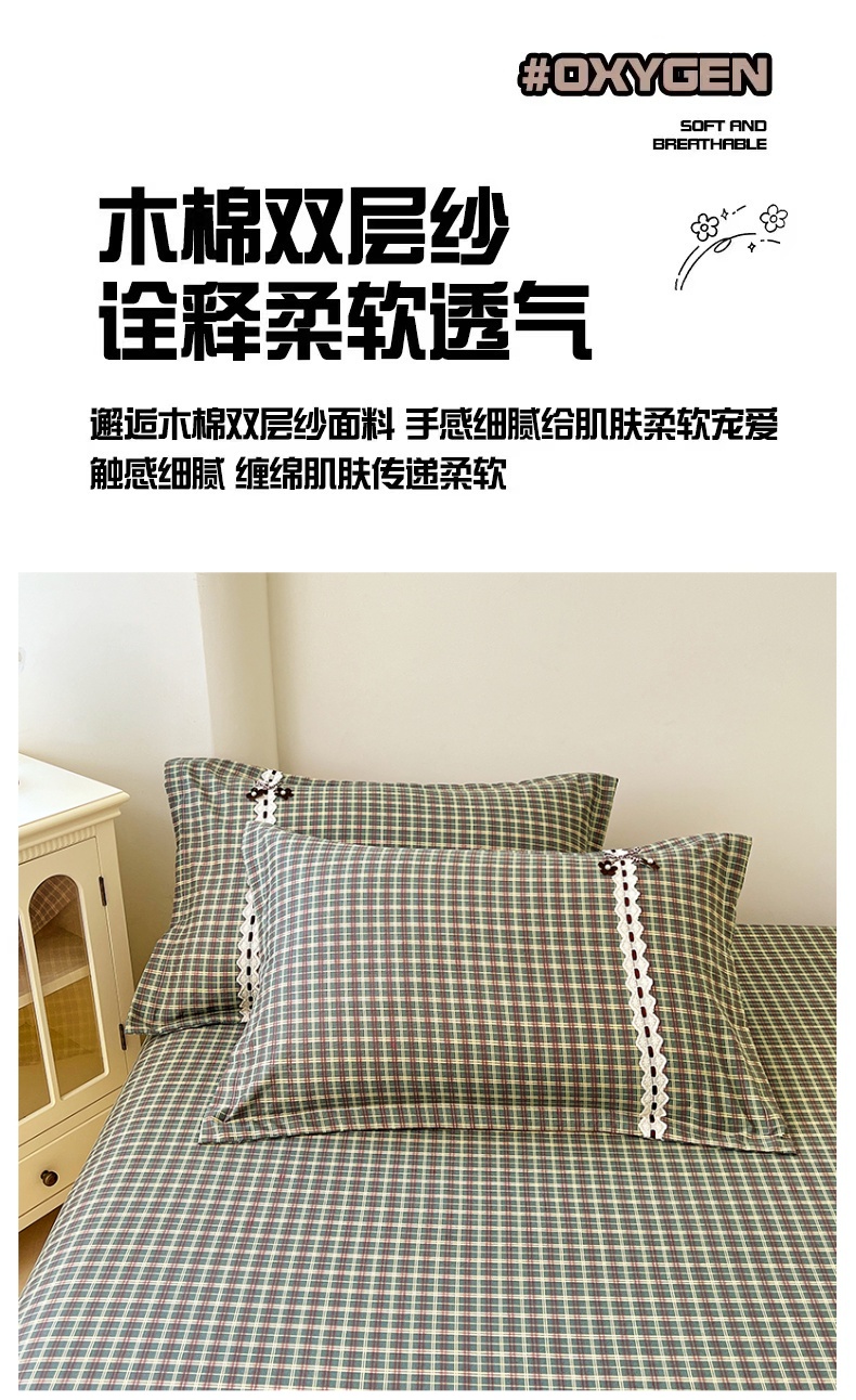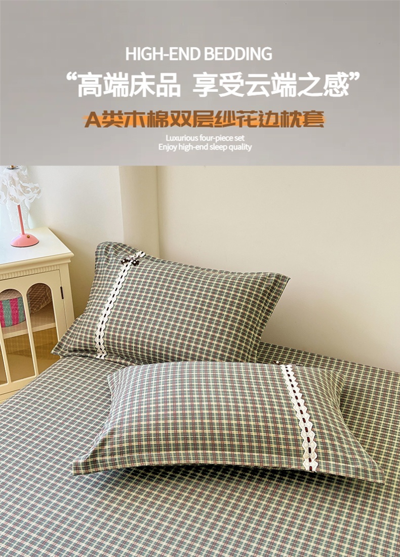 商品名称:梦舒羽 2025新款双层纱蕾丝花边格子枕套宿舍单人枕芯套内胆套一对装 简兮绿格