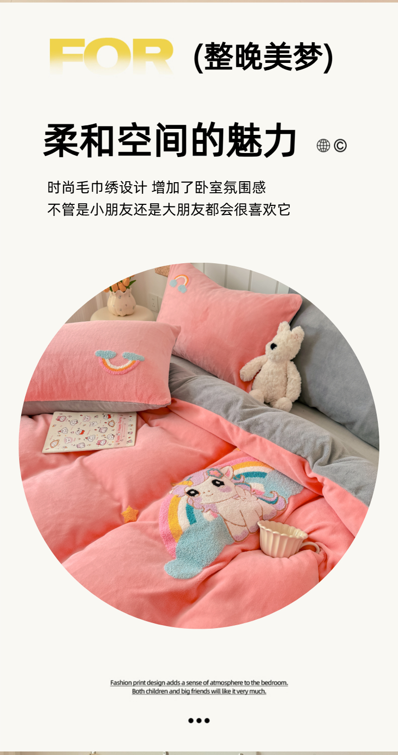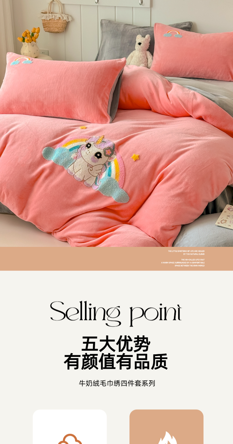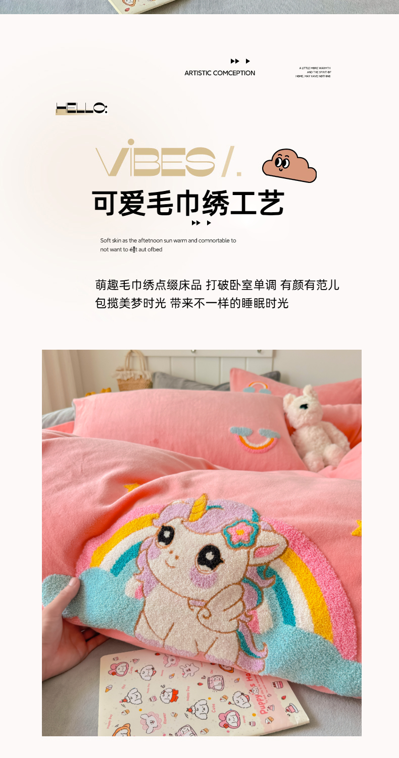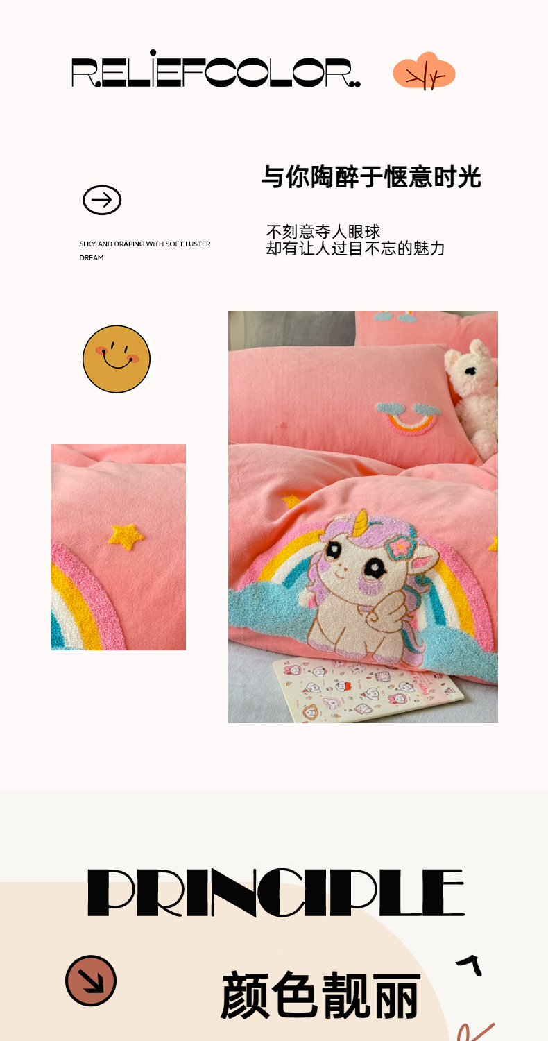 商品名称:莱凯家纺 2025新款毛巾绣牛奶绒四件套 彩虹小马