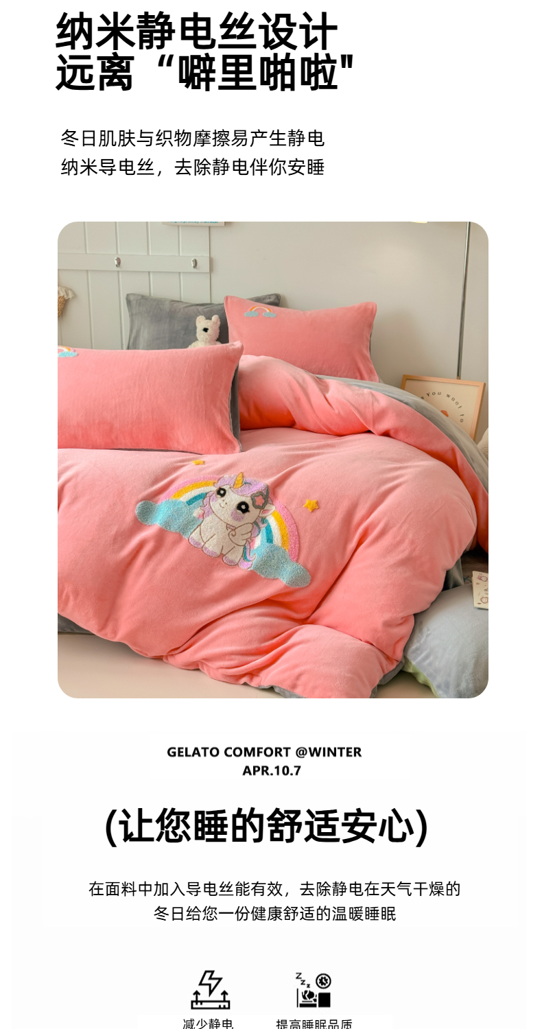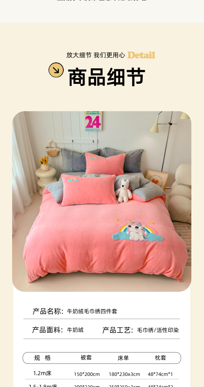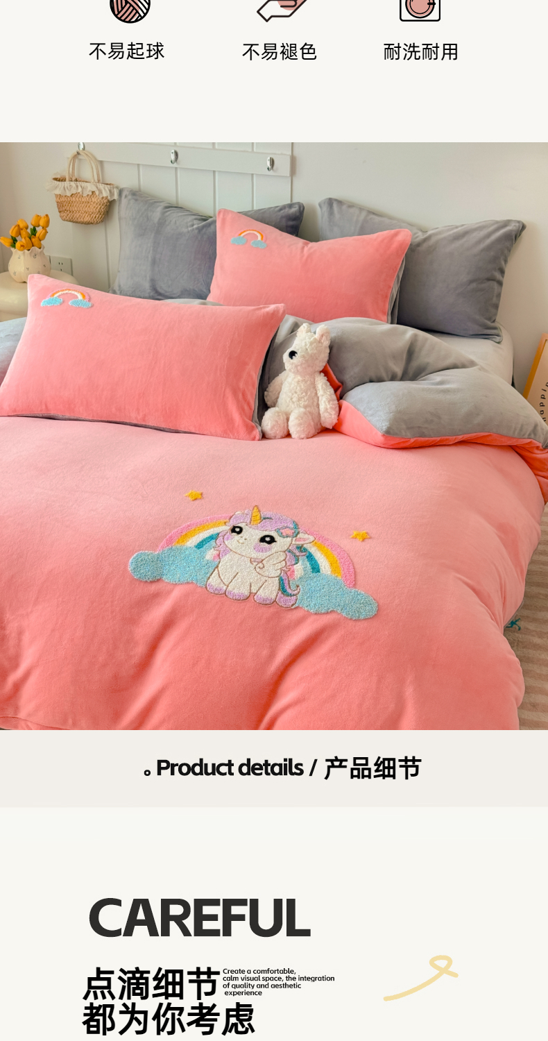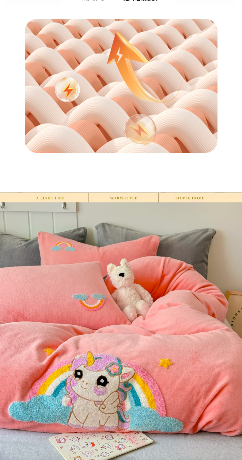 商品名称:莱凯家纺 2025新款毛巾绣牛奶绒四件套 彩虹小马