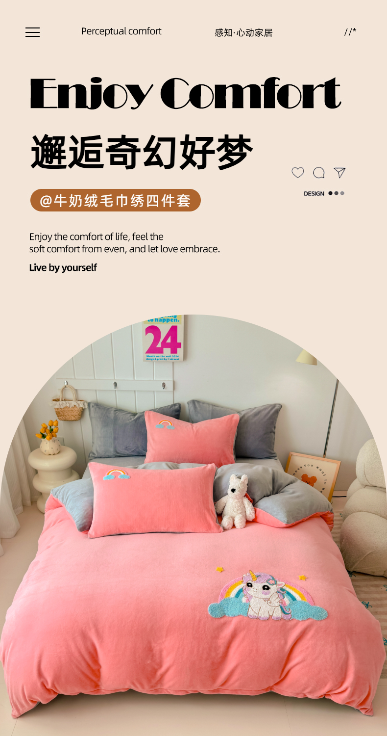 莱凯家纺 2025新款毛巾绣牛奶绒四件套 彩虹小马