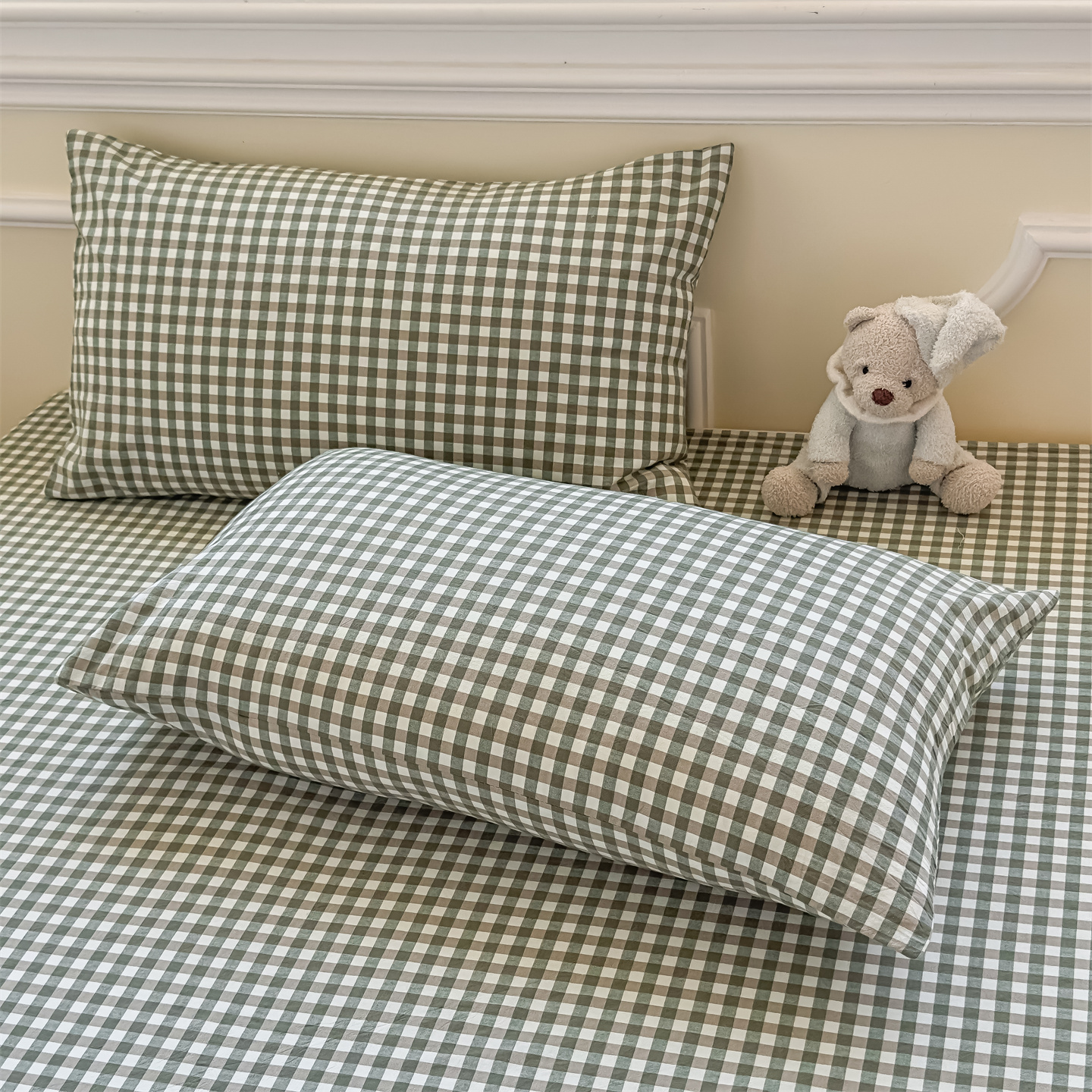 (总)菡宝 2025新款全棉纯棉色织小提花四件套支持定制定做尺寸,暴力熊卡其,暴力熊绿,大方块灰,大方块紫,千鸟格白,千鸟格灰,千鸟格绿,四叶草卡其