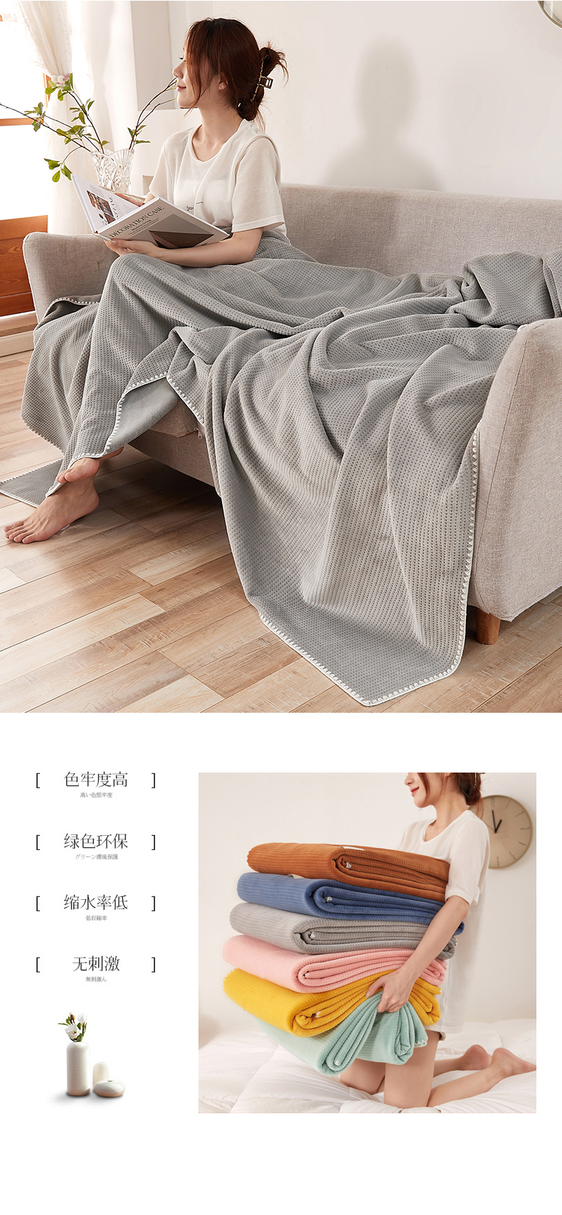 (总)莱家富 2026新款500克加厚A类华夫格牛奶绒双面毛毯轻奢休闲盖毯子多尺寸多功能午睡办,组合图仅做展示,都市灰,湖蓝,焦糖,明黄,奶白,嫩粉,苹果绿