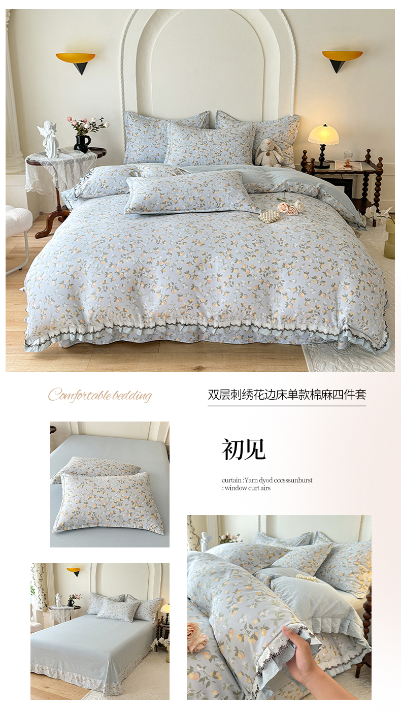 韩约家纺 2025秋冬加厚1双层刺绣花边床单款棉麻四件套 云絮