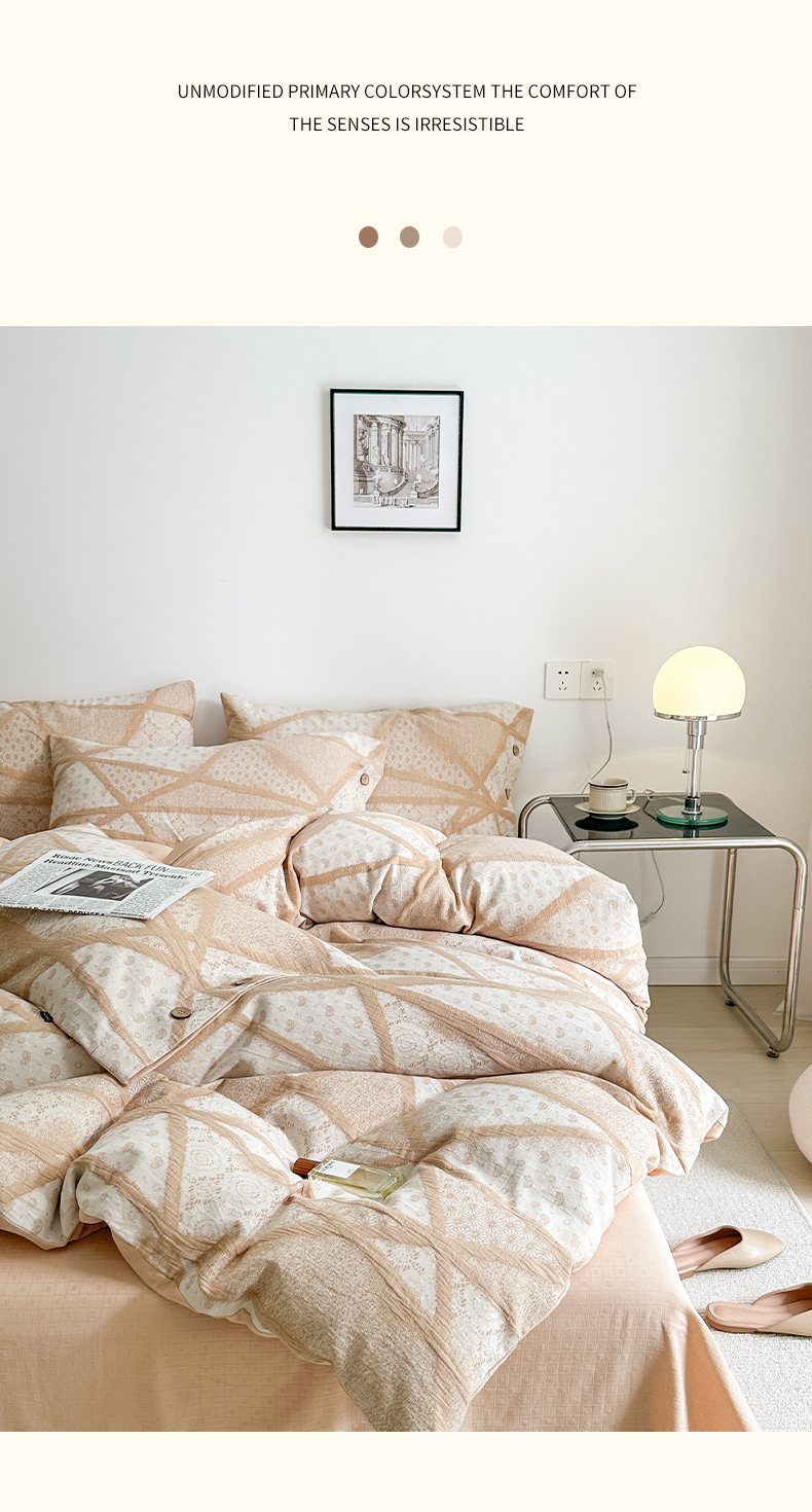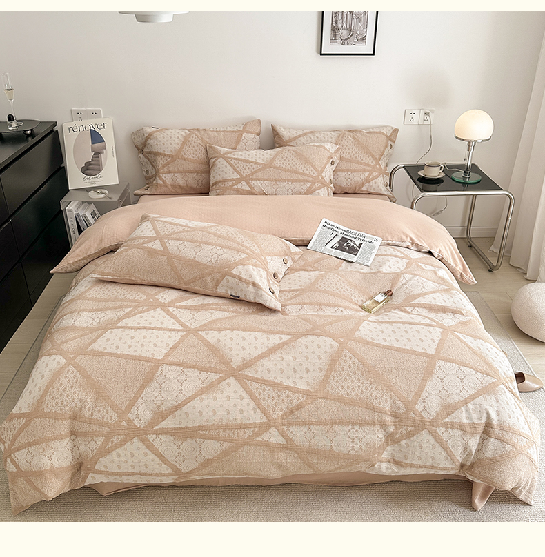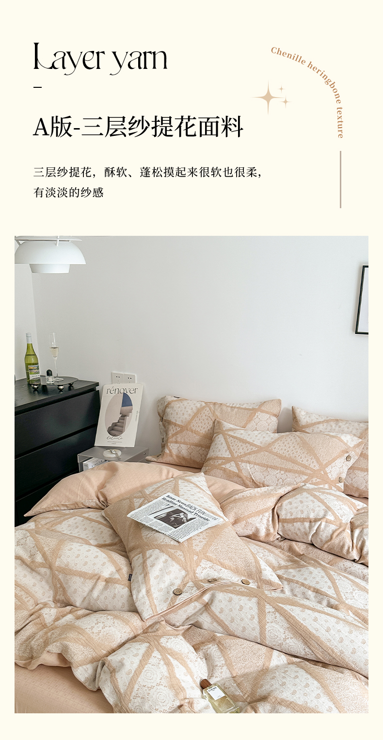 当前位置: 91家纺网 > 商品网购 > 床品套件 > 四件套 > 全棉普通四件套 > 贝尔 PELLHOME 全棉三层纱提花四件套-埃菲尔系列AB版均为全棉提花面料(可抖音代发) 埃菲尔-咖