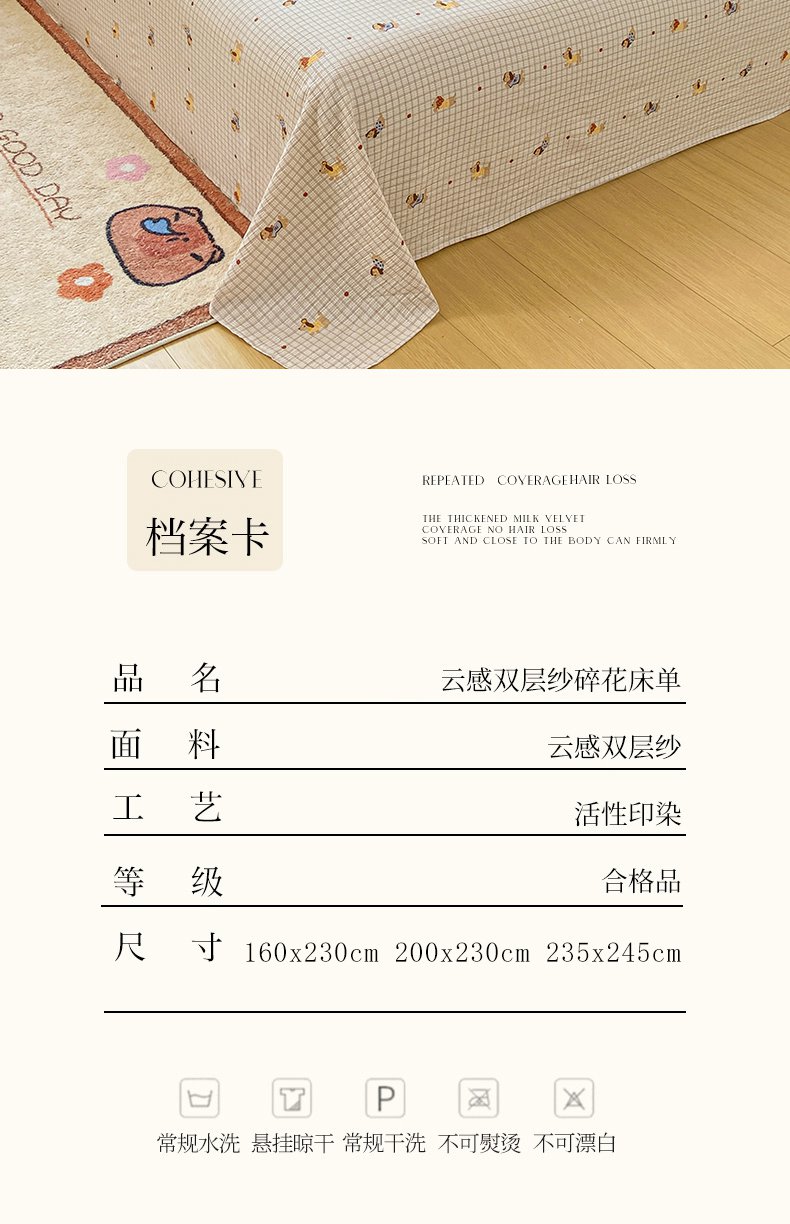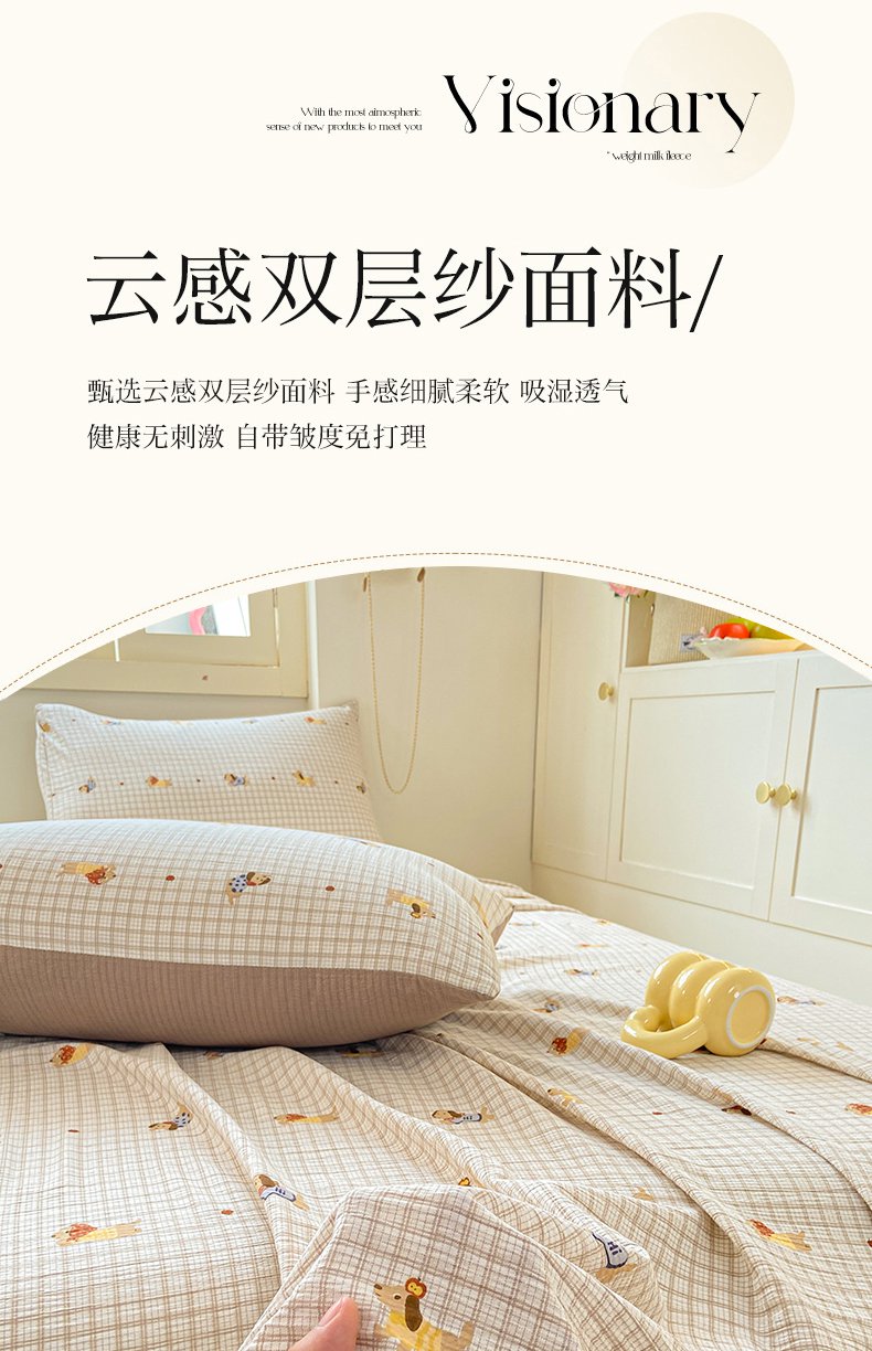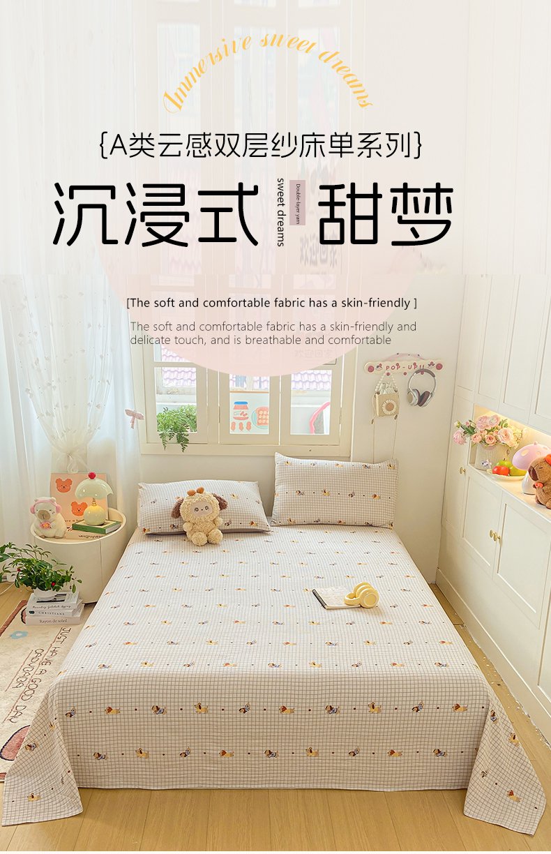(总)夜笙家纺 2025新款110克水洗棉双层纱单床单系列,巴克小狗,蝴蝶结,花海-粉,花海-蓝,花束粉,卡皮巴拉-咖,卡皮巴拉-蓝,快乐伙伴,兰黛,魔法小象-蓝,甜心草莓,熊熊乐园