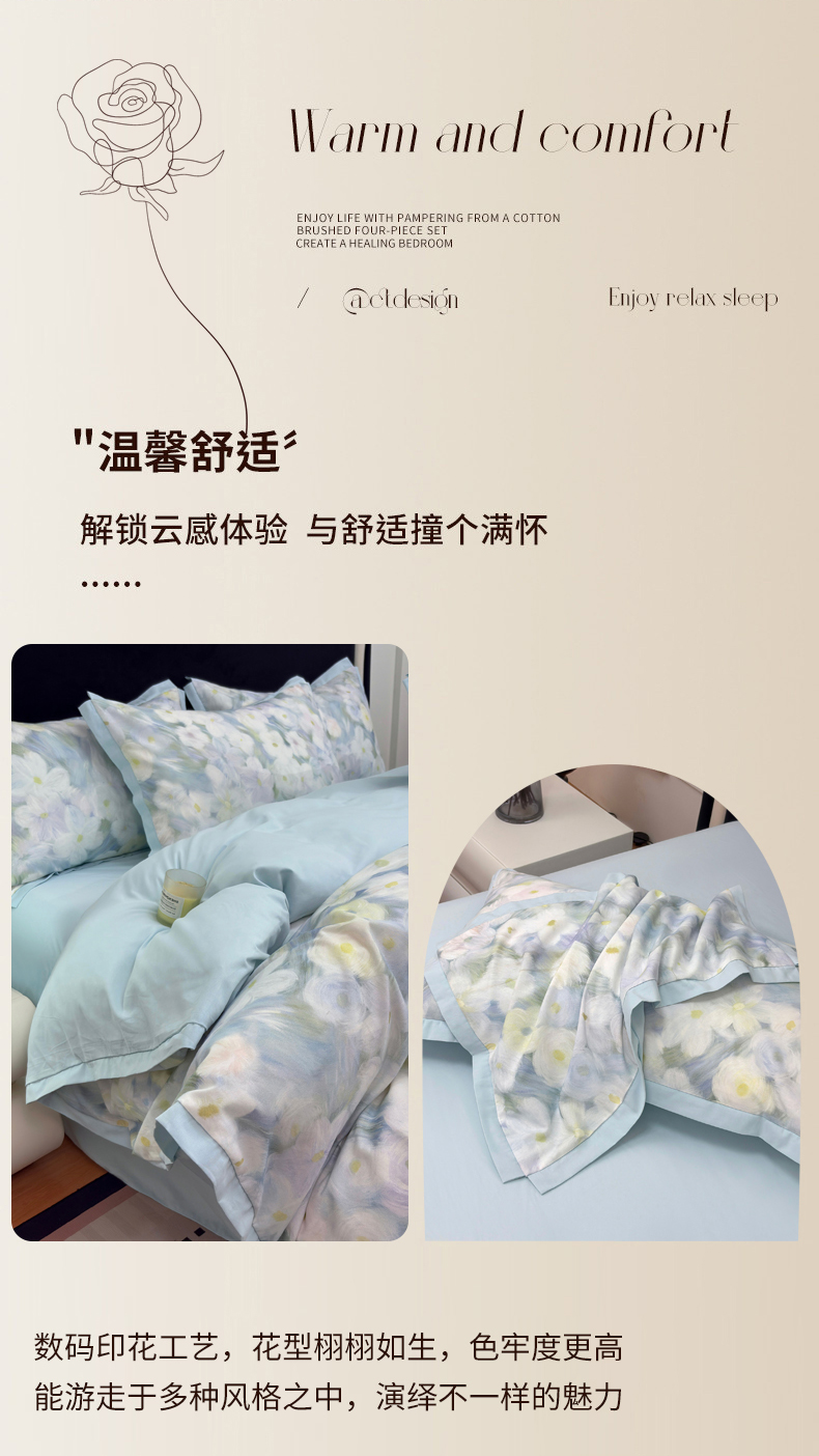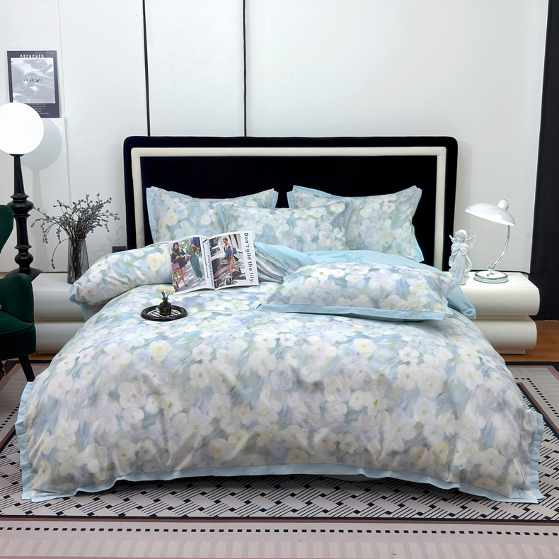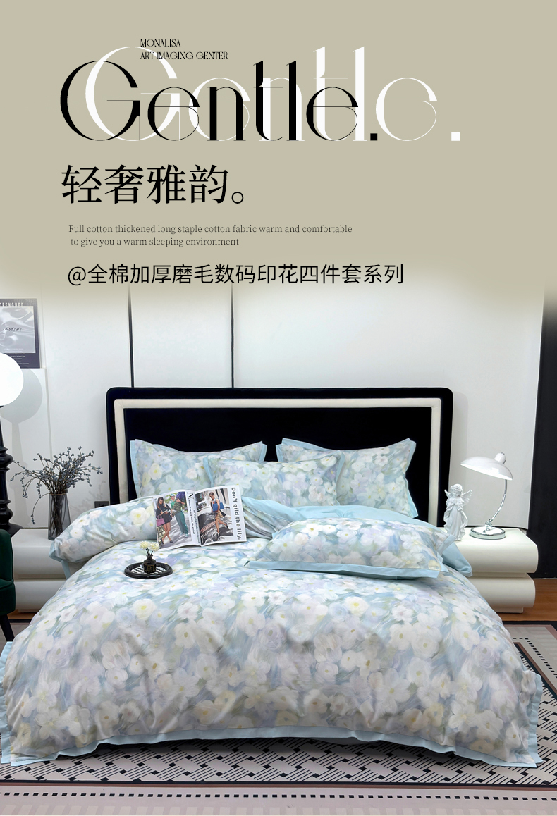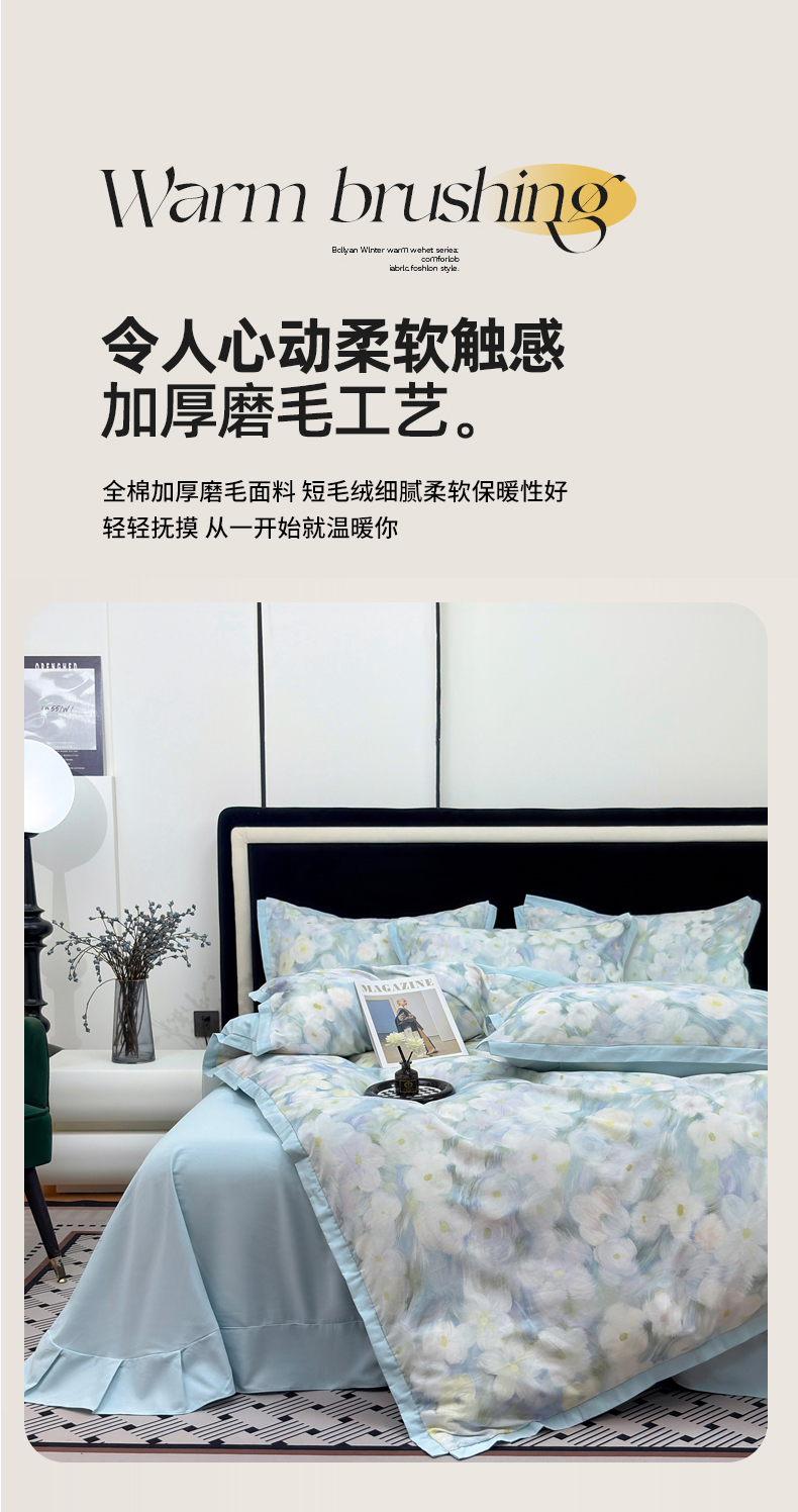 当前位置: 91家纺网 > 商品网购 > 床品套件 > 四件套 > 全棉普通四件套 > 未来家居 2025新款秋冬全棉加厚磨毛纯色印花缺角工艺系列高端礼盒包装四件套 春山花满-蓝