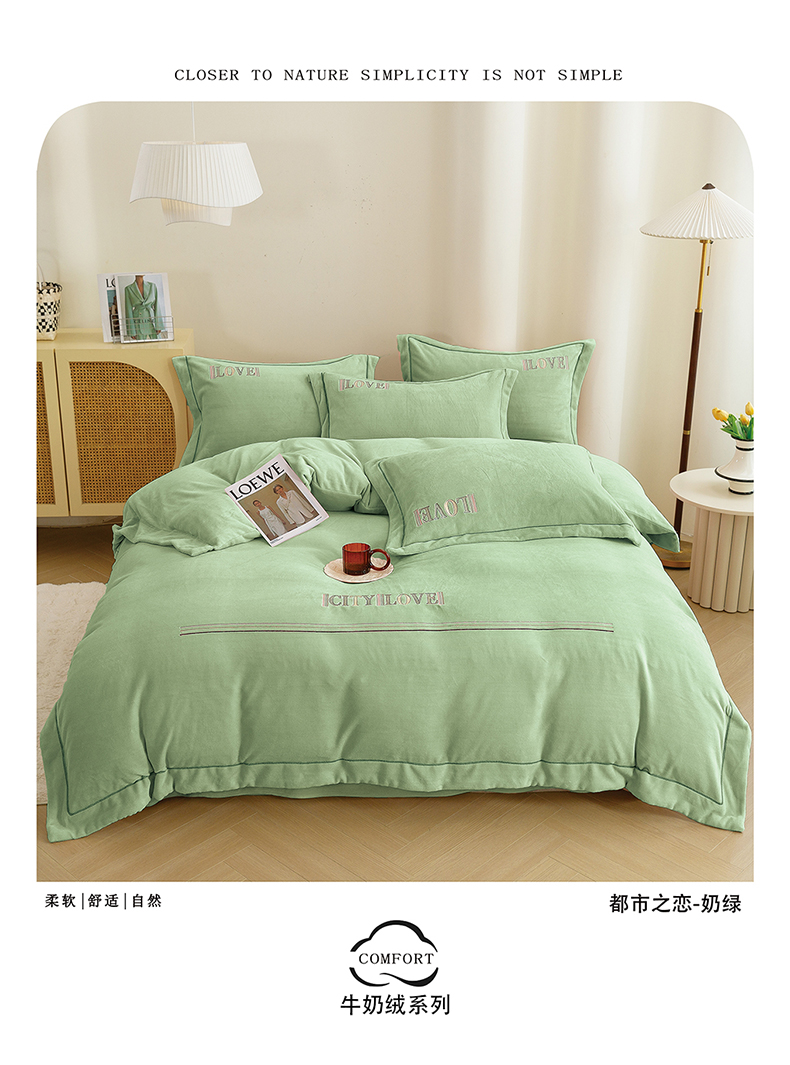 商品名称:绒博士 2025新款220克牛奶绒刺绣宽边款四件套--都市之恋系列 都市之恋-奶绿