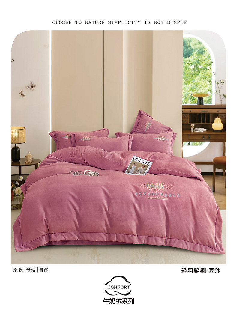 (总)绒博士 2025新款270克牛奶绒双拼角刺绣宽边款四件套--维也纳系列,维也纳-粉豆沙,维也纳-果绿,维也纳-浅咖,维也纳-浅蓝