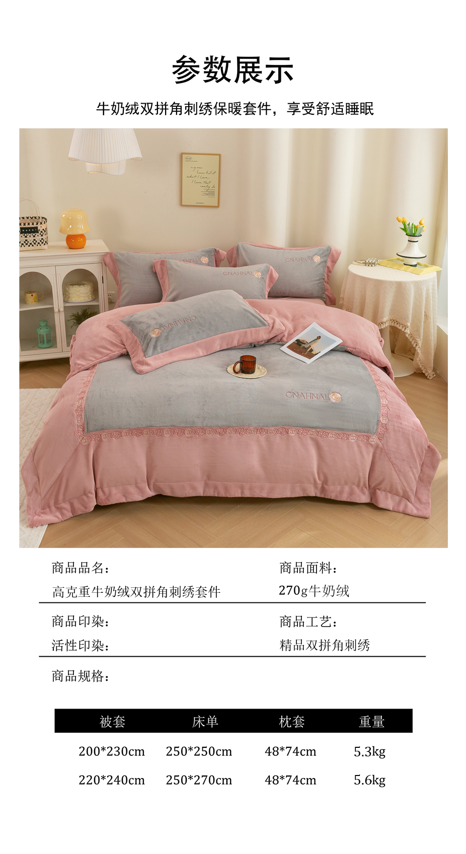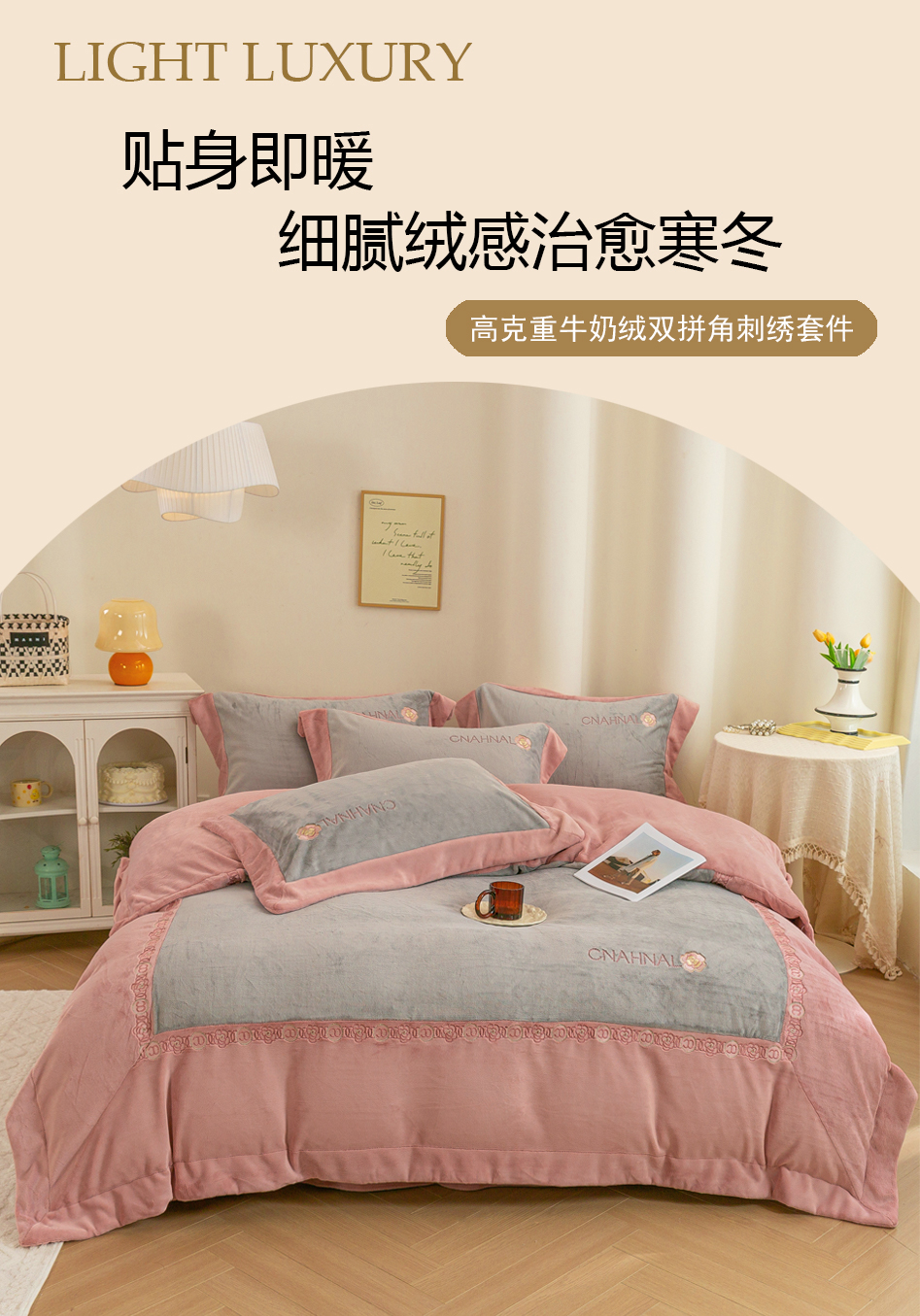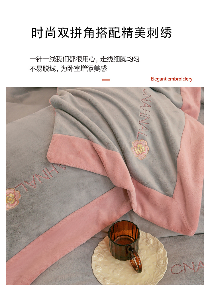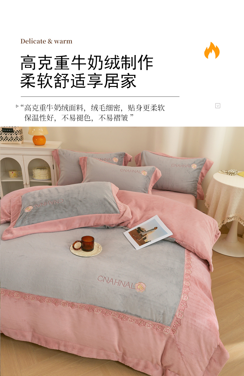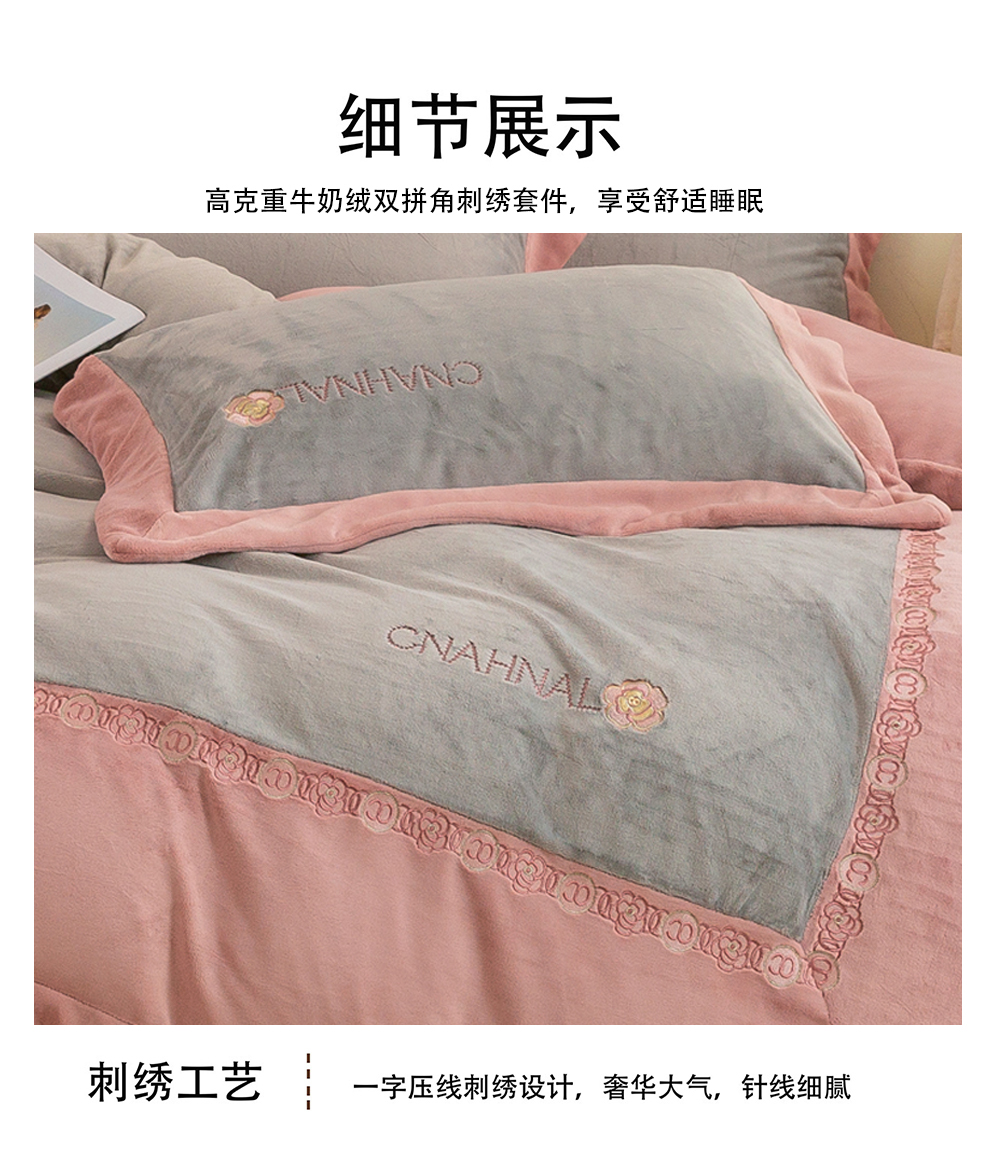 商品名称:绒博士 2025新款270克牛奶绒双拼角刺绣宽边款四件套--维也纳系列 维也纳-粉豆沙