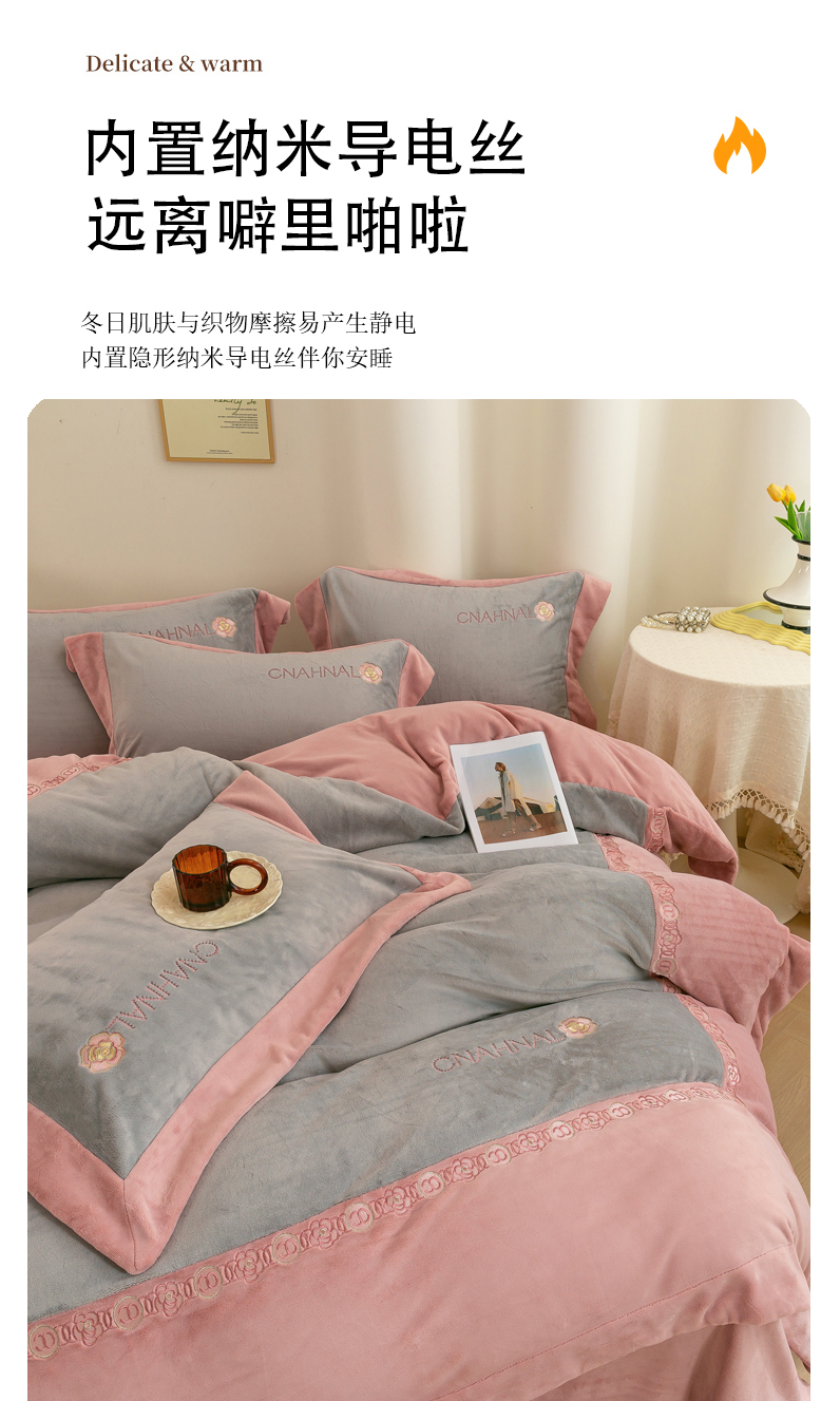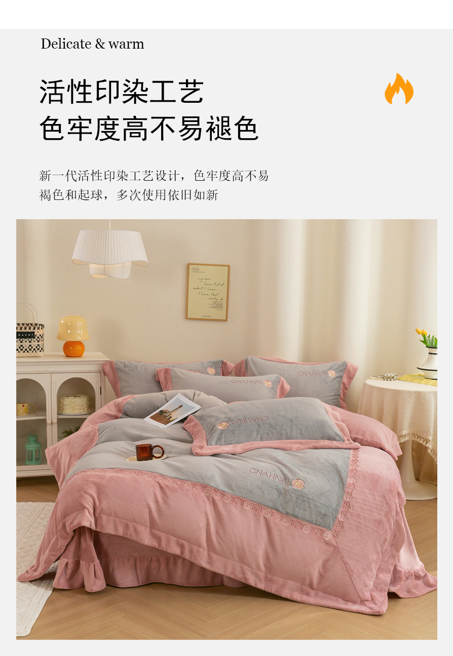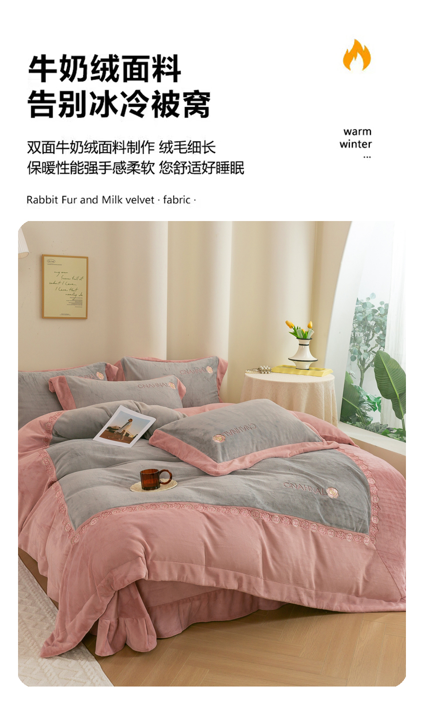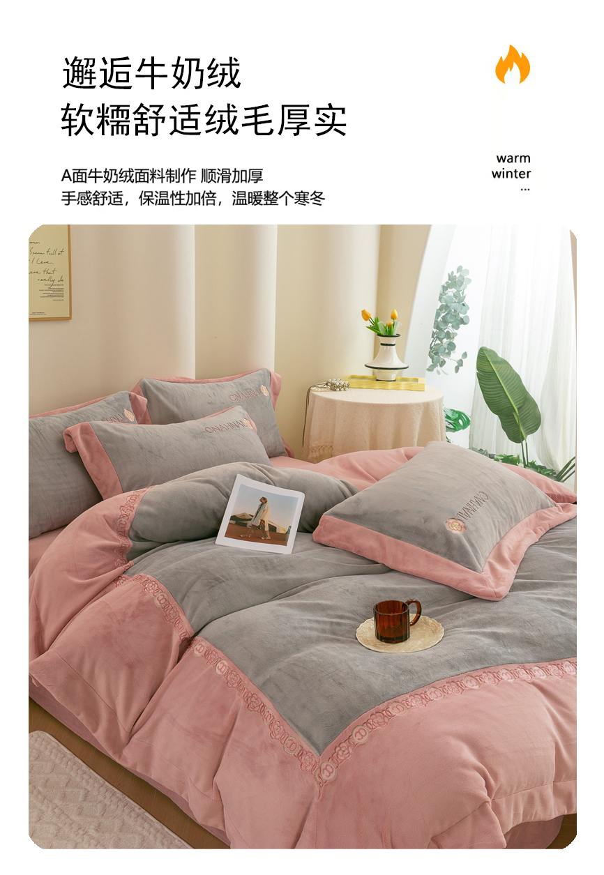 商品名称:绒博士 2025新款270克牛奶绒双拼角刺绣宽边款四件套--维也纳系列 维也纳-粉豆沙
