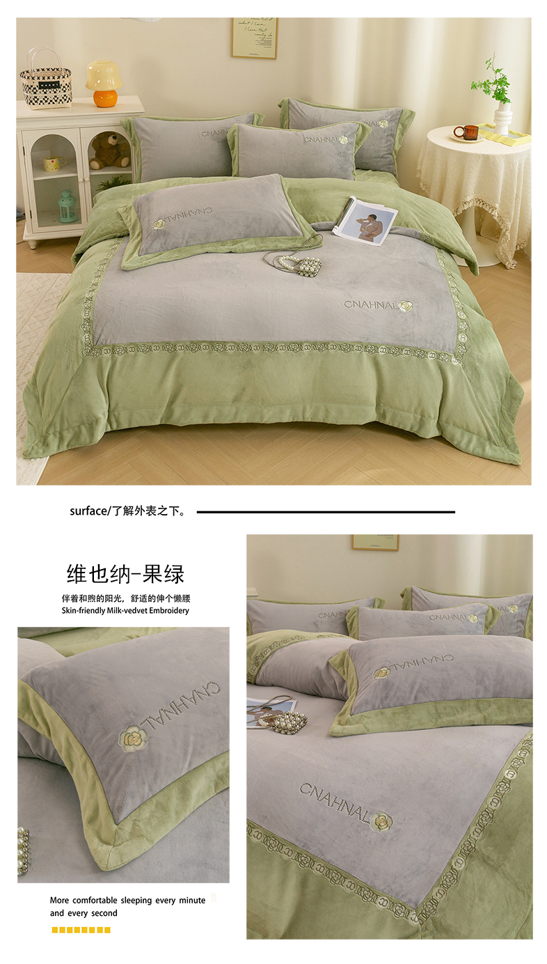 (总)绒博士 2025新款270克牛奶绒双拼角刺绣宽边款四件套--维也纳系列,维也纳-粉豆沙,维也纳-果绿,维也纳-浅咖,维也纳-浅蓝