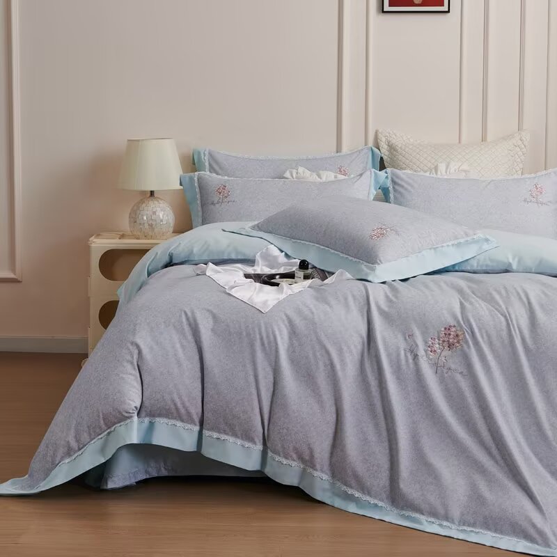 总玖玖爱家纺 纯棉100支贡缎长绒棉刺绣被套三件套四件套加大四件套,白色,高级灰,卡其,蓝灰,绿色,浅桔,深蓝,紫豆沙