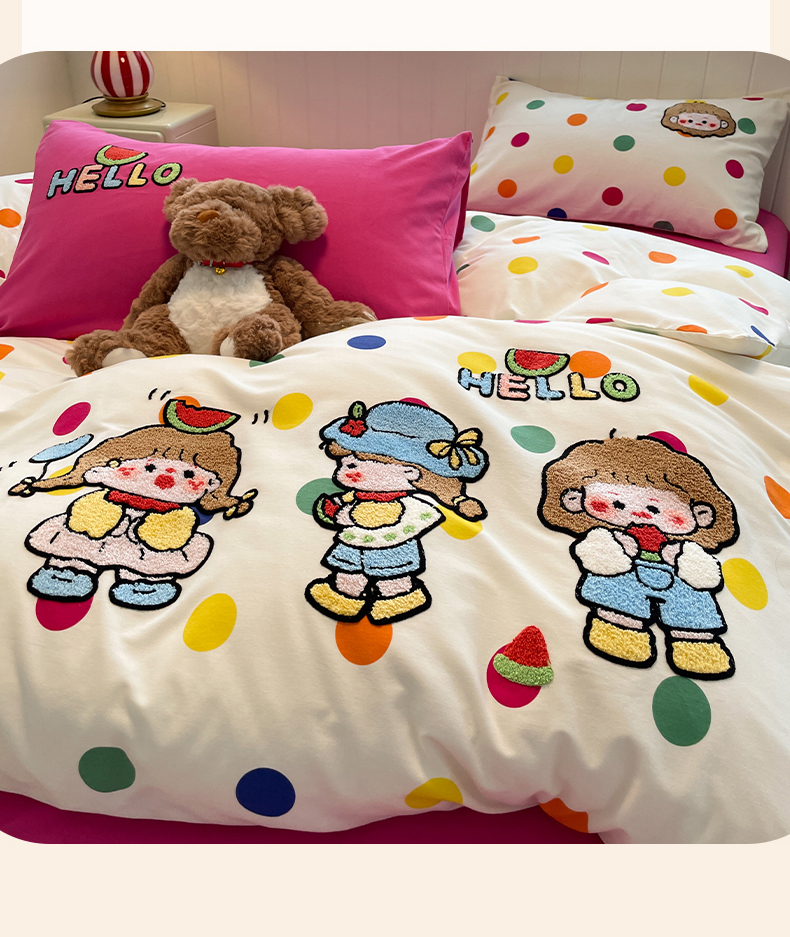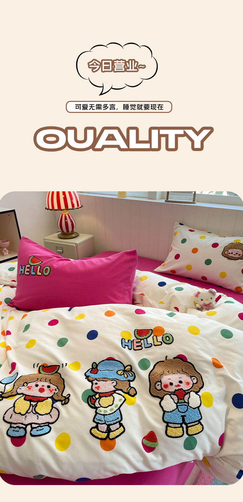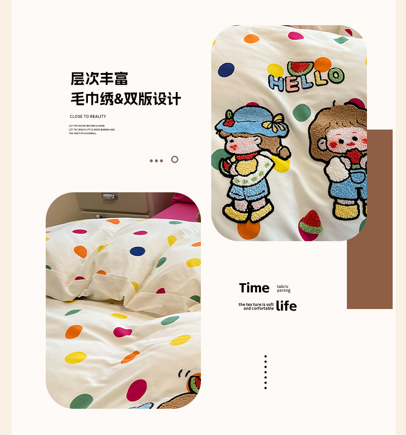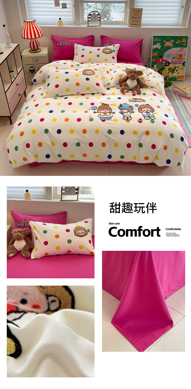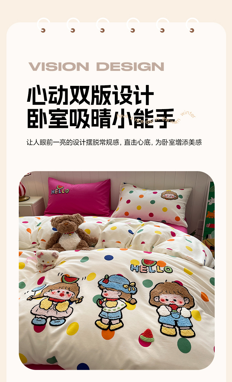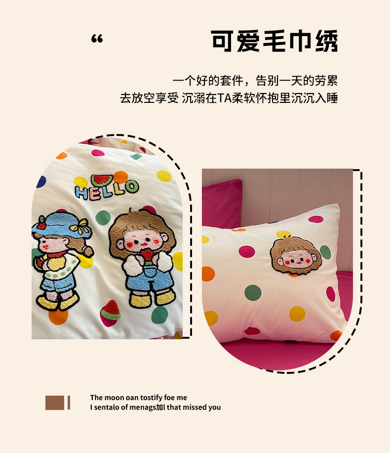 当前位置: 91家纺网 > 商品网购 > 床品套件 > 四件套 > 普通磨毛四件套 > 蓝邻家纺 2025新款全棉磨毛卡通刺绣款四件套--毛巾绣系列 甜趣玩伴
