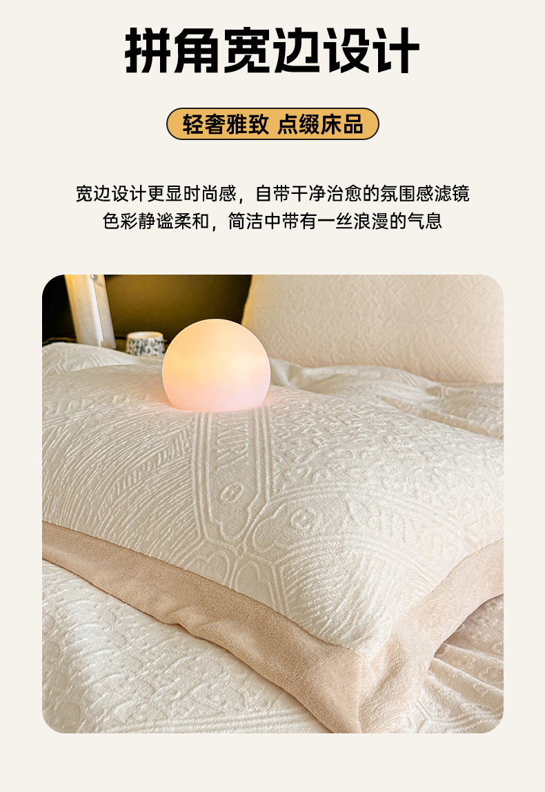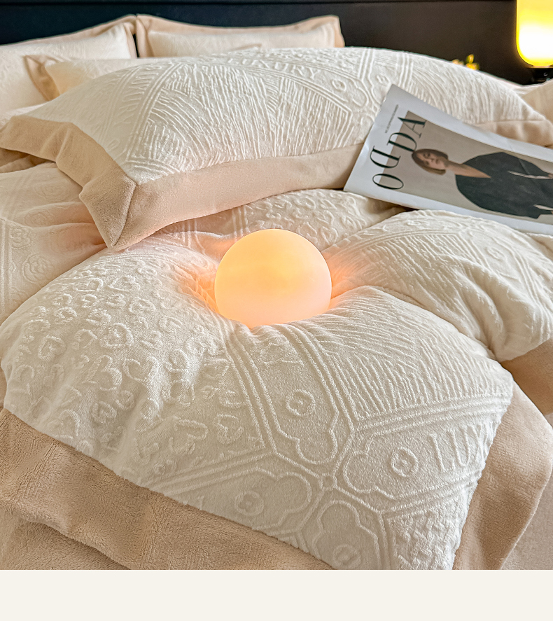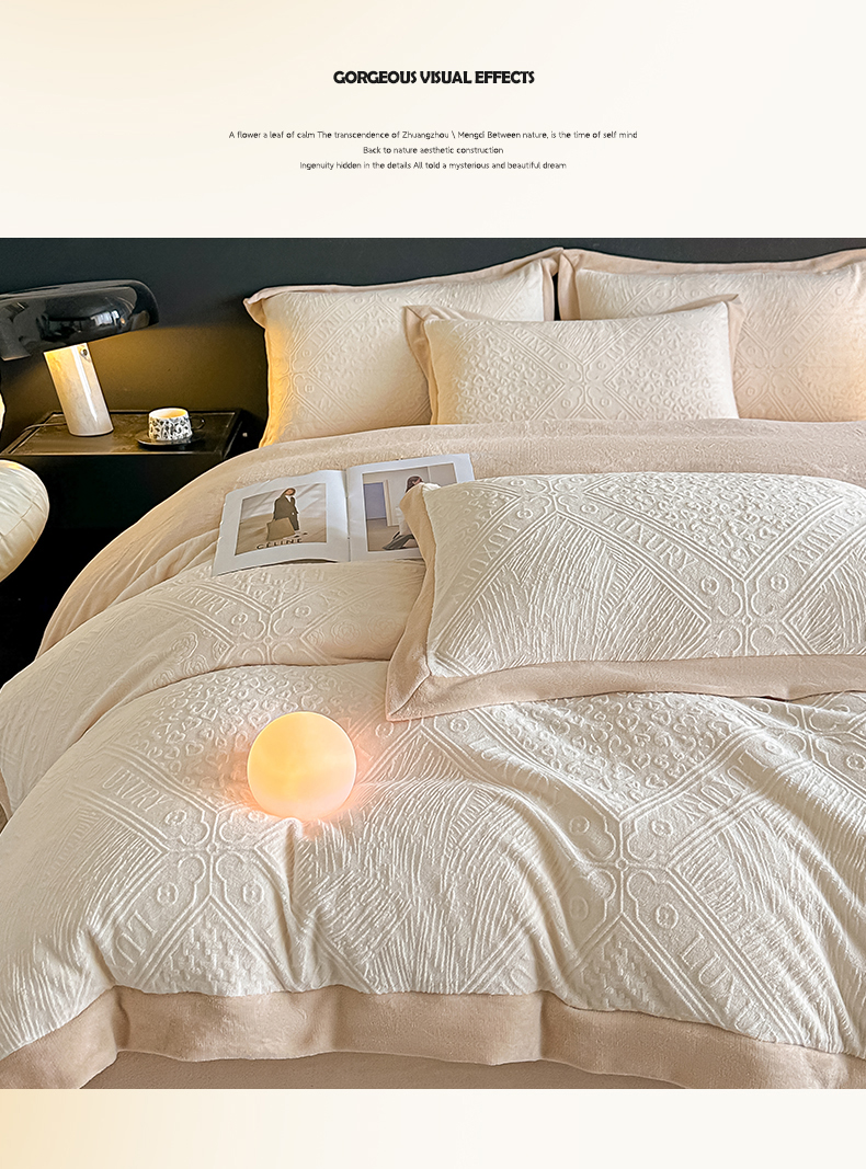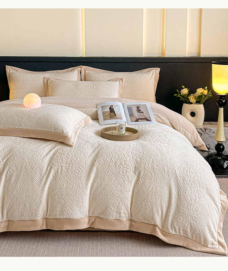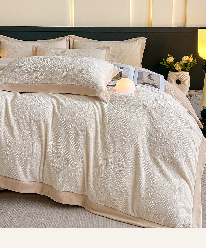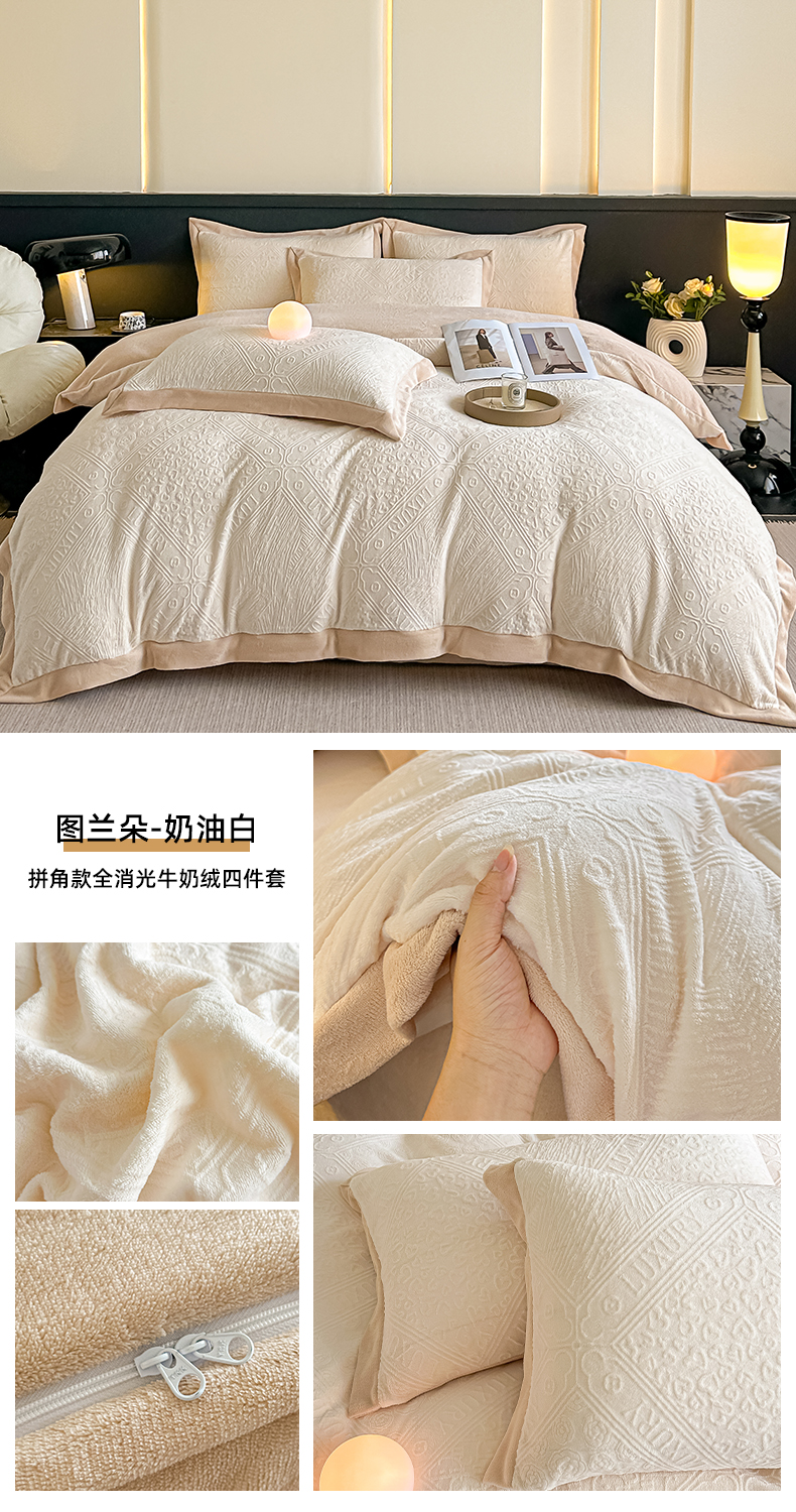 当前位置: 91家纺网 > 商品网购 > 床品套件 > 四件套 > 牛奶绒四件套 > 亿梵家居 2025秋冬新款-拼角款A类全消光牛奶绒立体5D雕花绒四件套 图兰朵-奶油白