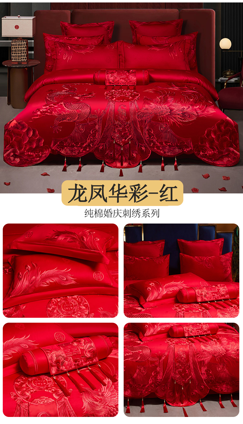 当前位置: 91家纺网 > 商品网购 > 床品套件 > 四件套 > 婚庆四件套 > 红番天家居馆 (控价)2025新款纯棉贡缎提花婚庆四件套(每款供货价的基础上一切活动券后+100) 龙凤华彩-红