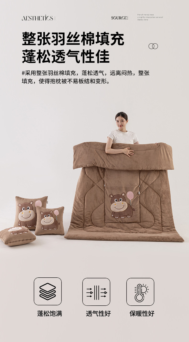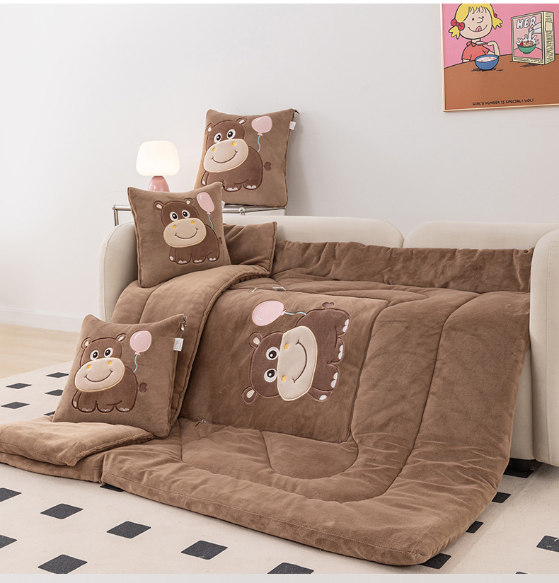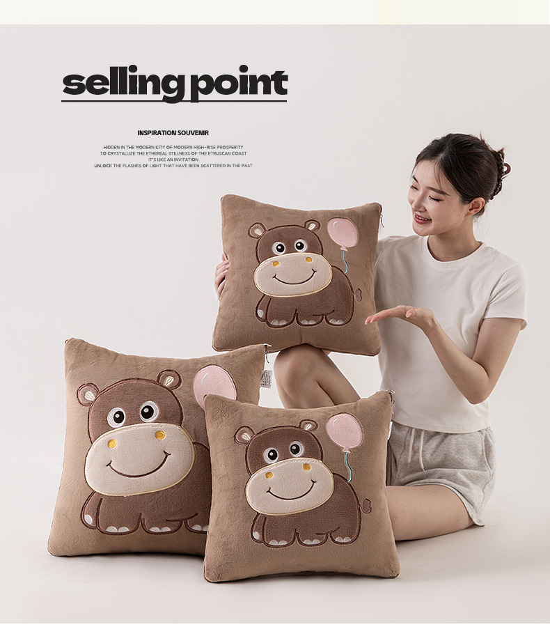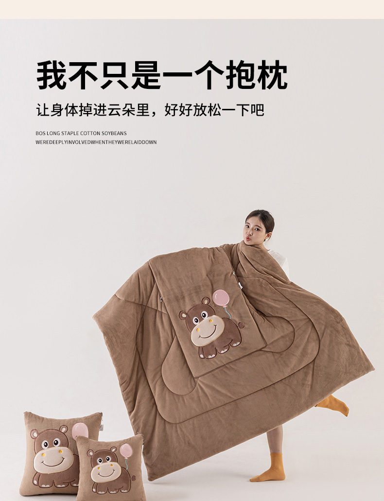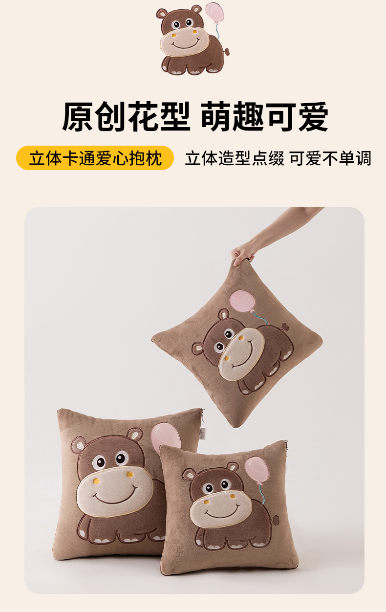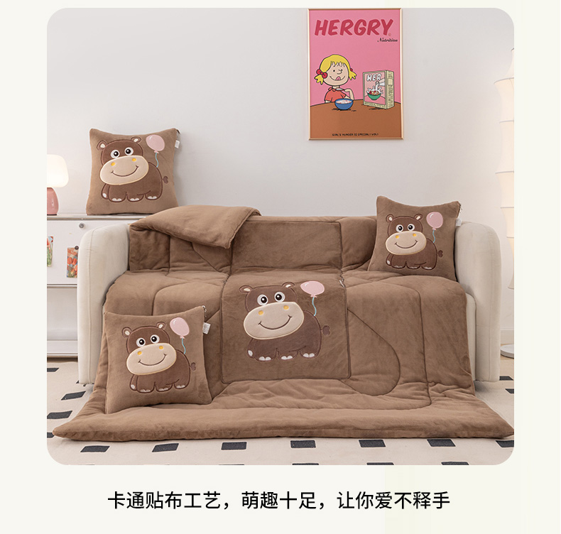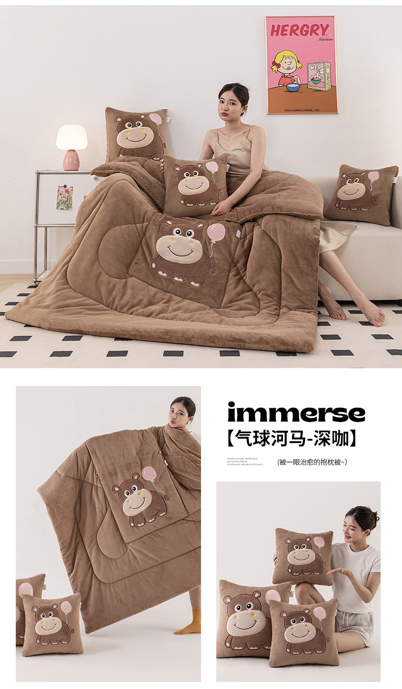 商品名称:哩哩熊 2025新款抱枕被子两用加厚牛奶绒二合一汽车载枕头办公室午睡毯子冬天-气球河马 气球河马-深咖