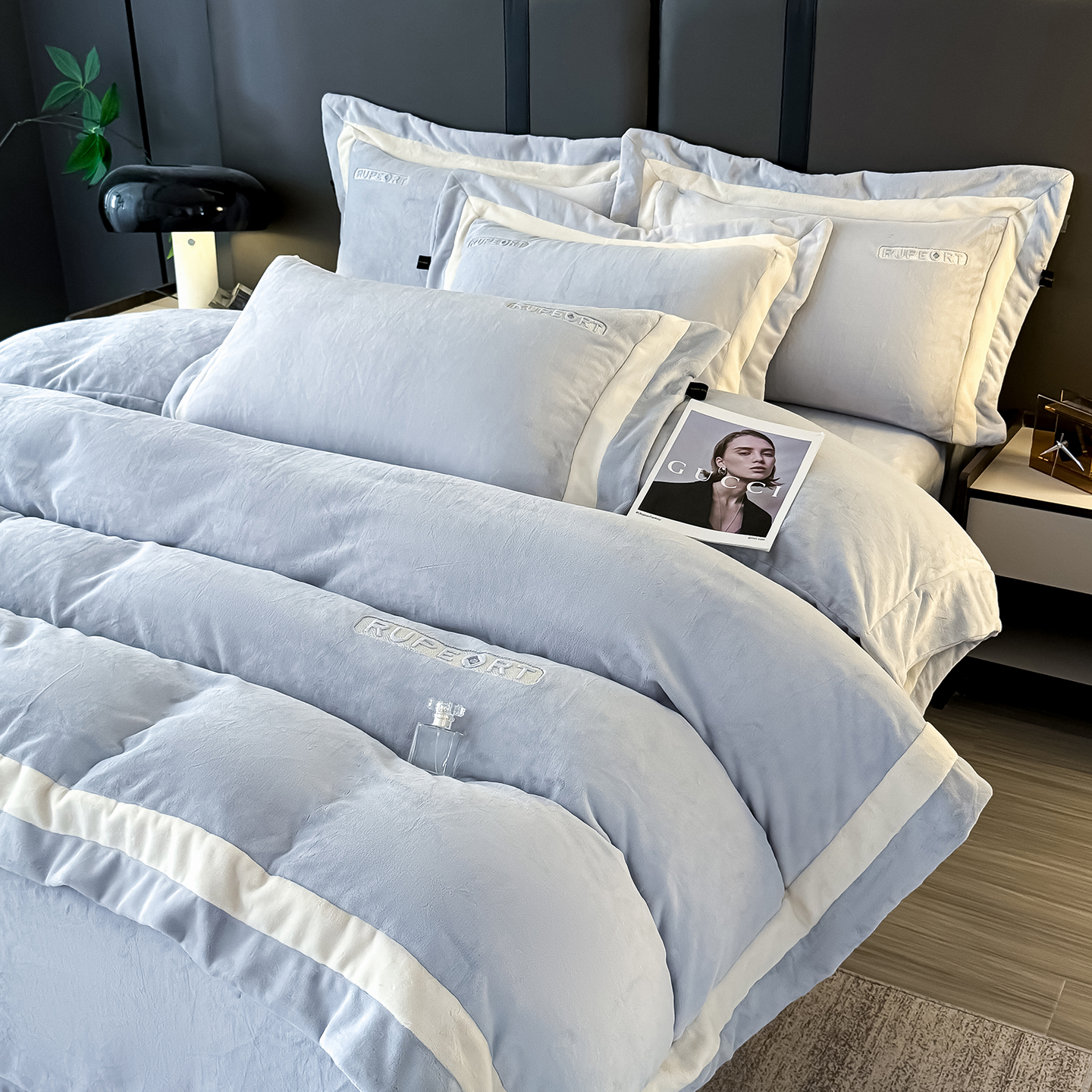 恋尚羽家纺 2025新款超厚云芙绒宽边牛奶绒四件套 奢华-天空蓝