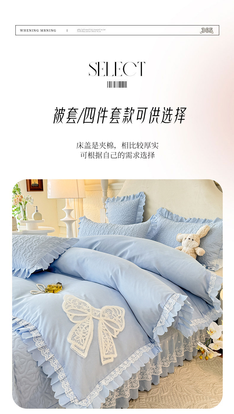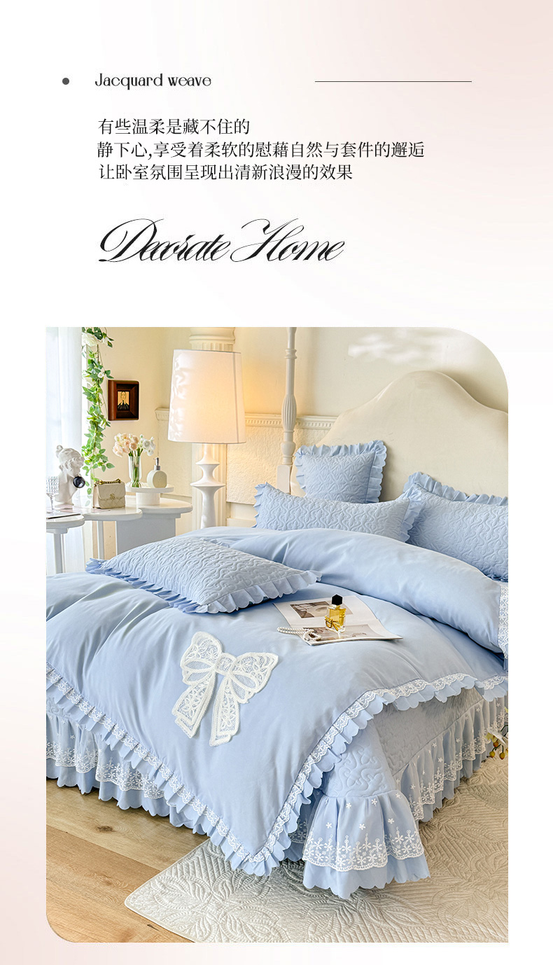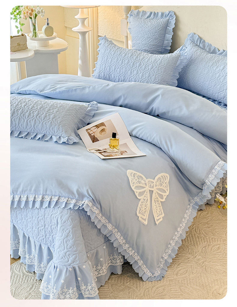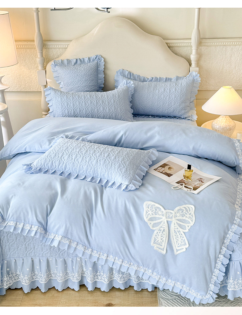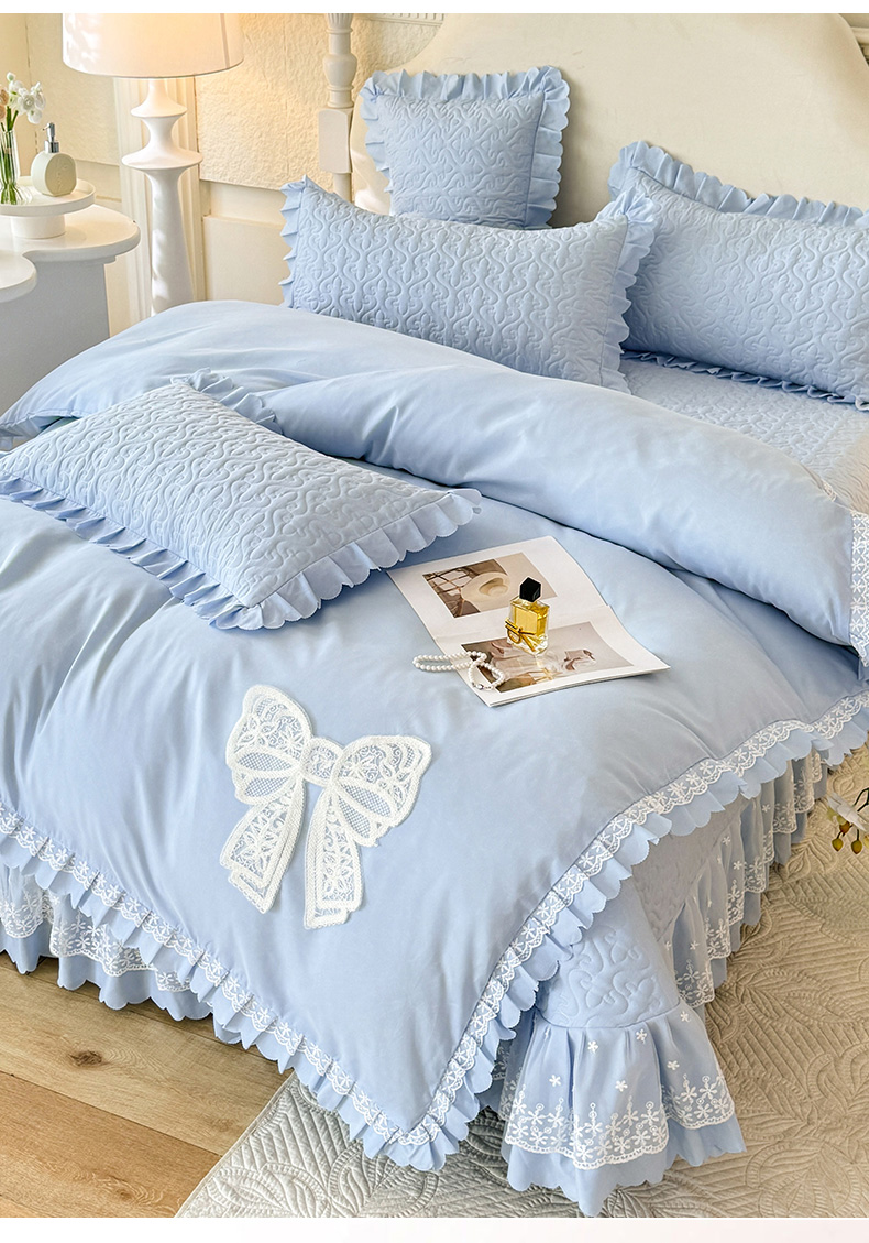 当前位置: 91家纺网 > 商品网购 > 床品套件 > 四件套 > 其它四件套 > 后庭寝室 2025新款法式公主风亲肤床盖四件套-蝶恋系列 蝶恋-浅蓝