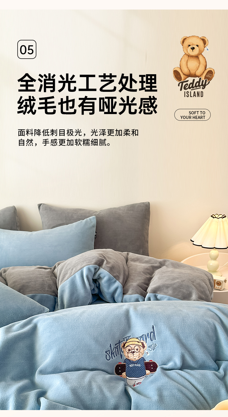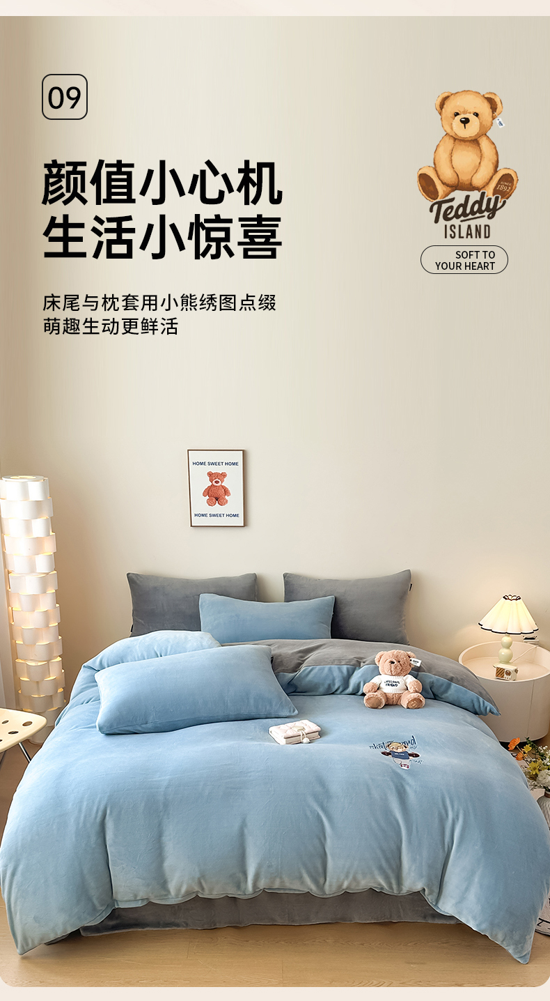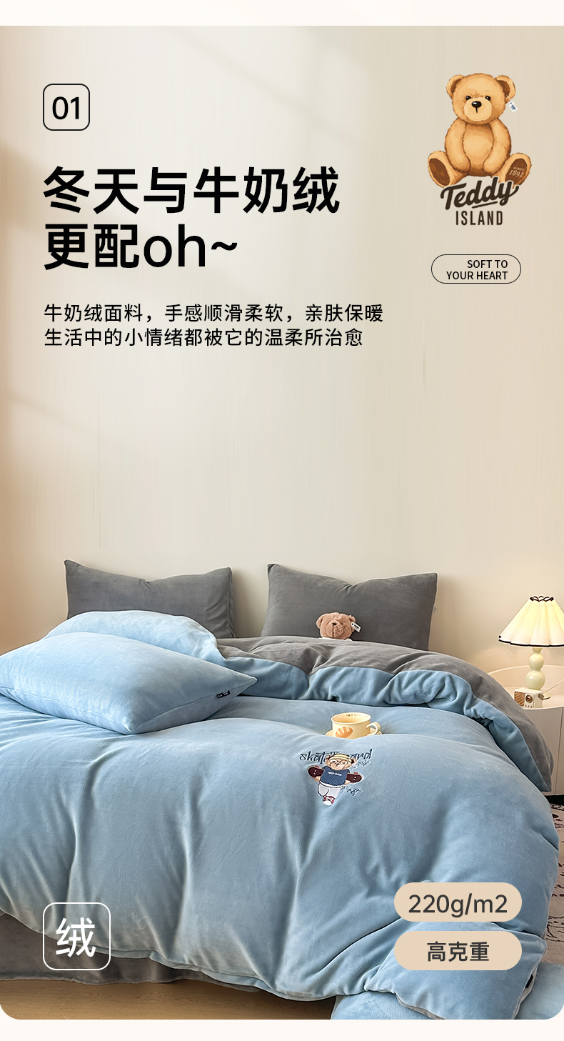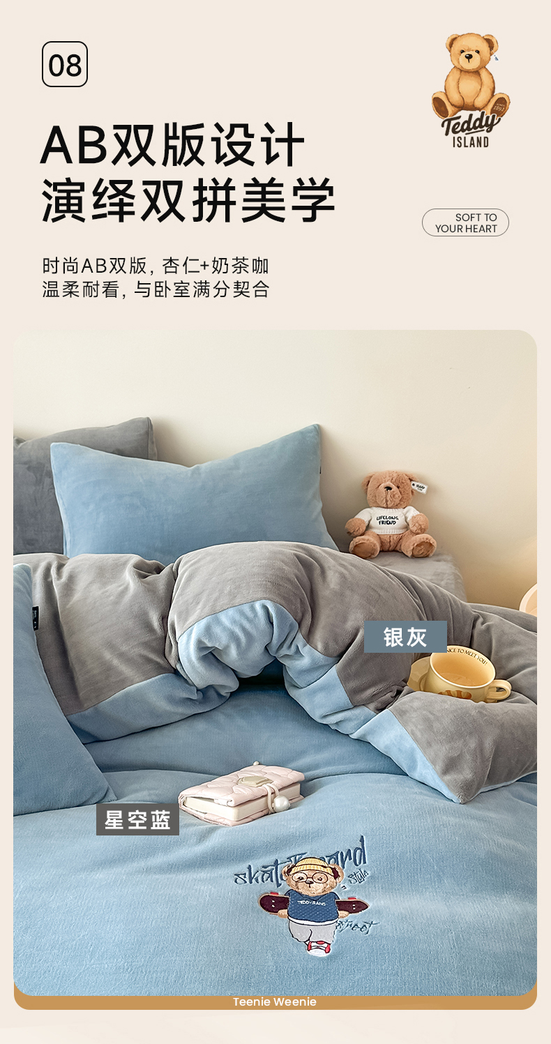 (总)泰迪爱兰Teddy ISLAND 2025新款牛奶绒绣花四件套,粉色+杏仁色,可可色+杏仁色,雾霾灰+神秘灰,香芋紫+神秘灰,杏仁色+可可色,杏仁色+神秘灰