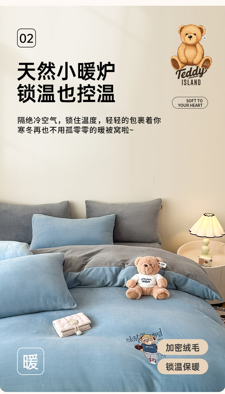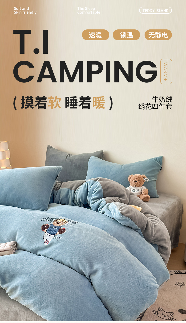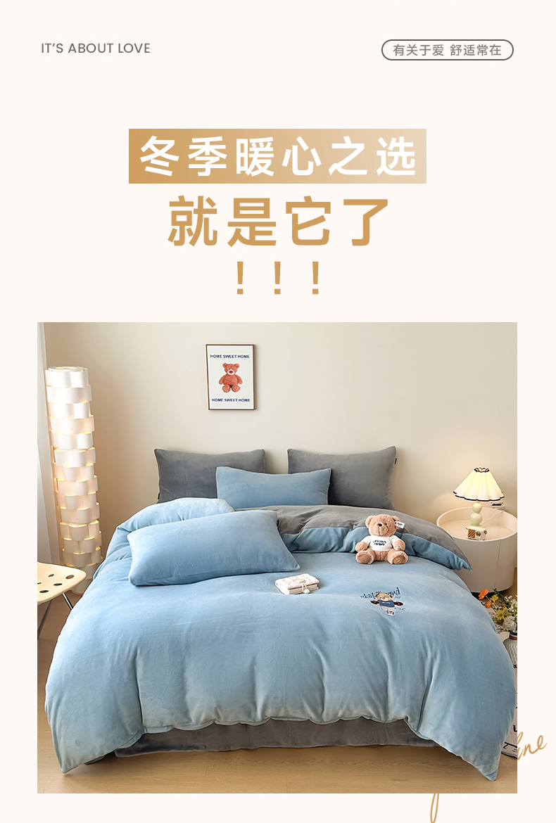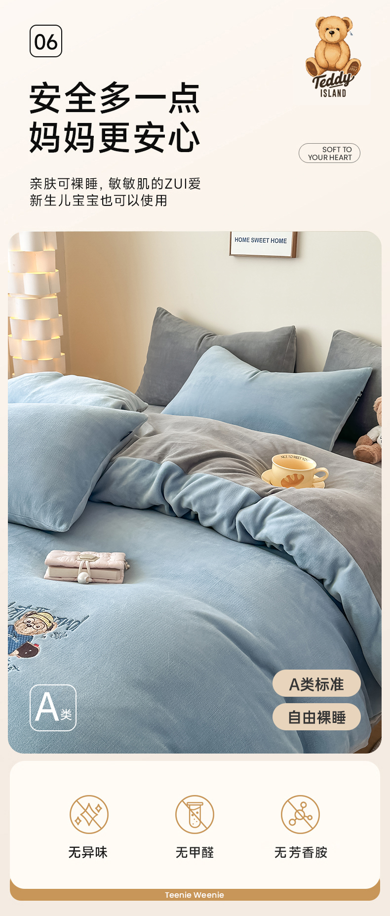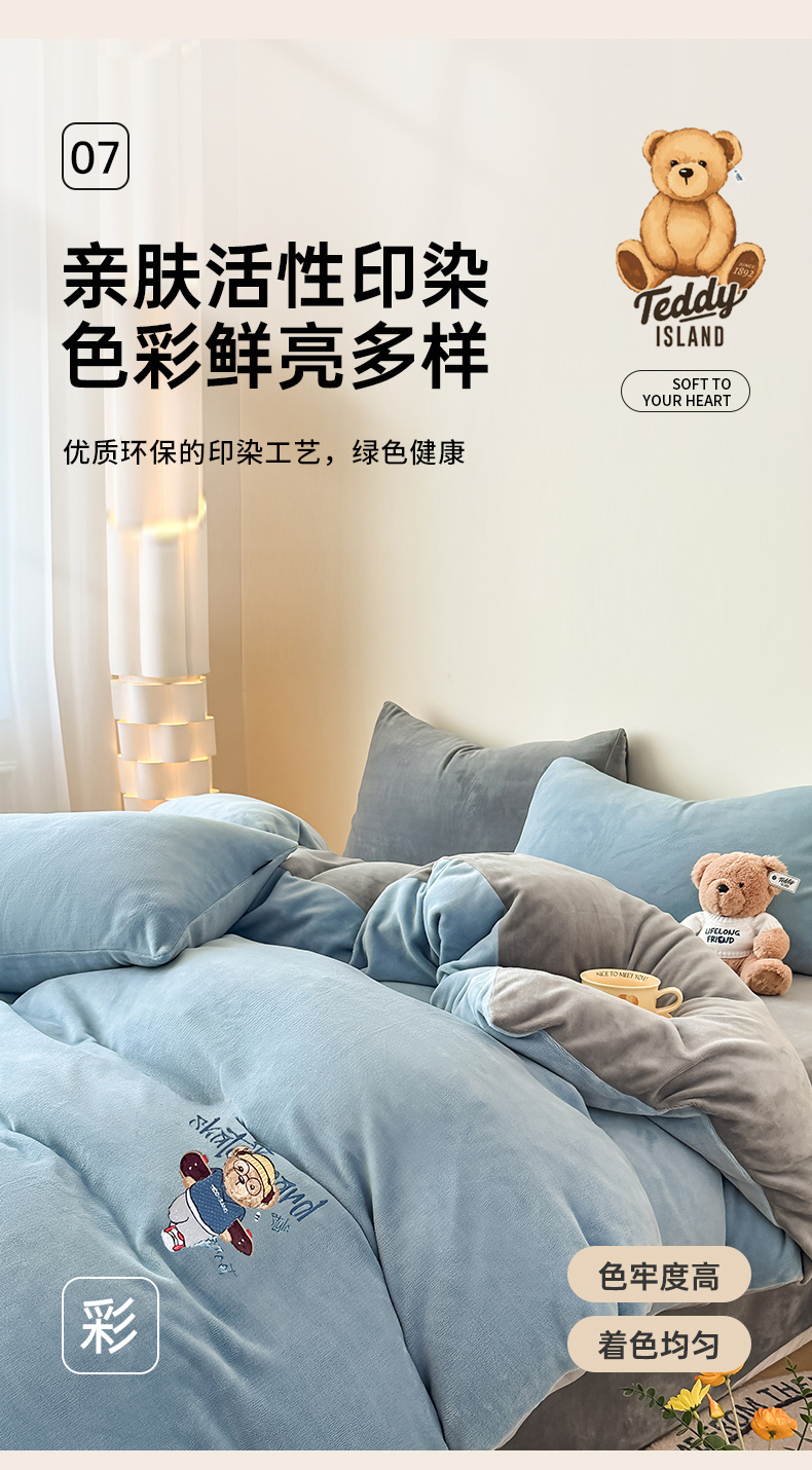 (总)泰迪爱兰Teddy ISLAND 2025新款牛奶绒绣花四件套,粉色+杏仁色,可可色+杏仁色,雾霾灰+神秘灰,香芋紫+神秘灰,杏仁色+可可色,杏仁色+神秘灰