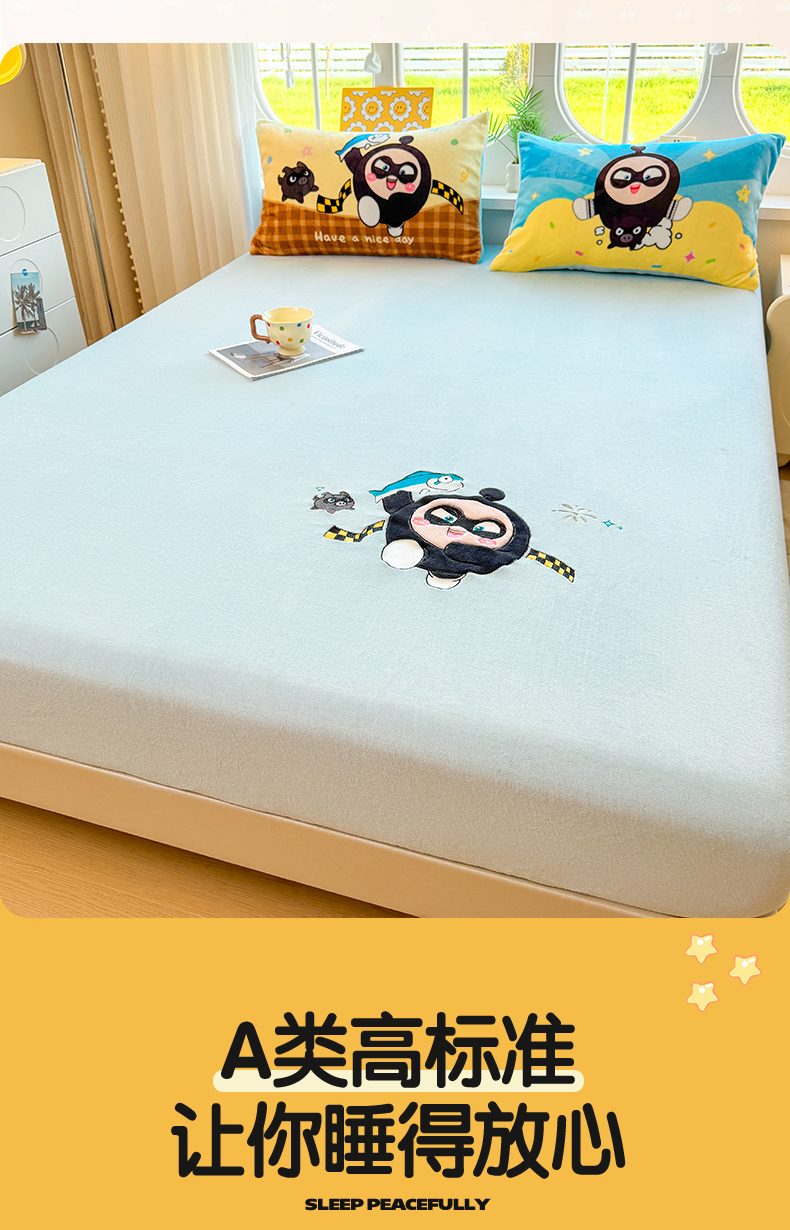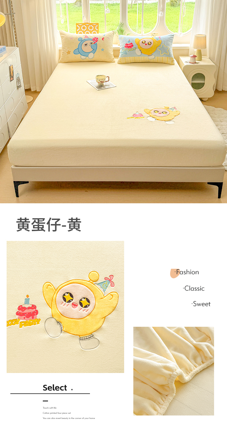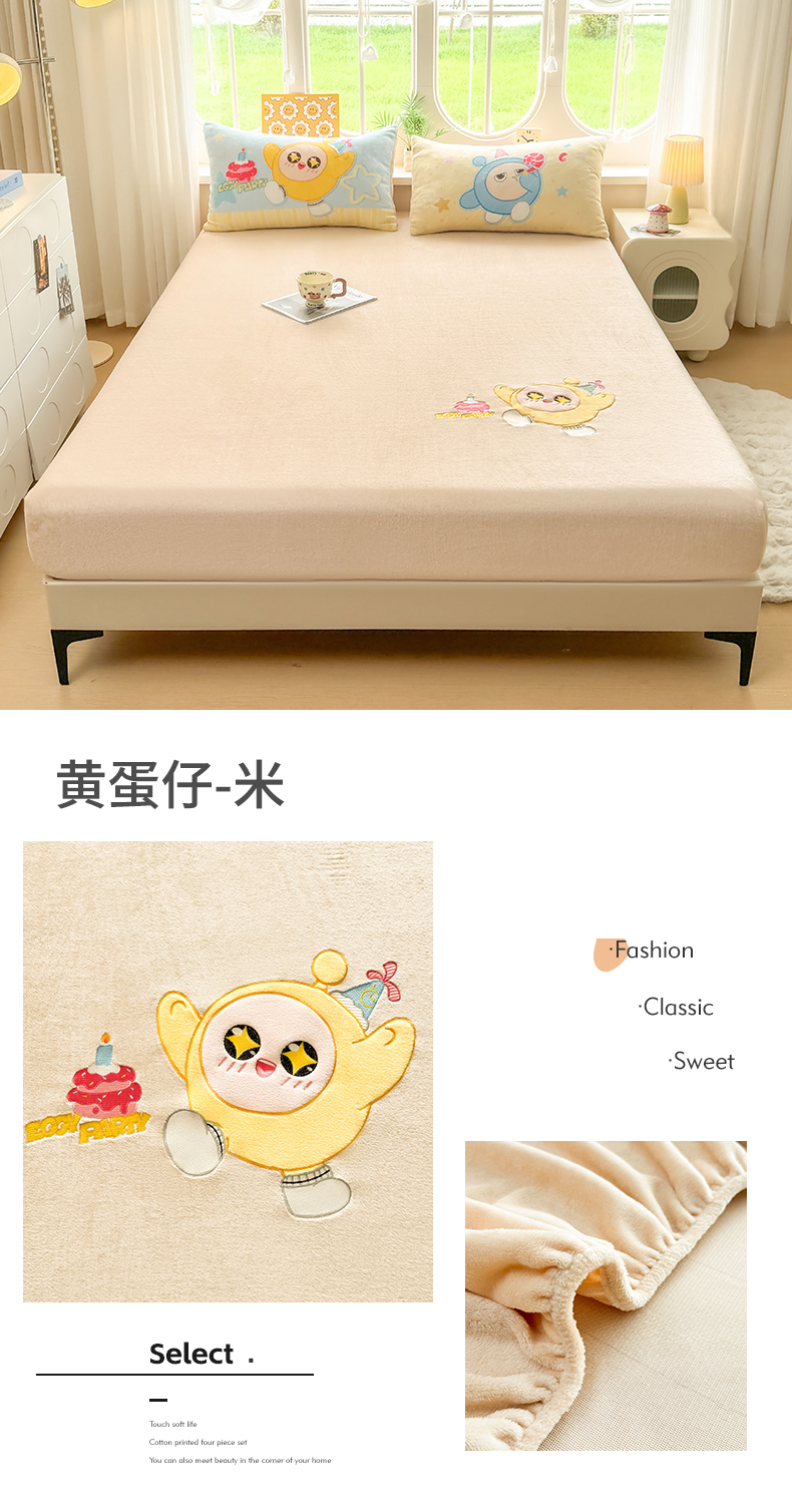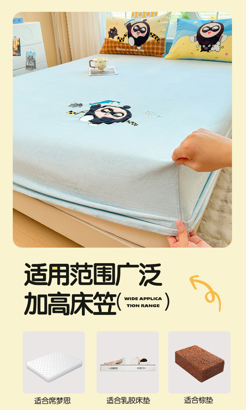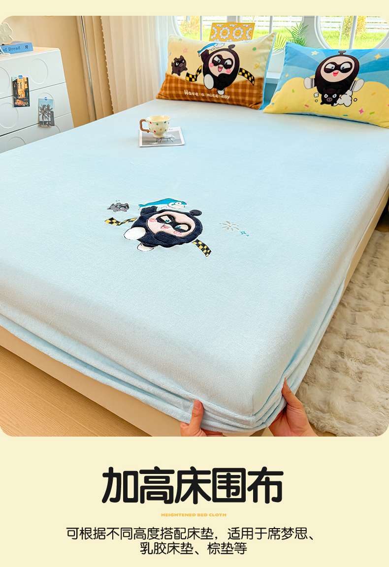 商品名称:(总)雯豆家纺 正版授权IP纯色贴布绣牛奶绒床笠三件套加厚卡通床垫保护套