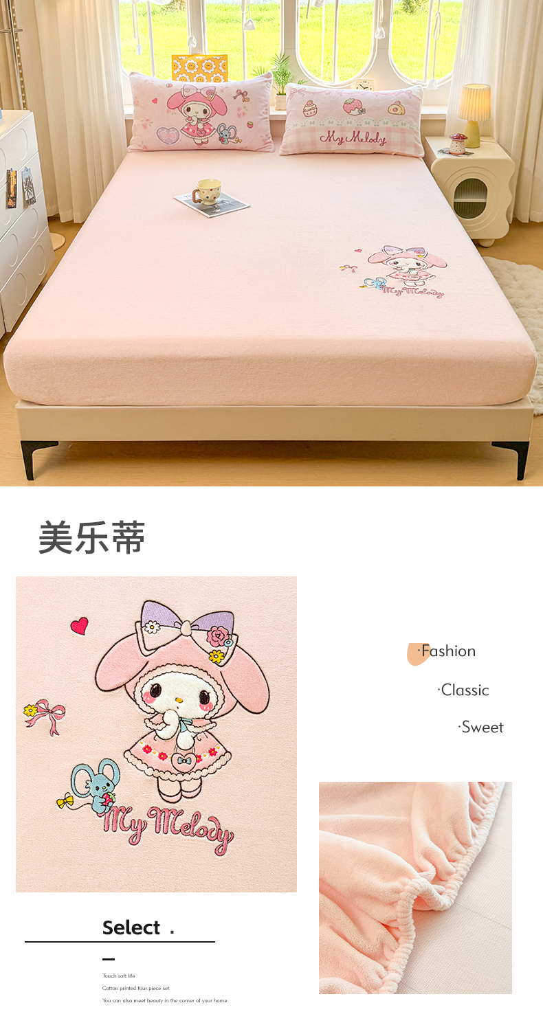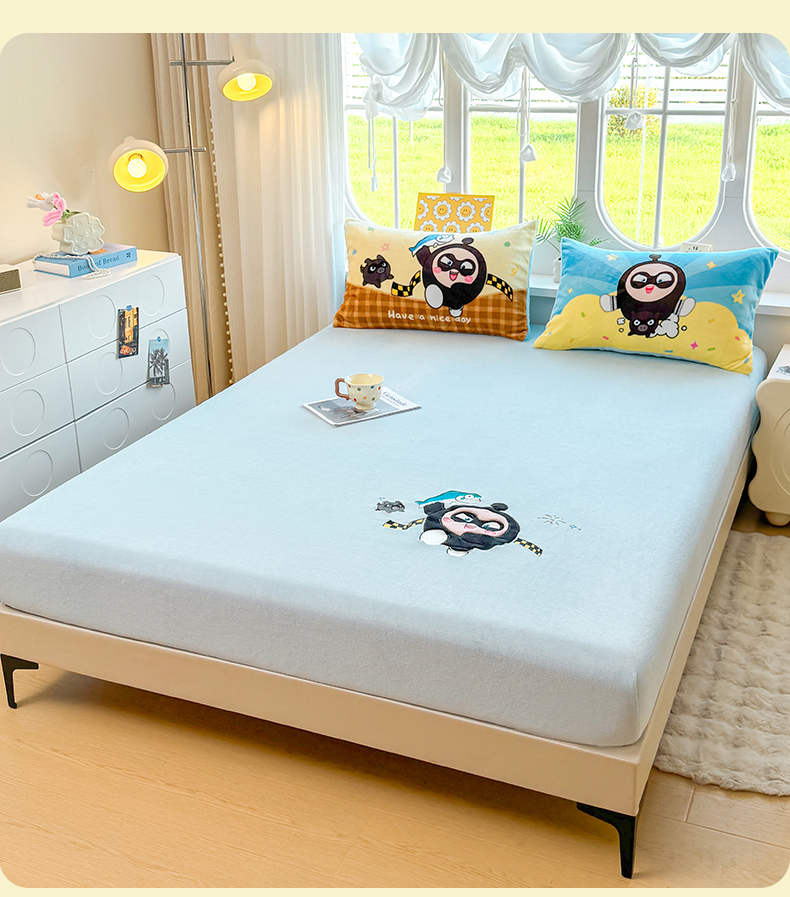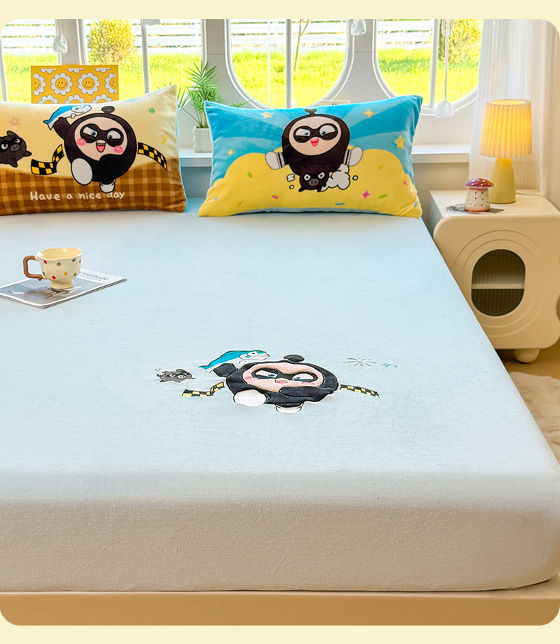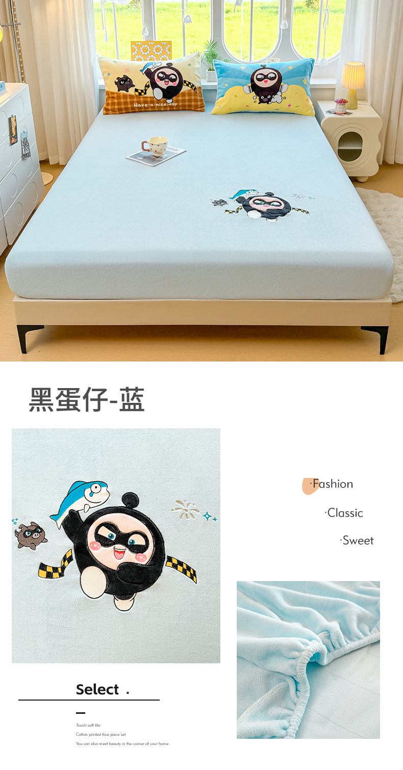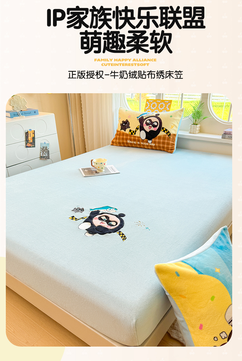 (总)雯豆家纺 正版授权IP纯色贴布绣牛奶绒床笠三件套加厚卡通床垫保护套