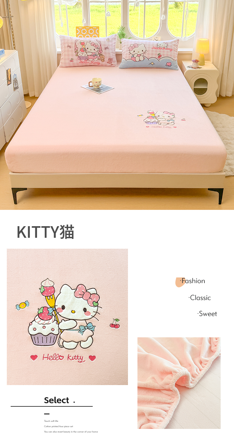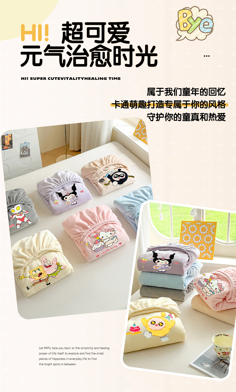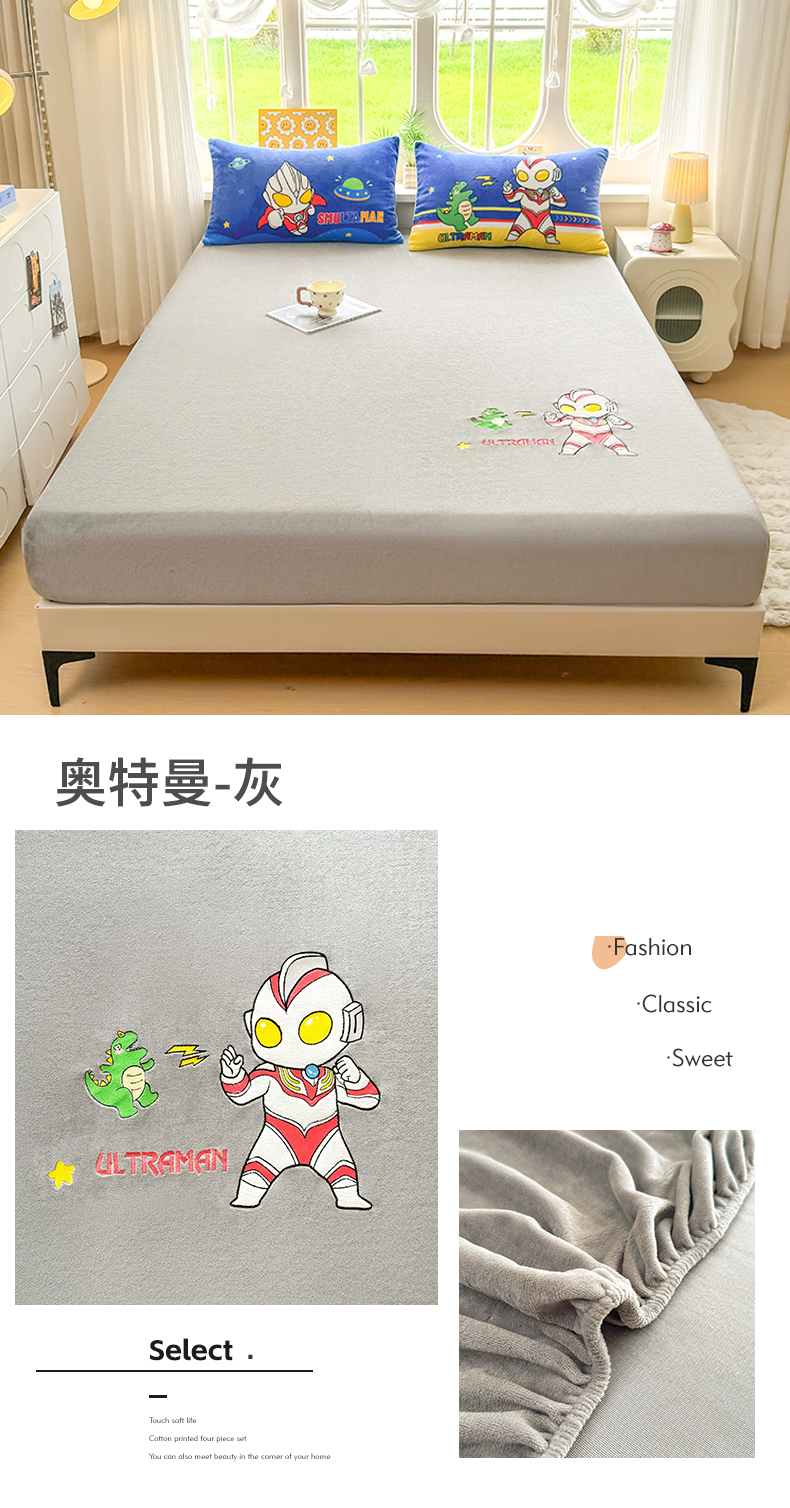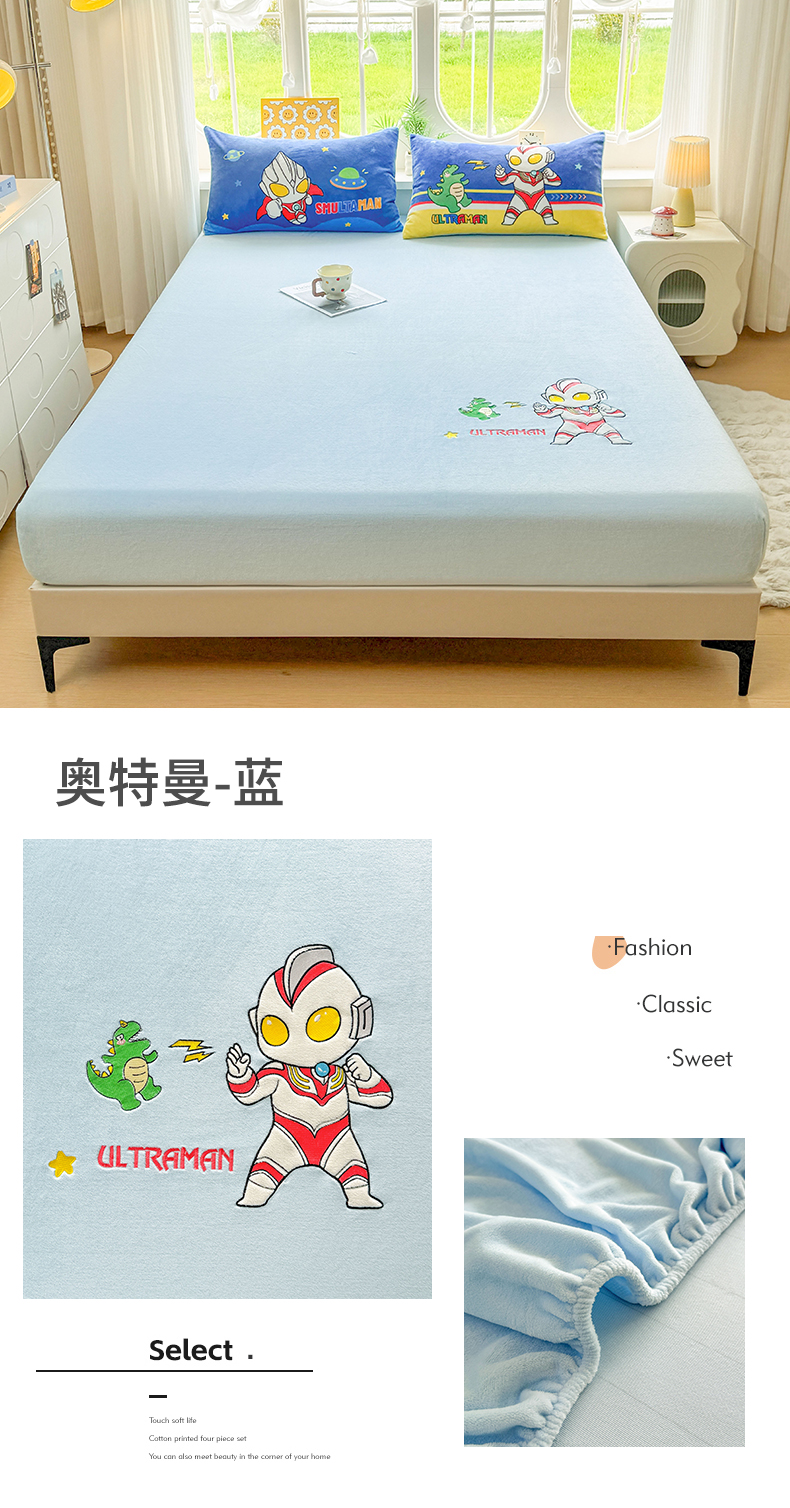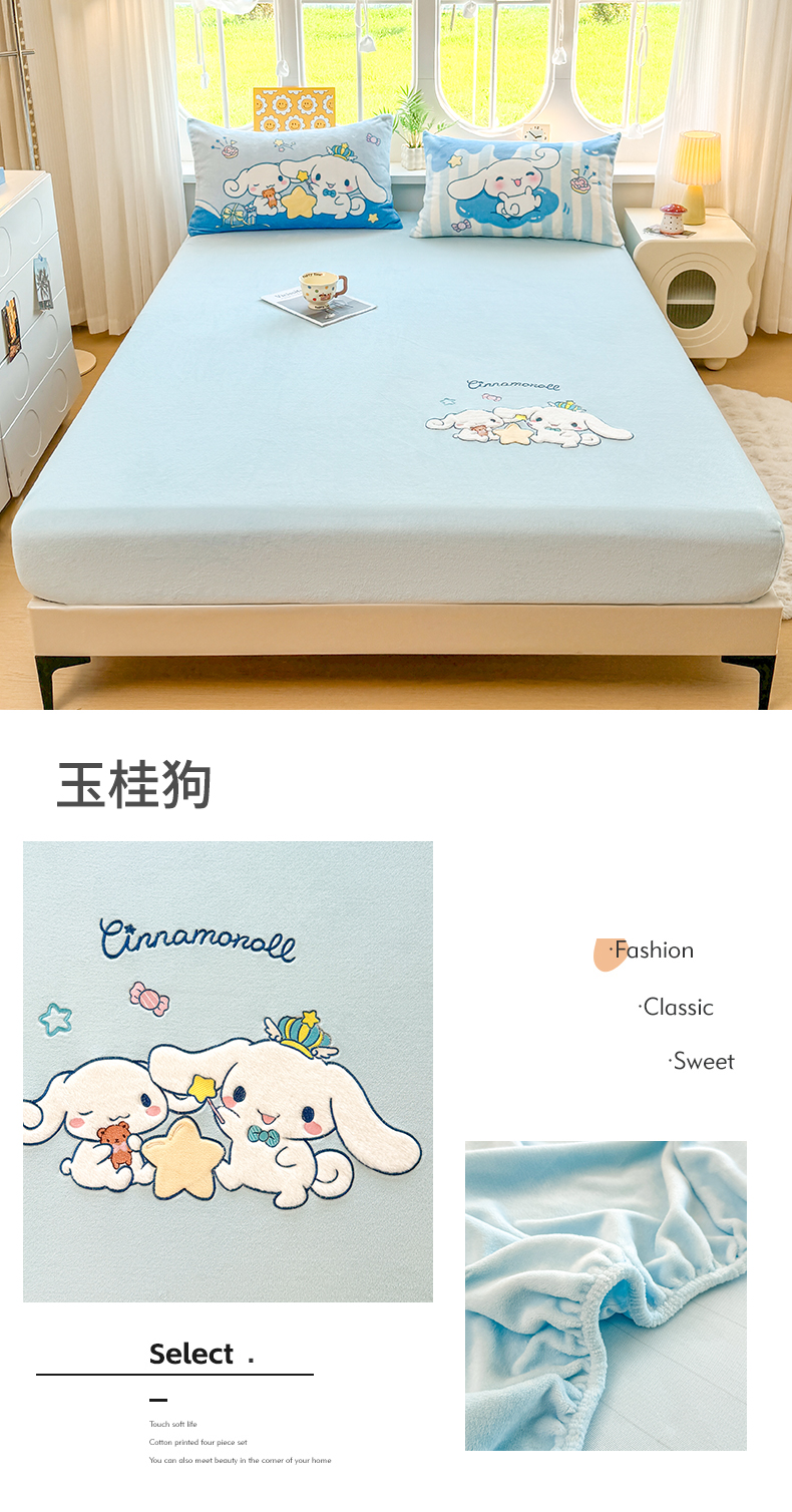 (总)雯豆家纺 正版授权IP纯色贴布绣牛奶绒床笠三件套加厚卡通床垫保护套