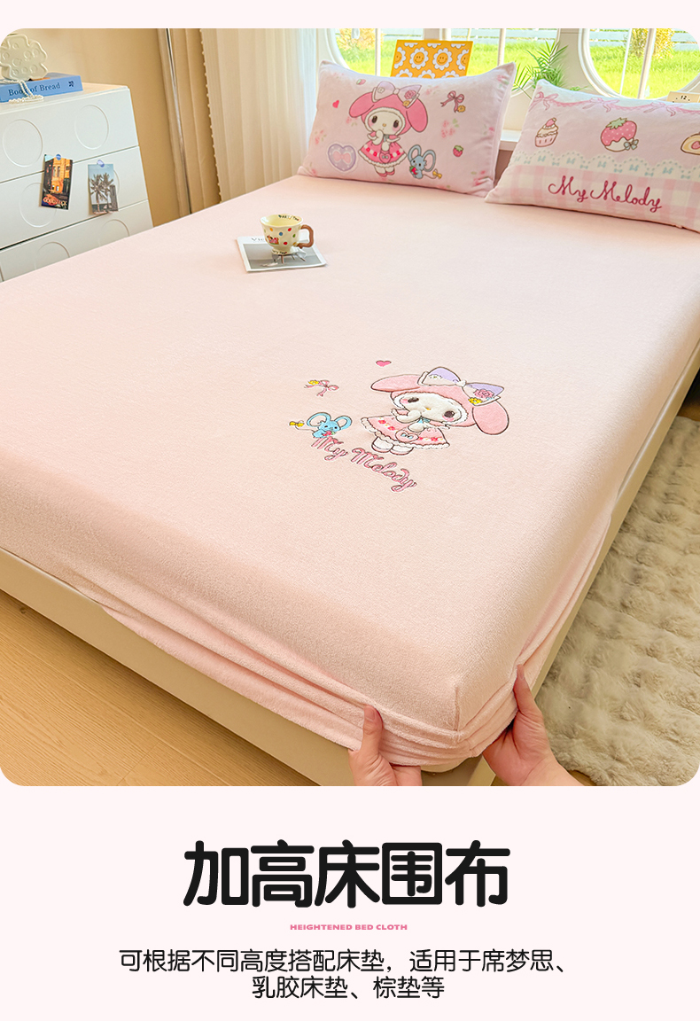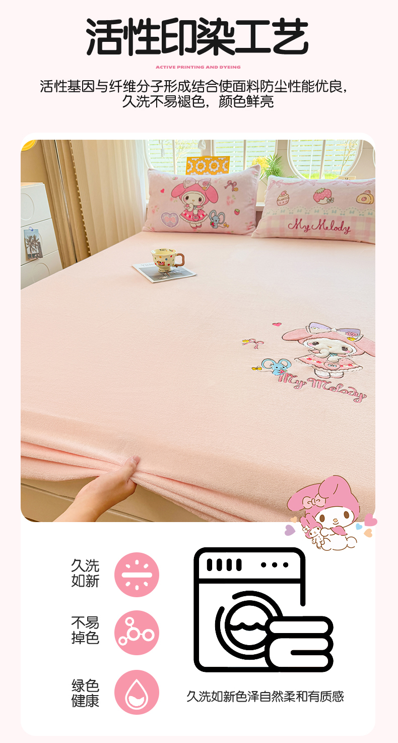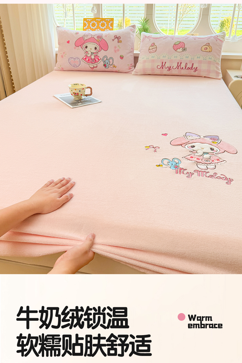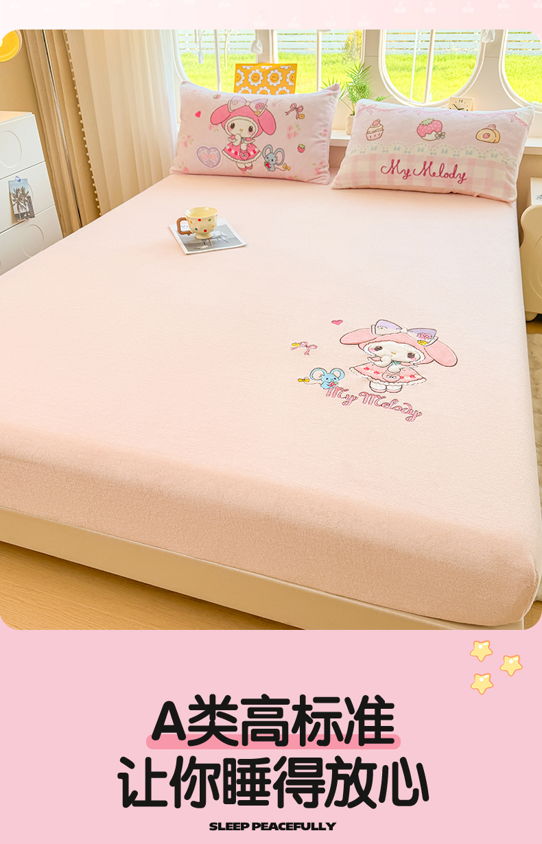 雯豆家纺 正版授权IP纯色贴布绣牛奶绒床笠三件套加厚卡通床垫保护套 美乐蒂