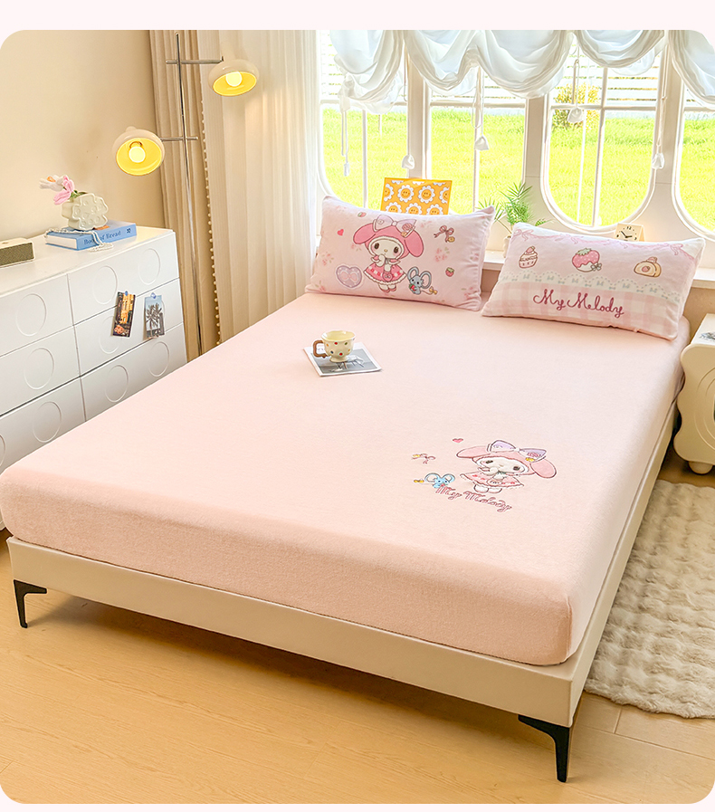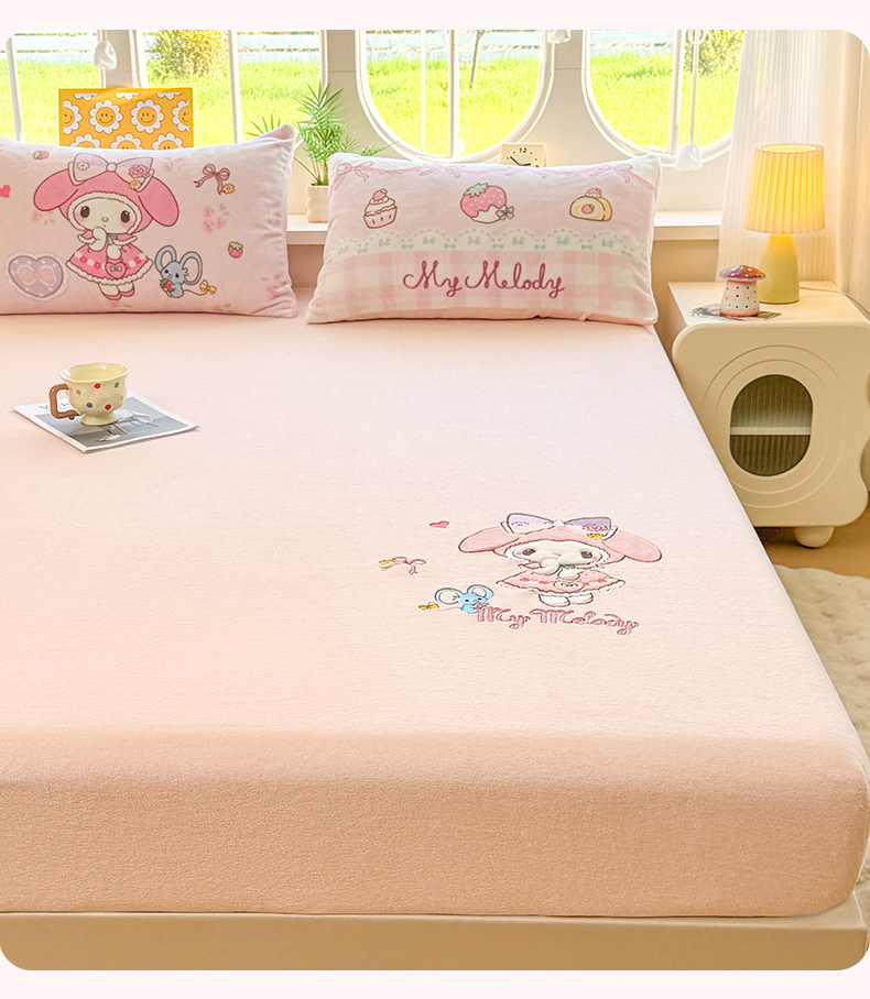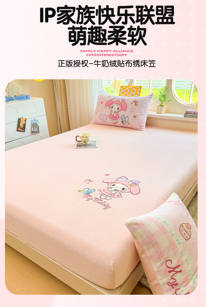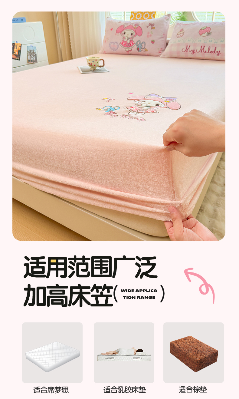 雯豆家纺 正版授权IP纯色贴布绣牛奶绒床笠三件套加厚卡通床垫保护套 美乐蒂