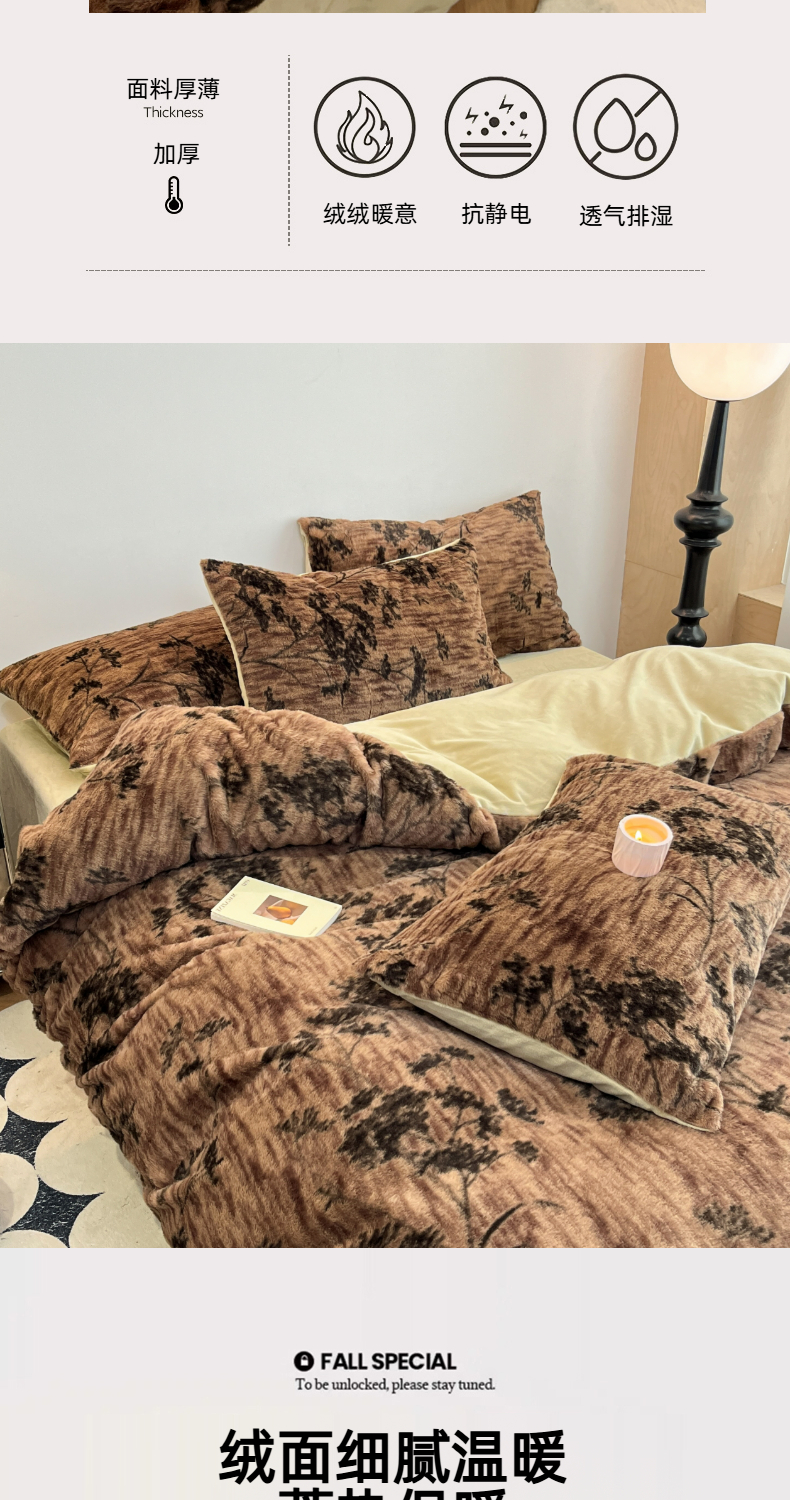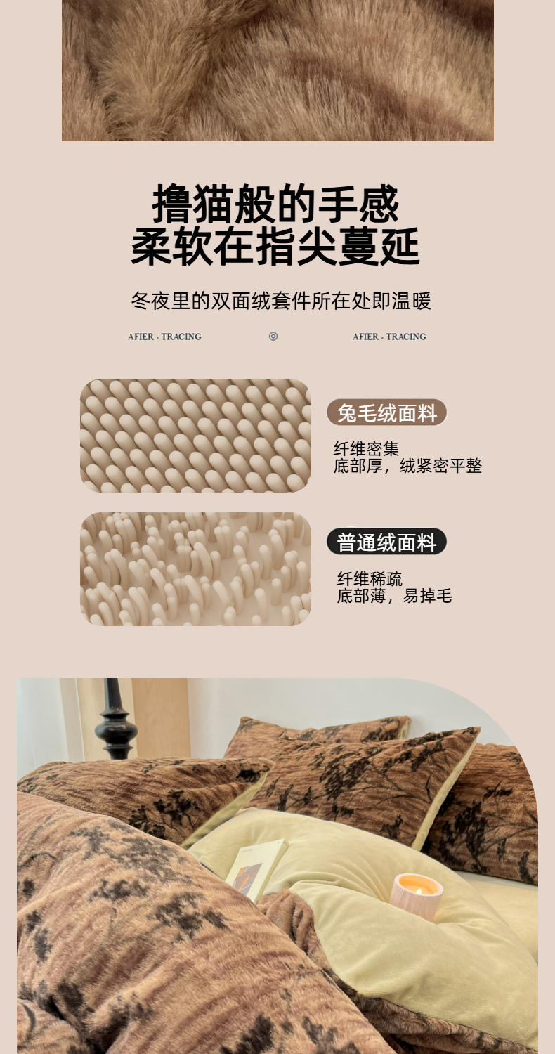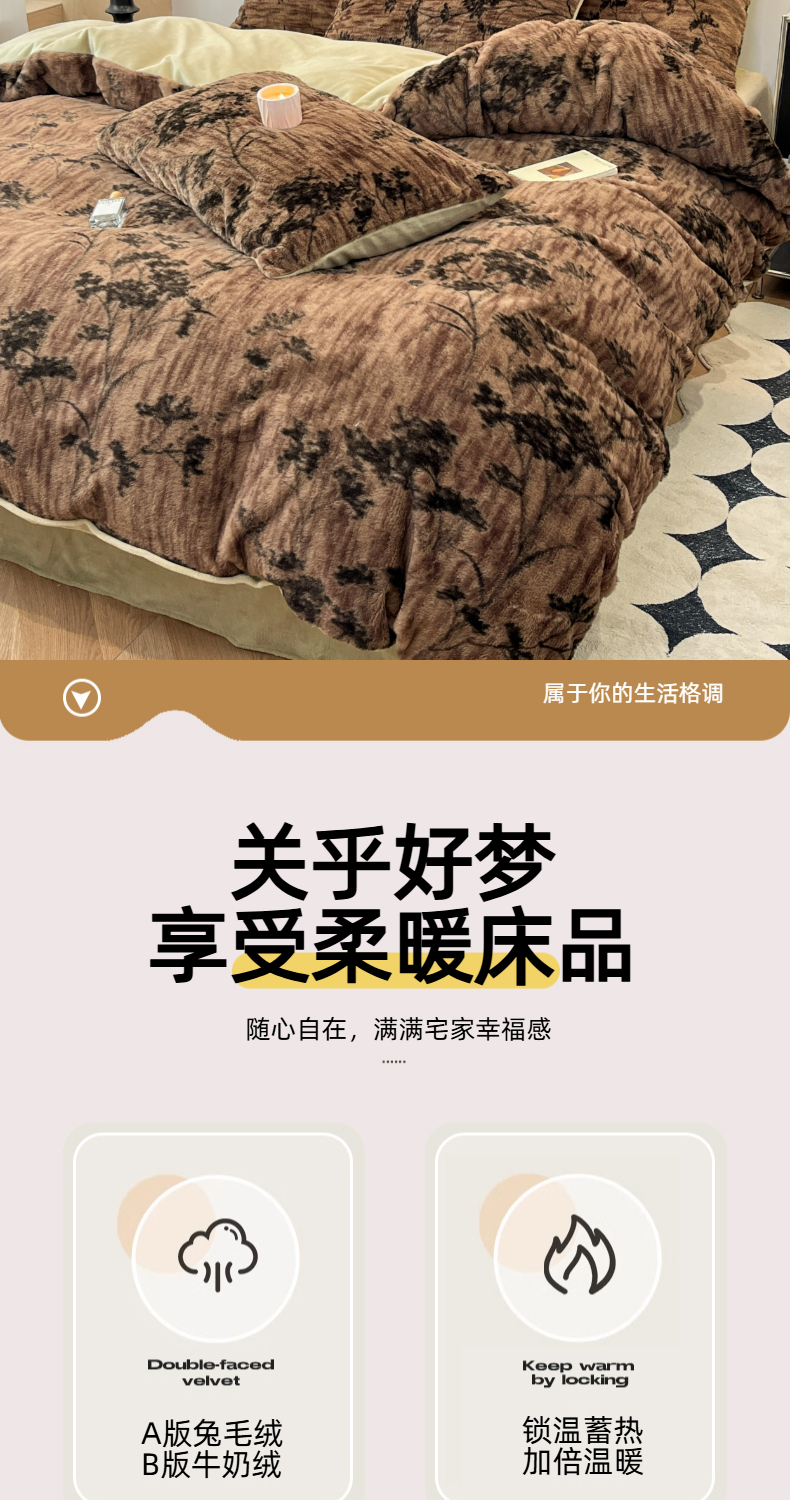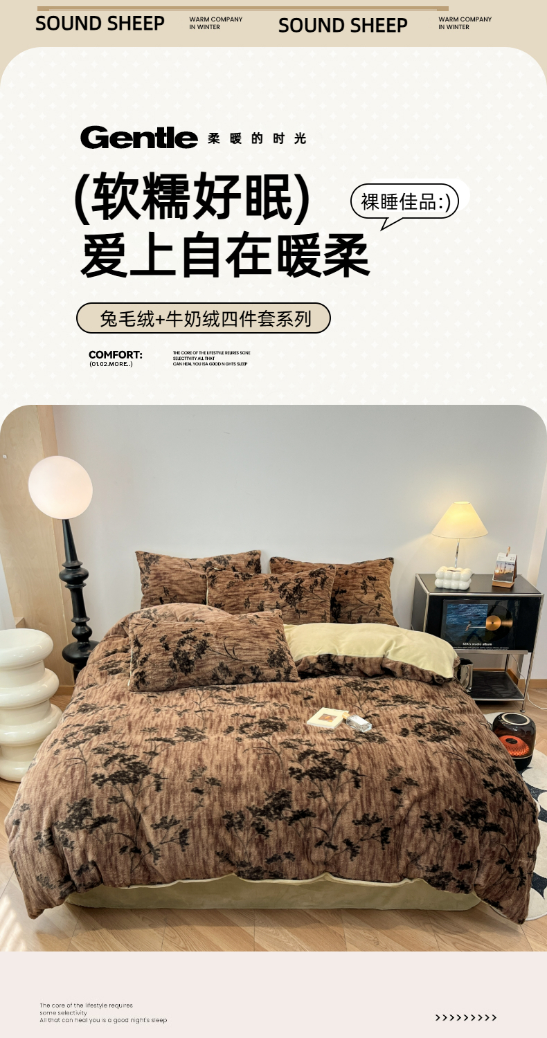 商品名称:金爱家 2025新款全消光牛奶绒A类赫本风纯色獭兔毛绒立体牛奶绒四件套 兔毛-树枝棕色