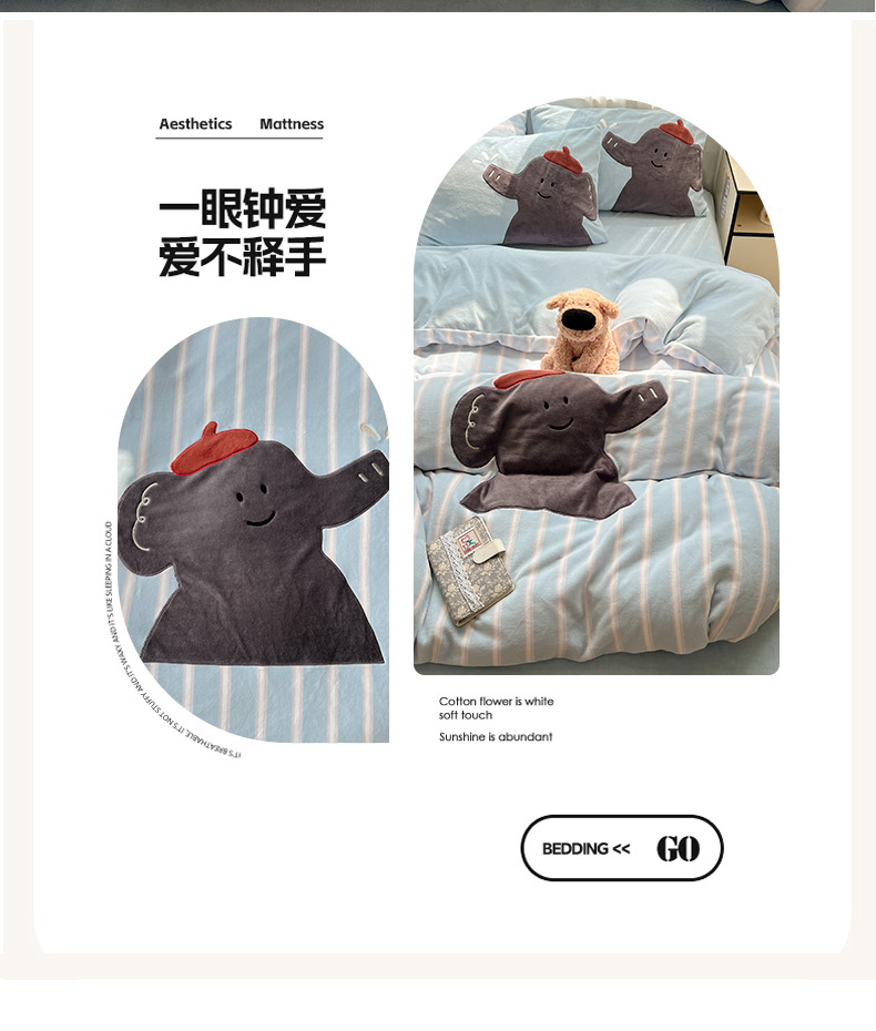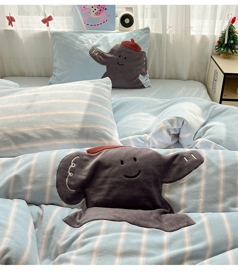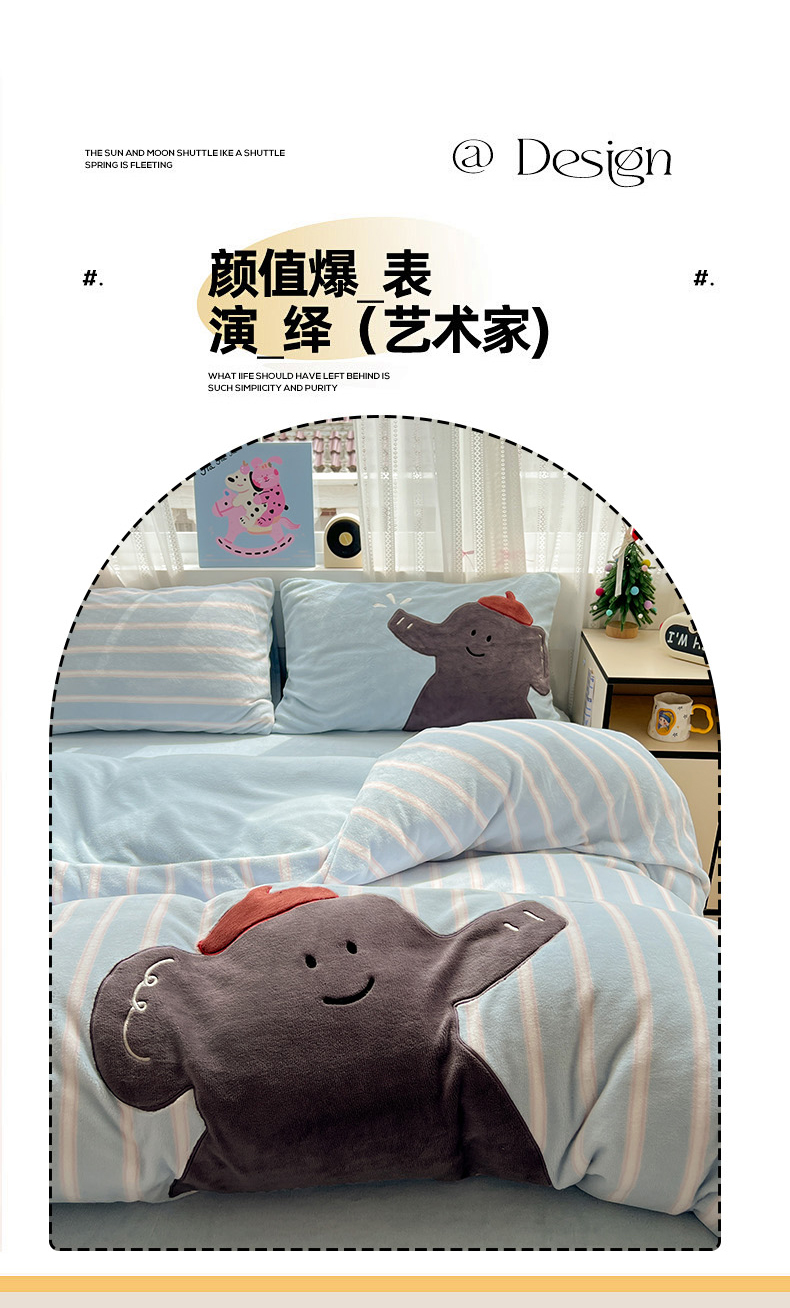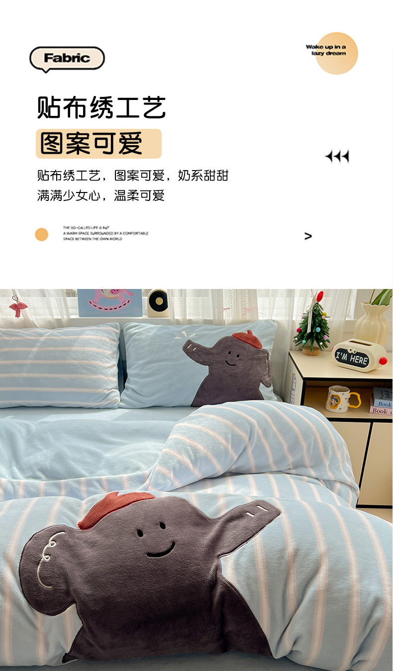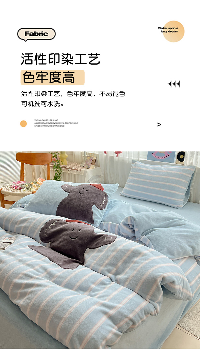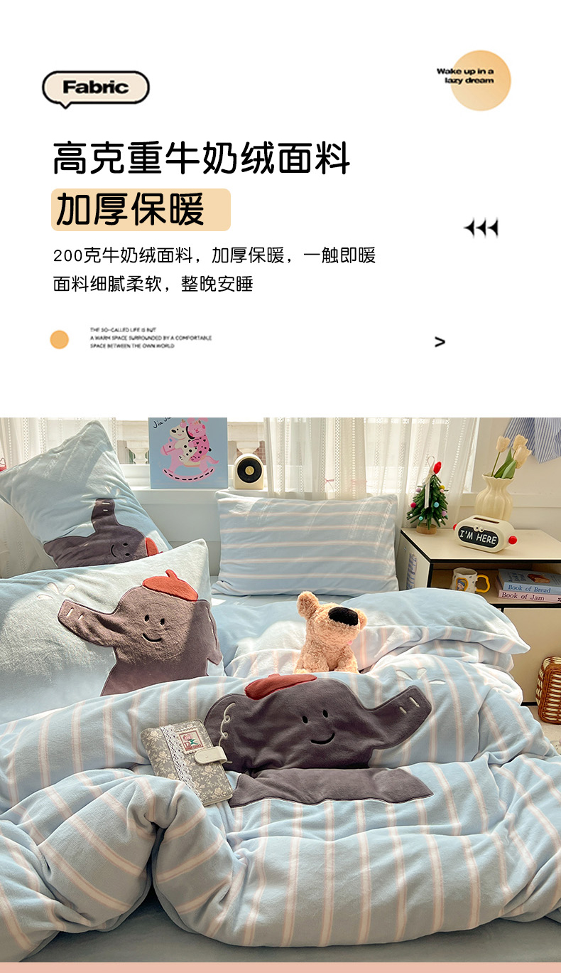 当前位置: 91家纺网 > 商品网购 > 床品套件 > 四件套 > 牛奶绒四件套 > 忆生活 2025新款秋冬高克重牛奶绒贴布绣四件套 条纹小象-蓝