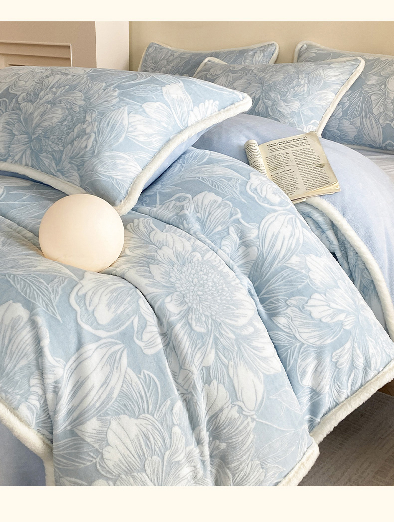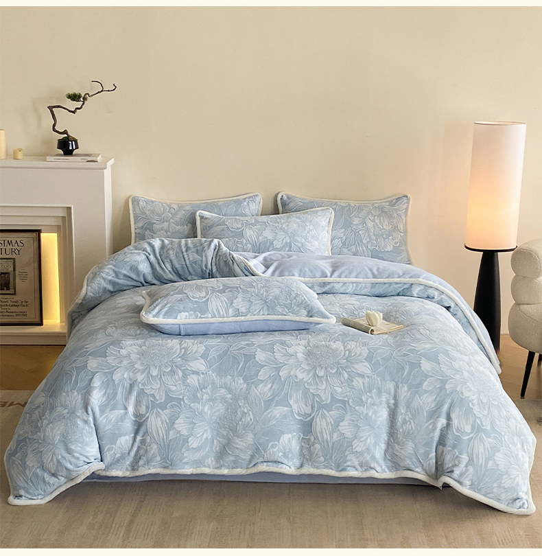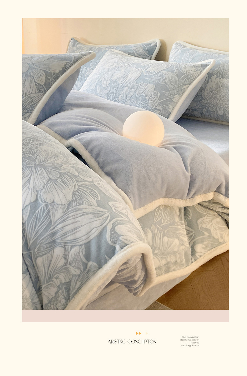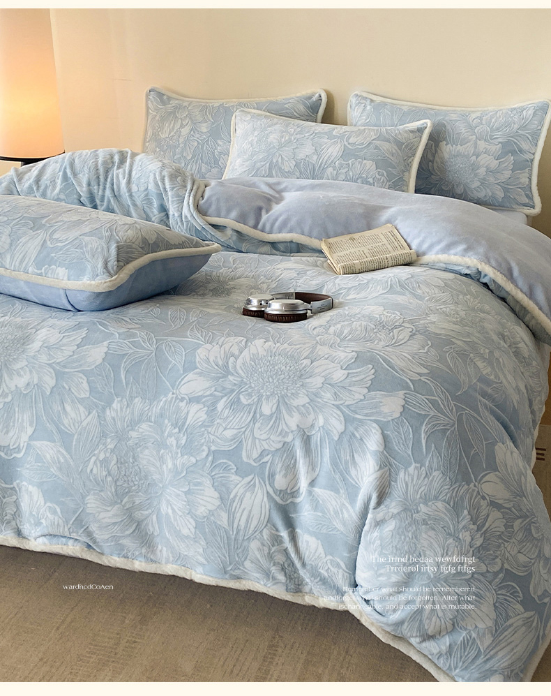 绘萱家居 2025新款爆款高密消光包边雕花牛奶绒四件套立体5D 牡丹花开-蓝