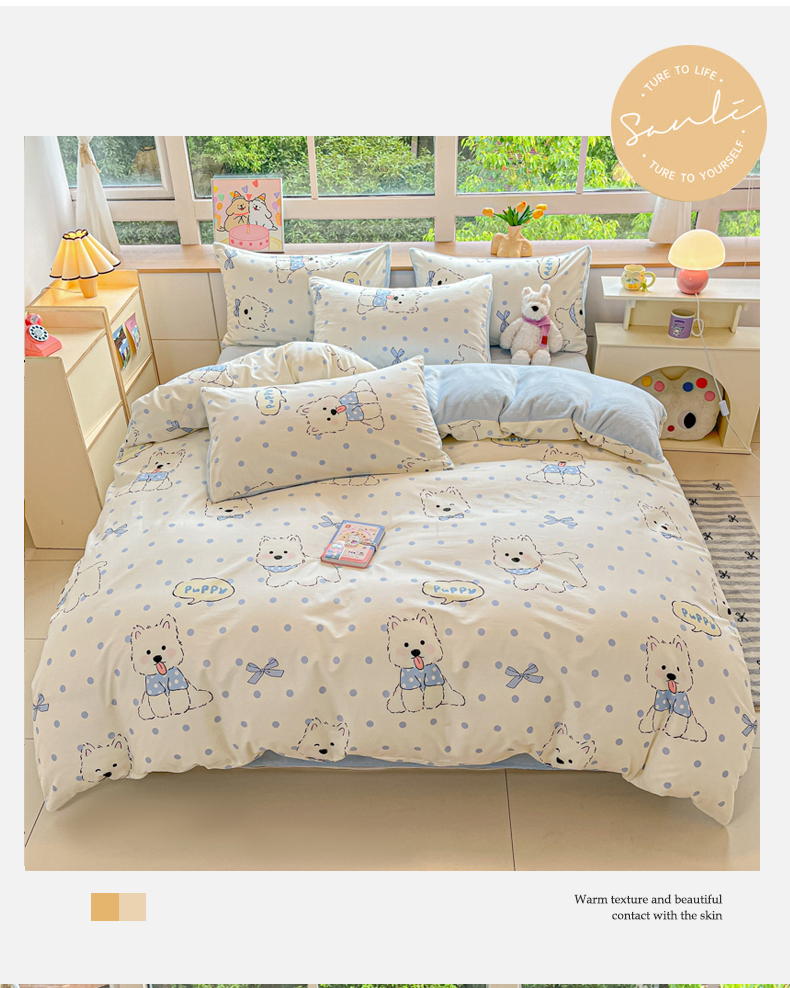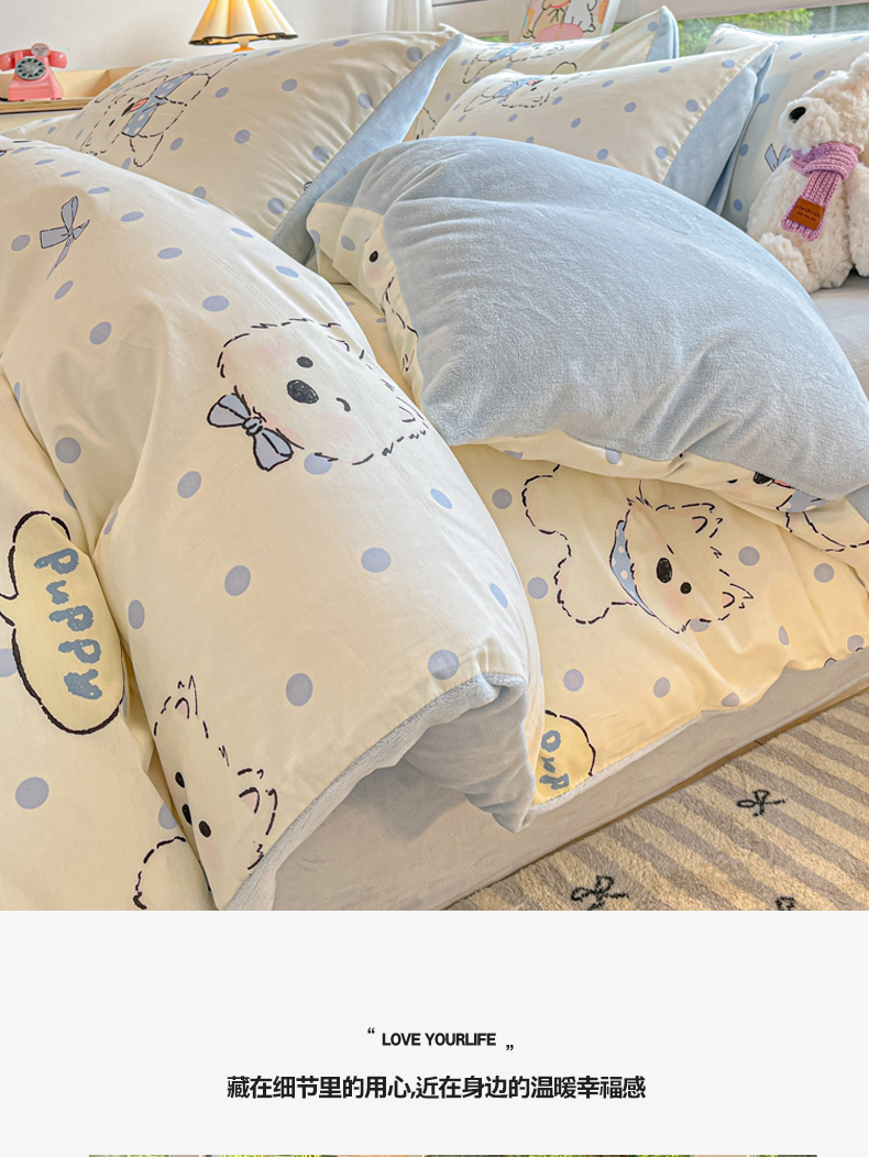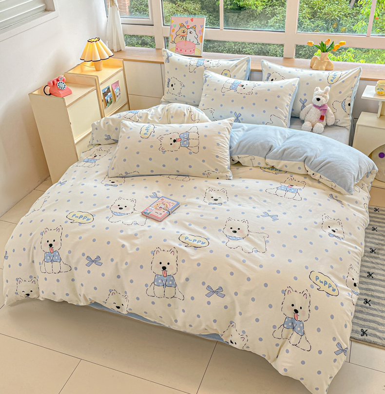 当前位置: 91家纺网 > 商品网购 > 床品套件 > 四件套 > 牛奶绒四件套 > 麦伦家居 2025秋冬新款多功能床品全棉+牛奶绒印花四件套 波点狗